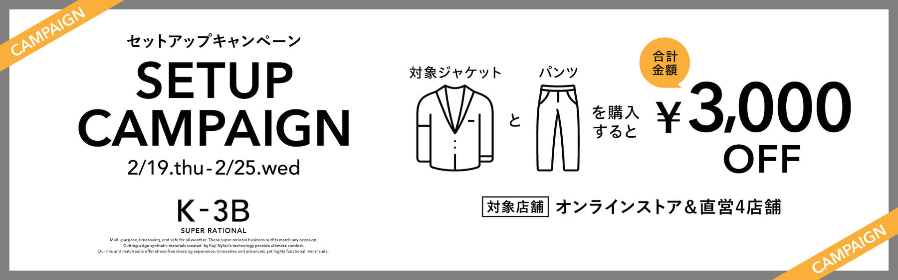 対象のジャケット1着とパンツ1本を同時にご購入いただくと、税込の商品代金合計が3,000円OFFになります。この機会をお見逃しなく!