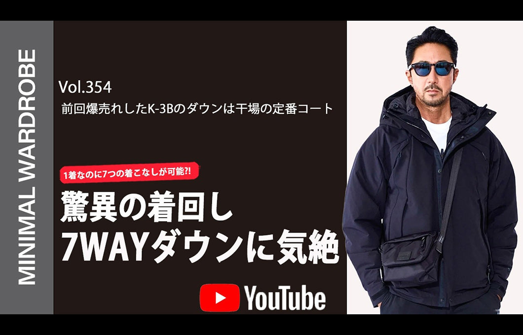 MINIMAL WARDROBEチャンネル第354回目、「【7つの着こなしが可能】即売れしたK-3Bのダウンコートは7WAYでオールシーズン着用可能!干場の定番アイテム」で、K-3B製品をご紹介いただきました。