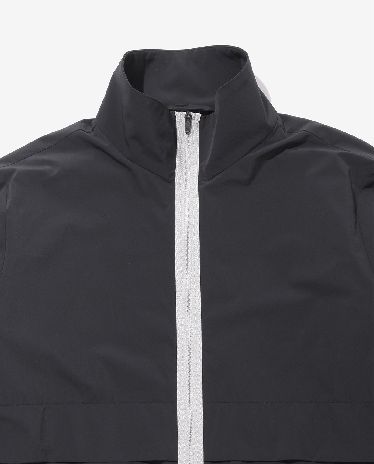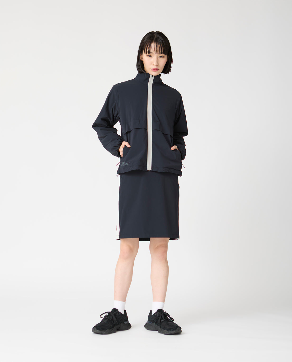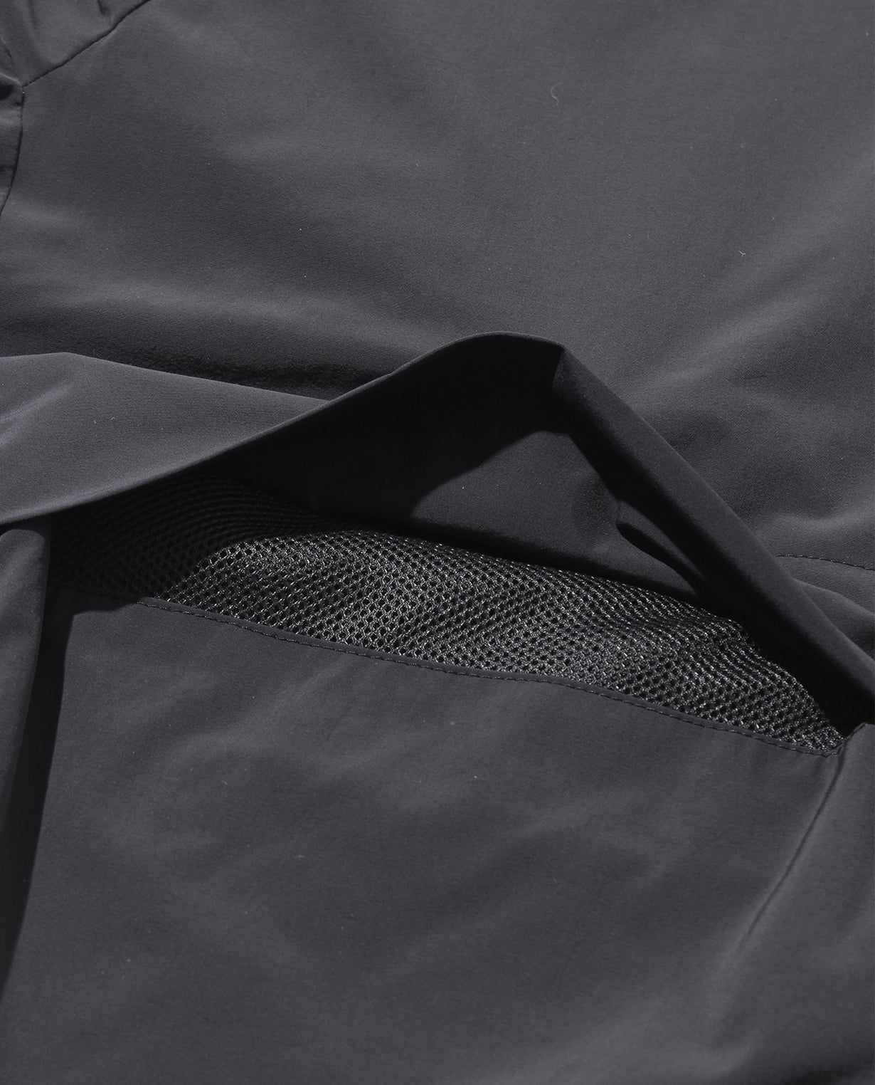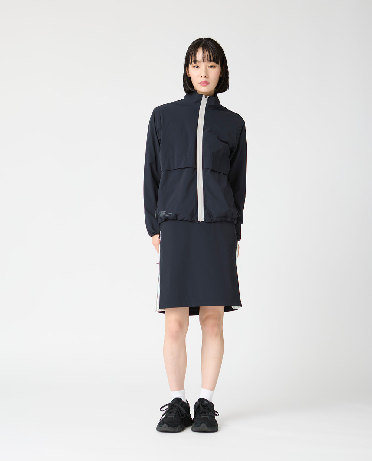 ■ 素材表地には、経糸・緯糸ともにポリウレタン混の糸を使用した4WAYストレッチ素材の「R生地」を採用。フルダル糸によるマットでフラットな質感と、パウダータッチの柔らかな手触りが特徴です。全方向に伸縮することで、スポーツシーンにも対応する軽量かつ耐久性に優れた布帛(ふはく)生地です。