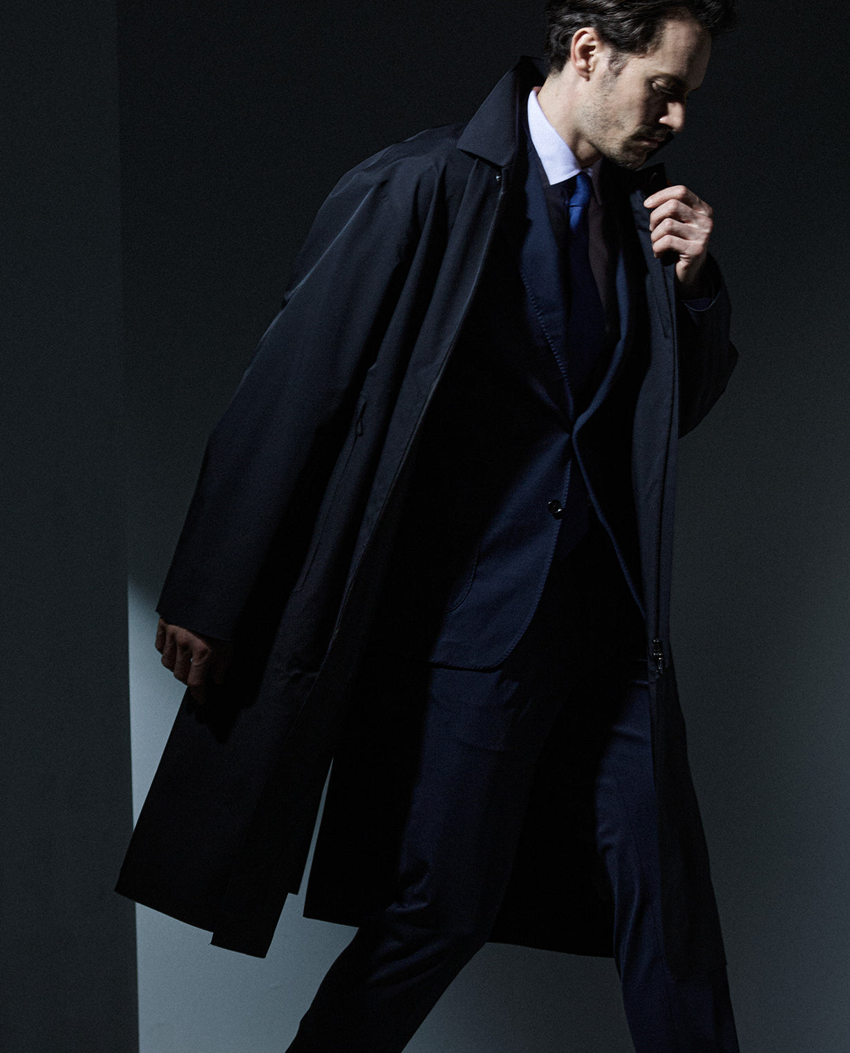 ■ コンセプトクラシックなステンカラーコートをベースに、現代の都市生活に合わせて再解釈したシンプルでムダのないデザイン。ややワイドな身幅でジャケットスタイルにもすんなりと馴染み、羽織るだけで「今」のシルエットとなります。完全防水のフルシーム仕様で表に見えるミシンステッチがほとんどなく、技術に裏打ちされたミニマリズムが着る人の品格を高めます。■ 素材と縫製耐水圧20,000mm、透湿性6,000g/m²/24h(JIS L 1099 B1法)というハイスペックな3レイヤー透湿防水生地を採用。薄くて軽い晴雨兼用のナイロンツイルは、その機能性とともにマットでエレガントな風合いが特徴です。ミシン縫いと熱圧着加工の両方を高水準のクオリティで仕立てられる縫製工場は非常に限られるため、生産背景も厳選しています。■ デザインフロントは首元の1か所だけがボタン留め、前立ての中は止水ファスナーあき。着脱が容易なうえ、クリーンで先進的な印象を与えます。前身頃の肩線はノーマル、後ろ身頃は腕が動かしやすい斜め切替えのスプリット・ラグラン袖。胴体部分は3Dカッティングによる身体に沿った筒のような造形で、通常とは違う位置に切替線が走っているため、美しいシルエットを描きます。切替線を利用して差し込んだ大きな腰ポケットは止水ファスナー付きの防水仕様、存在感を消すように共布の口布でカバリングしています。袖口にはあえてボタンやタブを付けず、非常にシンプル。その分、外袖側を台形に長くして手首からの雨を避けつつ、手首の曲げやすさは確保。表に縫い目の出ない圧着見返し仕立て。あらゆる細部に技巧を凝らしながらもそれを感じさせないミニマルな仕立ては、素材の良さと着る人の個性をマキシマイズするため。透湿防水性や防風性といったハイスペックを満たしながら、着る人の気配まで美しく映し出す。この相反する要素の両立こそ、K-3Bの目指す"次世代ラグジュアリー”です。■ モデル着用画像183cm 2/3(L/LL)サイズ