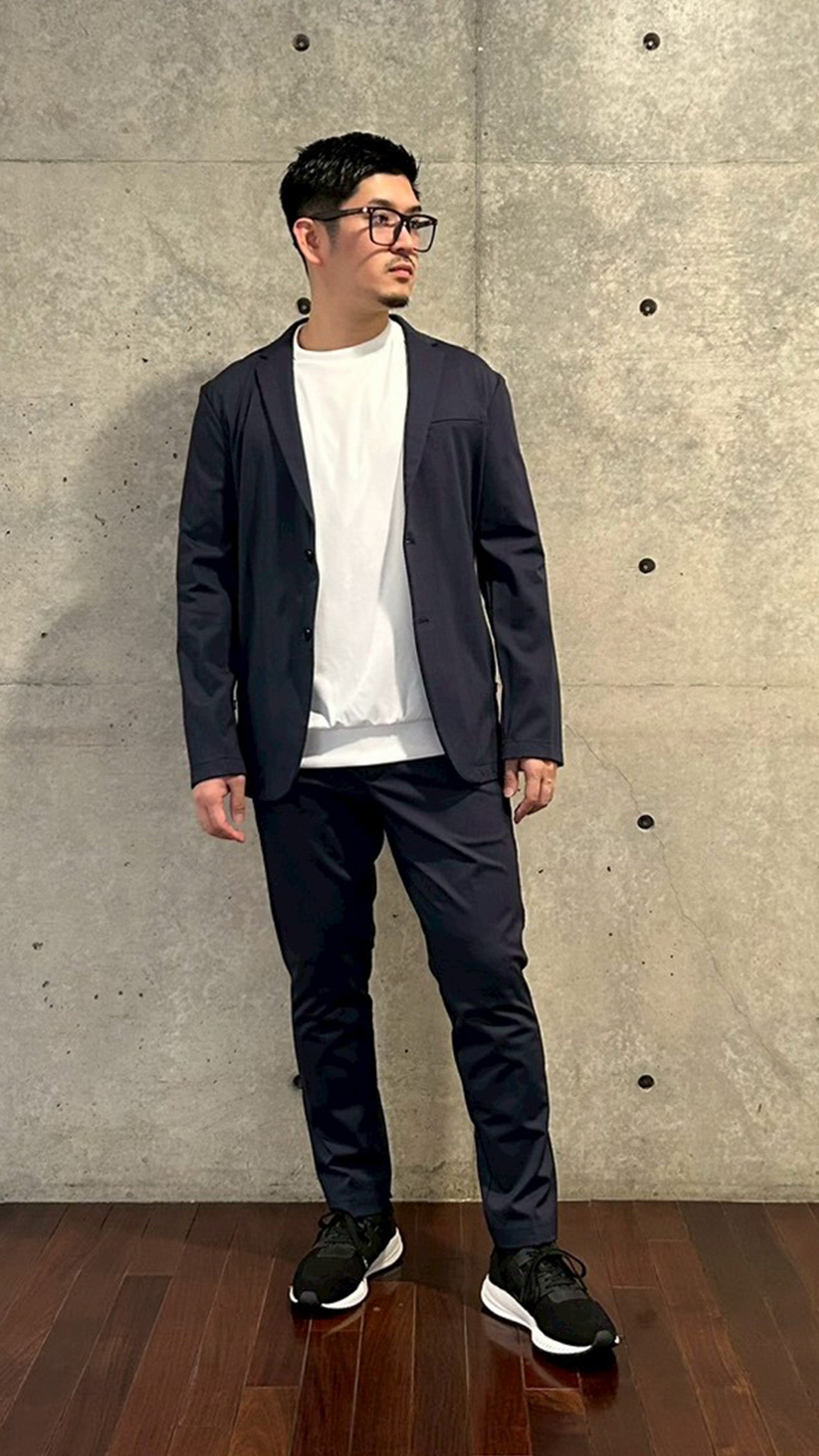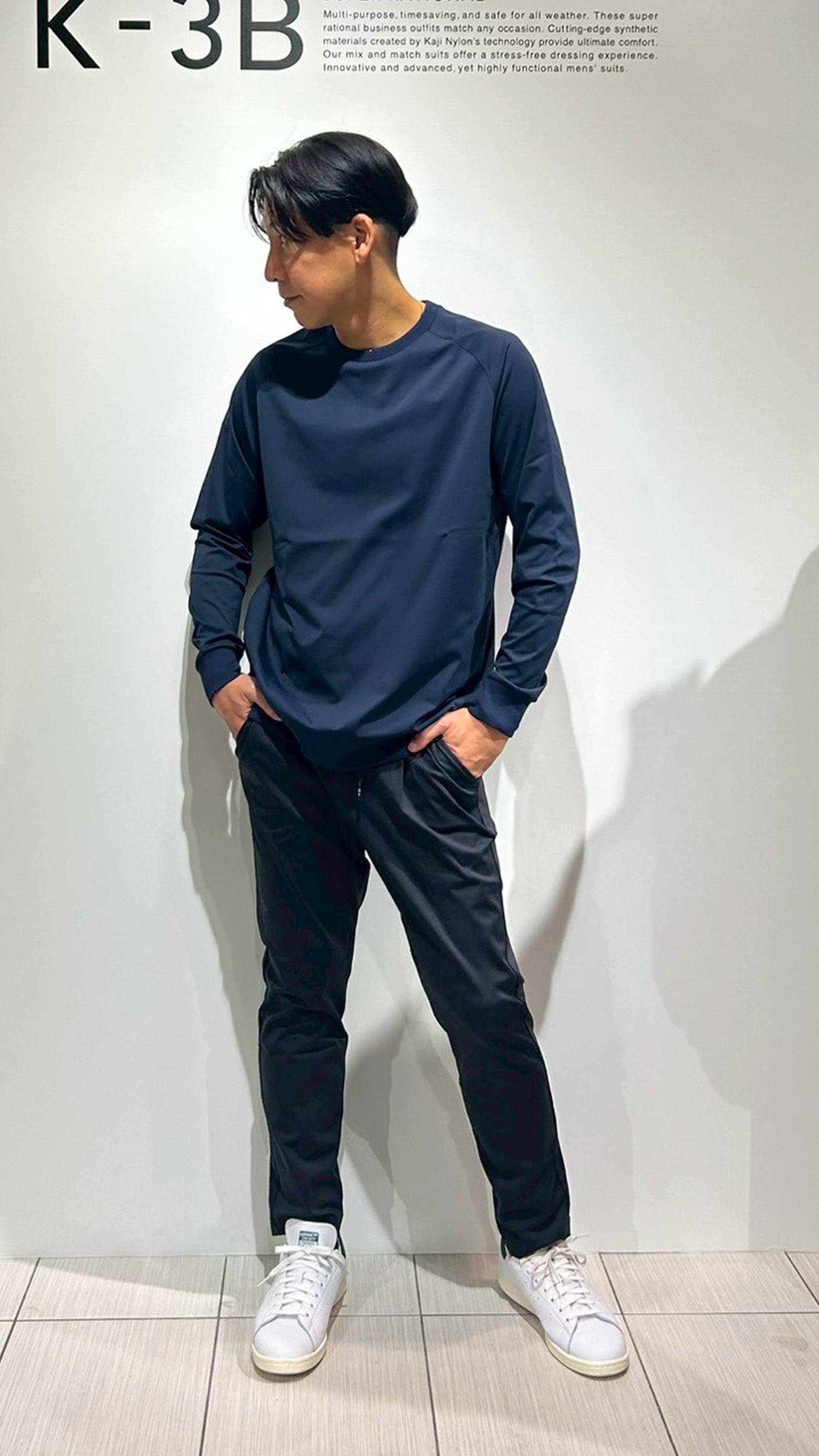 ■ 素材「24HR-WEARABLE(24時間着ていたい)」をコンセプトにした本シリーズには、石川県発のテキスタイルブランド「KAJIf(カジフ)」の生地を採用。ハイゲージダブルニットで編み上げられたN生地は、滑らかで柔らかい肌触りと、身体の動きにしなやかに追従するハイパワーストレッチ性が特徴です。マットで美しい表面は高密度ならでは。さらに、撥水加工も施されており、急な天候変化にも対応可能です。合成繊維の持つ機能性と取り扱いやすさを活かしながら、上質感を備えています。■ デザインジャケット(002_N)とパンツ(107_N)から成る「The シグネチャー・セットアップ」は、“これを着ておけば間違いない”という安心感を提供する、K-3Bを代表する王道セットアップ。パンツは腰まわりにゆとりを持たせたワンタック仕様で、裾に向かって美しくテーパードするシルエットが大人のスマートさを演出します。右ポケットにはアイコン的存在のZipコインケース付き。ジャケットは、合成繊維では難しいとされてきた立体的なフォルムを、熟練職人による熱加工技術とテーピング加工で実現。さらに、大見返しという贅沢な仕様を取り入れることで、ラペルの返りや胸元の立体感が際立ち、よりリッチで本格的なドレス感を感じられるクラシカルな仕立てになっています。■ コーディネートカジュアルとドレスの中間を行く絶妙なシルエットは、Tシャツとスニーカーを合わせてデイリーに、シャツや革靴と合わせればビジネスシーンに対応。撥水性とストレッチ性を備えているため、長時間の移動や出張、アクティブな一日でも快適に過ごせます。どんなシーンにもフィットする「The シグネチャー・セットアップ」は、まさに現代のワードローブに不可欠な一着です。■ 同じ生地のセットアップを見るN生地■ 同じ生地のアイテムを見るN生地