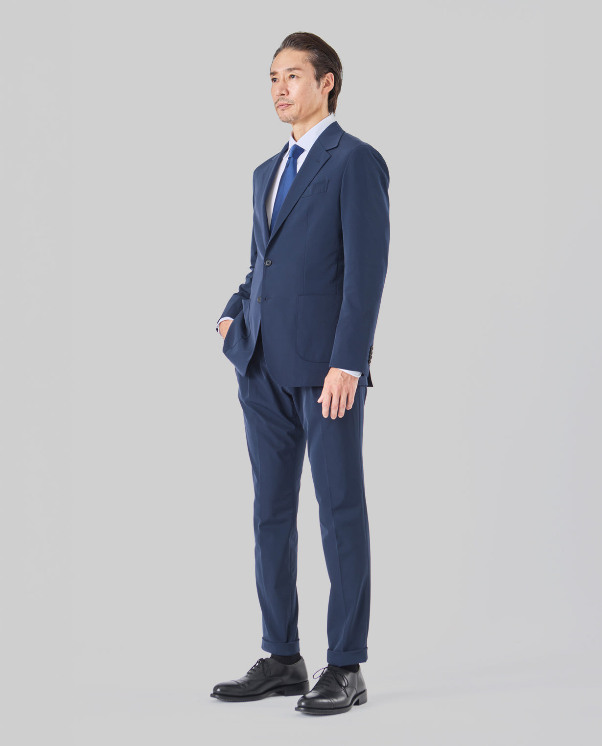 ■ コンセプトエグゼクティブのために、あらゆる公式なビジネスシーンに通用する装いとして設計された本格仕様のテーラードジャケット。ナイロン素材であることを忘れるほど表情は静かで品格があり、仕立てはミニマルでいて精緻。K-3Bと名門スーツファクトリーの共同開発によって誕生した、新時代のラグジュアリーウェアです。■ 素材と縫製この「X生地」は、EXECUTIVEラインのために自社開発した2025年登場の新素材。ナイロン織物とは思えない奥行きのあるリッチなテクスチャーとストレッチ性や肉厚感が特徴で、美しいシルエットをいつでもキープするのに身体の動きを妨げない伸びのよさ。ラグジュアリーなルックスと着心地を同時にもたらします。ツイル織りの組織は柔らかく深いツヤ感があり、シワになりにくい性質も併せ持ちます。ナイロンならではの耐久性に加えて撥水性も付与し、最先端の高機能素材が完成しました。縫製は、日本におけるテーラードスーツ製造の名門「東和プラム」が担当。合繊では難しいとされる立体感や衿とラペルの精緻な返り、肩の丸みの表現を完璧にこなし、着やすさと美しさの両立を実現しています。東和プラムの長い歴史の中で今回初めて、合繊100%のストレッチ素材を使ったスーツを開発していただきました。■ デザインと仕様クラシカルでタイムレス。飽きのこない形状の衿や優雅なサイドベンツなど、長く愛用していただける王道のディテールを取り入れつつ、生地の特性や多忙なビジネスパーソンの生活形態を考慮に入れた独自のパターン設計。着る人の身体の動きにしなやかに寄り添いながら、端正なフォルムを保ちます。ジャケットの良し悪しを決める肩まわりや袖付けの構築的な立体感は、芯材やアイロンに頼らず、熟練職人の手加減で一着一着丁寧に調整しながら縫うことによって形作られています。本格仕立てジャケットの証となるAMFステッチ(ラペルや身頃の端に施す、手縫い風の点状の縫い)は、一般的には合繊素材だと技術的に実現が困難とされています。この製品では、衿周りのみならずポケット、袖や身頃の切替線にまで手間のかかる細幅のAMFステッチ入りとし、形状保持と重厚な印象をプラス。また薄くて軽いのに胸板の厚みをしっかり形作る大見返しや、通常なら天然素材にしか見られないような縫代端の処理など、ジャケットを裏返して観察しても隅々まで隙のない美意識に貫かれており、合繊スーツの到達点とも言うべき完成度となりました。セットアップ用に179_Xドレスパンツをご用意しています。■ モデル着用画像183cm 2(L)サイズ