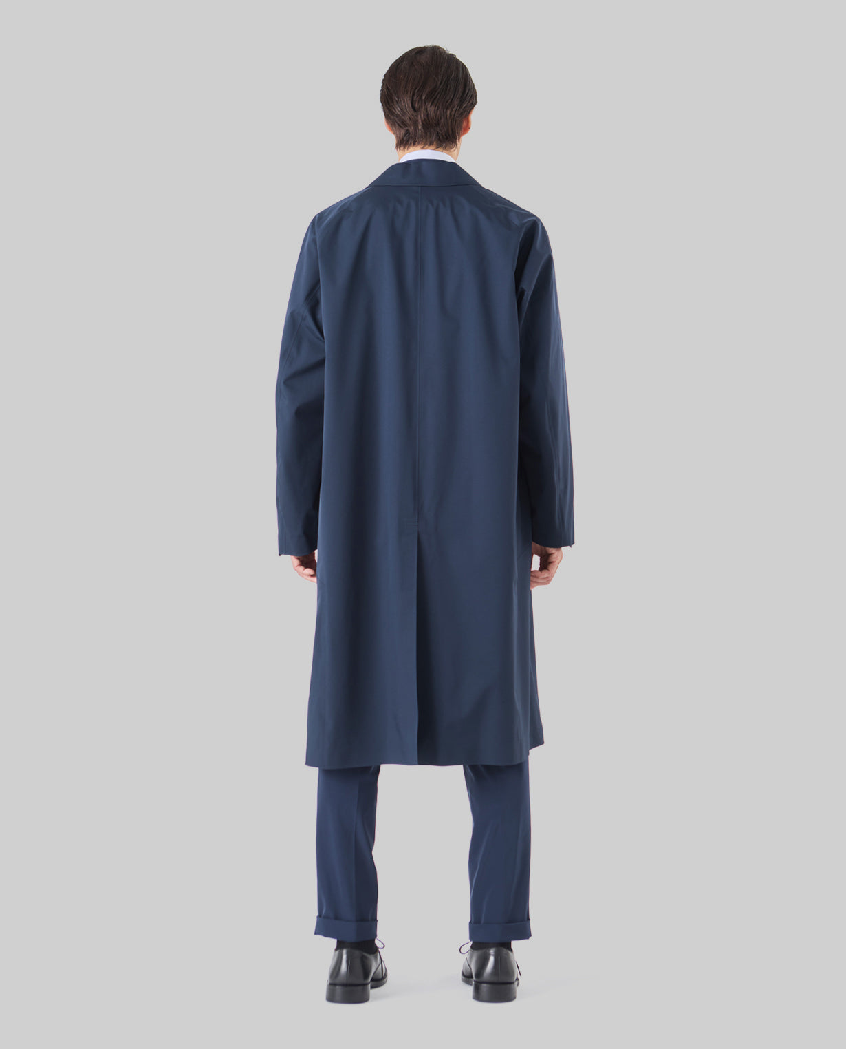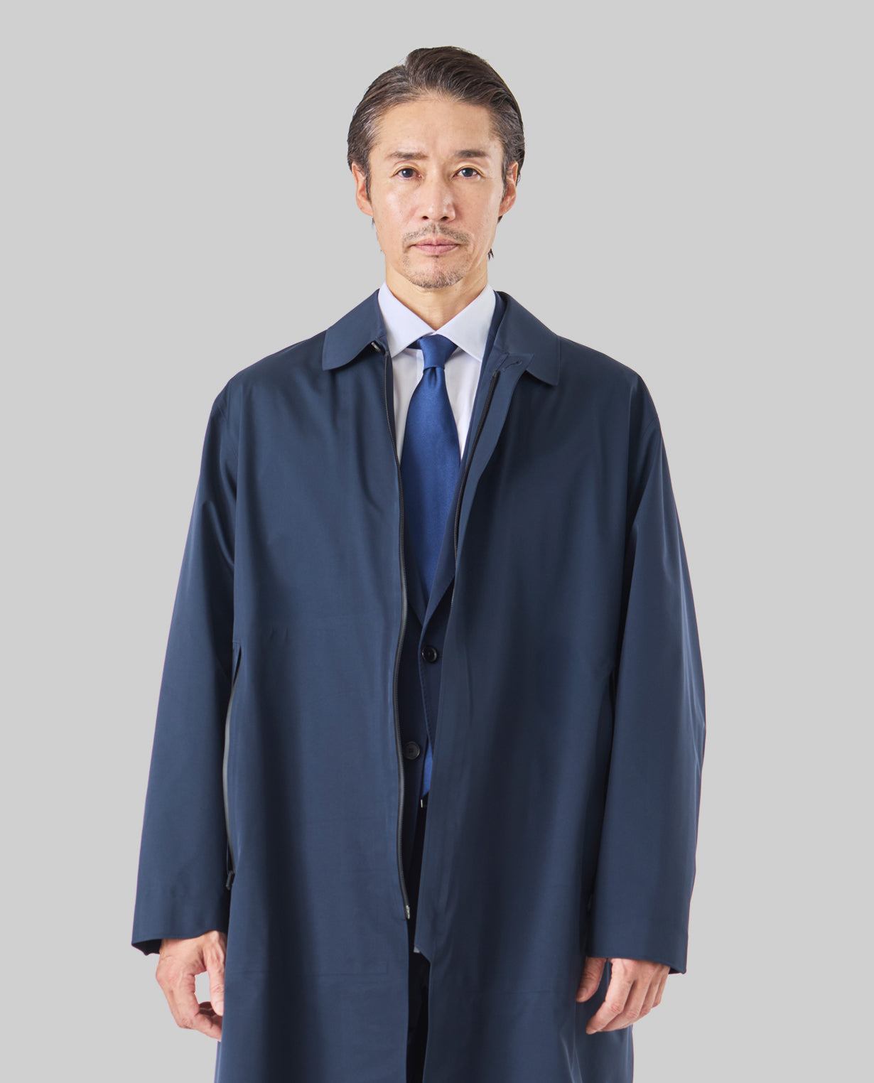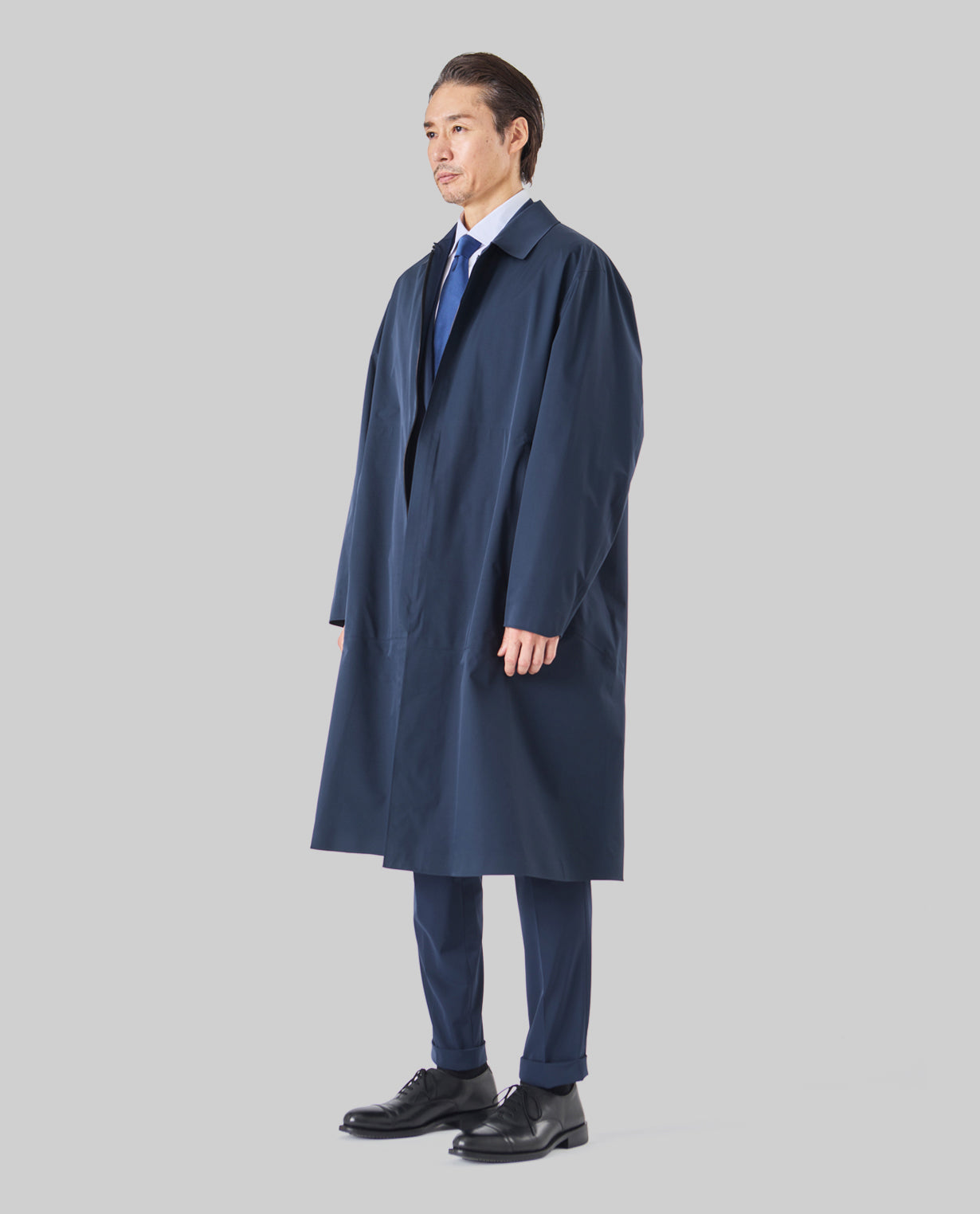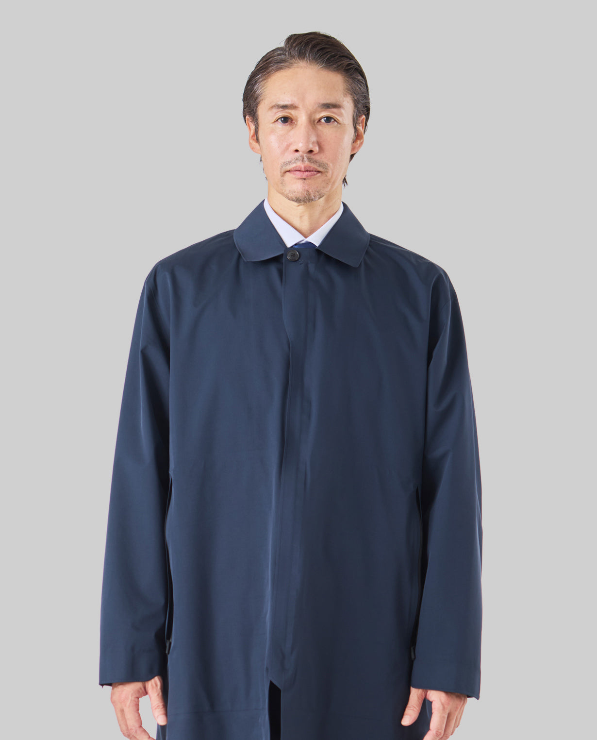 ■ コンセプトクラシックなステンカラーコートをベースに、現代の都市生活に合わせて再解釈したシンプルでムダのないデザイン。ややワイドな身幅でジャケットスタイルにもすんなりと馴染み、羽織るだけで「今」のシルエットとなります。完全防水のフルシーム仕様で表に見えるミシンステッチがほとんどなく、技術に裏打ちされたミニマリズムが着る人の品格を高めます。■ 素材と縫製耐水圧20,000mm、透湿性6,000g/m²/24h(JIS L 1099 B1法)というハイスペックな3レイヤー透湿防水生地を採用。薄くて軽い晴雨兼用のナイロンツイルは、その機能性とともにマットでエレガントな風合いが特徴です。ミシン縫いと熱圧着加工の両方を高水準のクオリティで仕立てられる縫製工場は非常に限られるため、生産背景も厳選しています。■ デザインフロントは首元の1か所だけがボタン留め、前立ての中は止水ファスナーあき。着脱が容易なうえ、クリーンで先進的な印象を与えます。前身頃の肩線はノーマル、後ろ身頃は腕が動かしやすい斜め切替えのスプリット・ラグラン袖。胴体部分は3Dカッティングによる身体に沿った筒のような造形で、通常とは違う位置に切替線が走っているため、美しいシルエットを描きます。切替線を利用して差し込んだ大きな腰ポケットは止水ファスナー付きの防水仕様、存在感を消すように共布の口布でカバリングしています。袖口にはあえてボタンやタブを付けず、非常にシンプル。その分、外袖側を台形に長くして手首からの雨を避けつつ、手首の曲げやすさは確保。表に縫い目の出ない圧着見返し仕立て。あらゆる細部に技巧を凝らしながらもそれを感じさせないミニマルな仕立ては、素材の良さと着る人の個性をマキシマイズするため。透湿防水性や防風性といったハイスペックを満たしながら、着る人の気配まで美しく映し出す。この相反する要素の両立こそ、K-3Bの目指す"次世代ラグジュアリー”です。■ モデル着用画像183cm 2/3(L/LL)サイズ