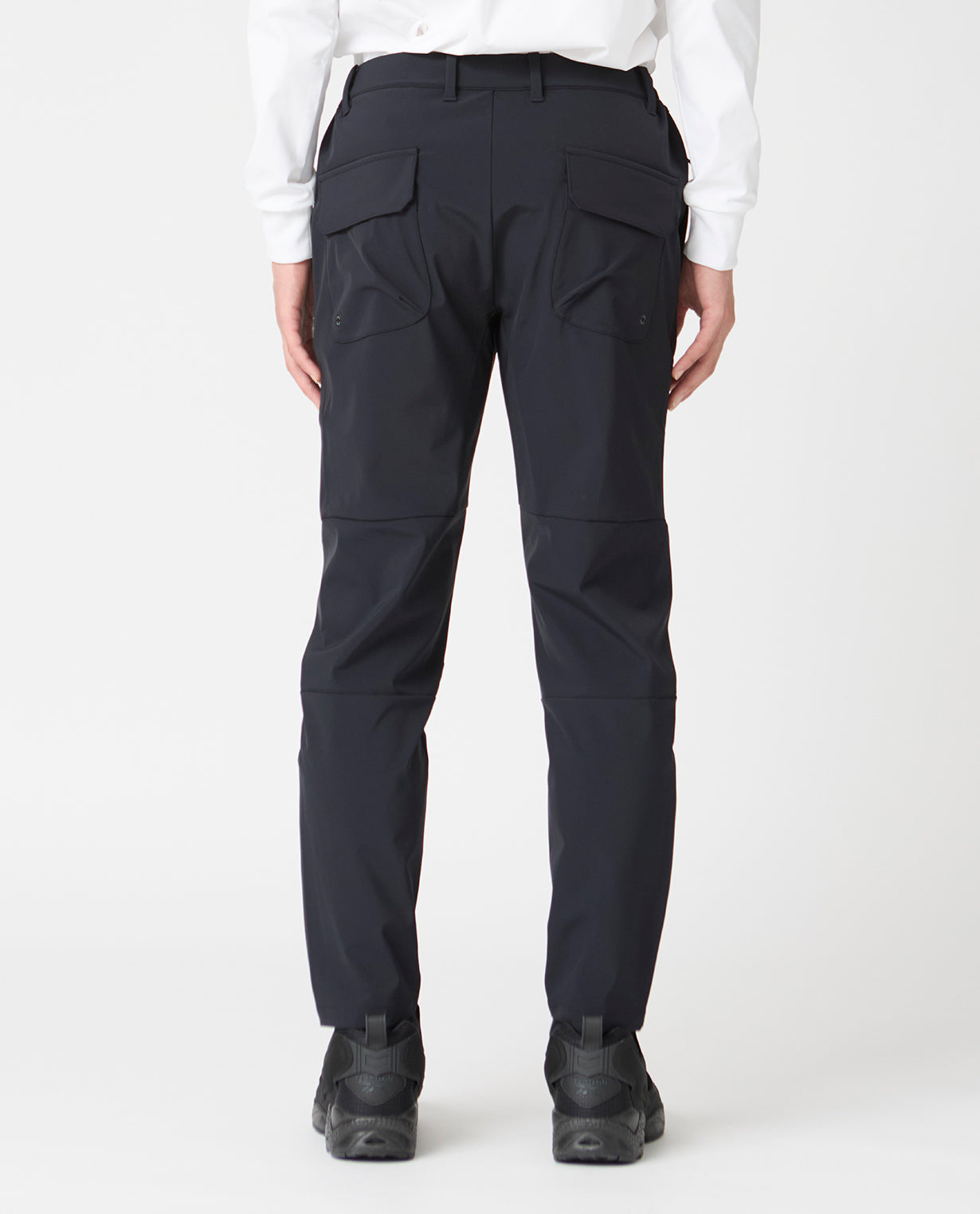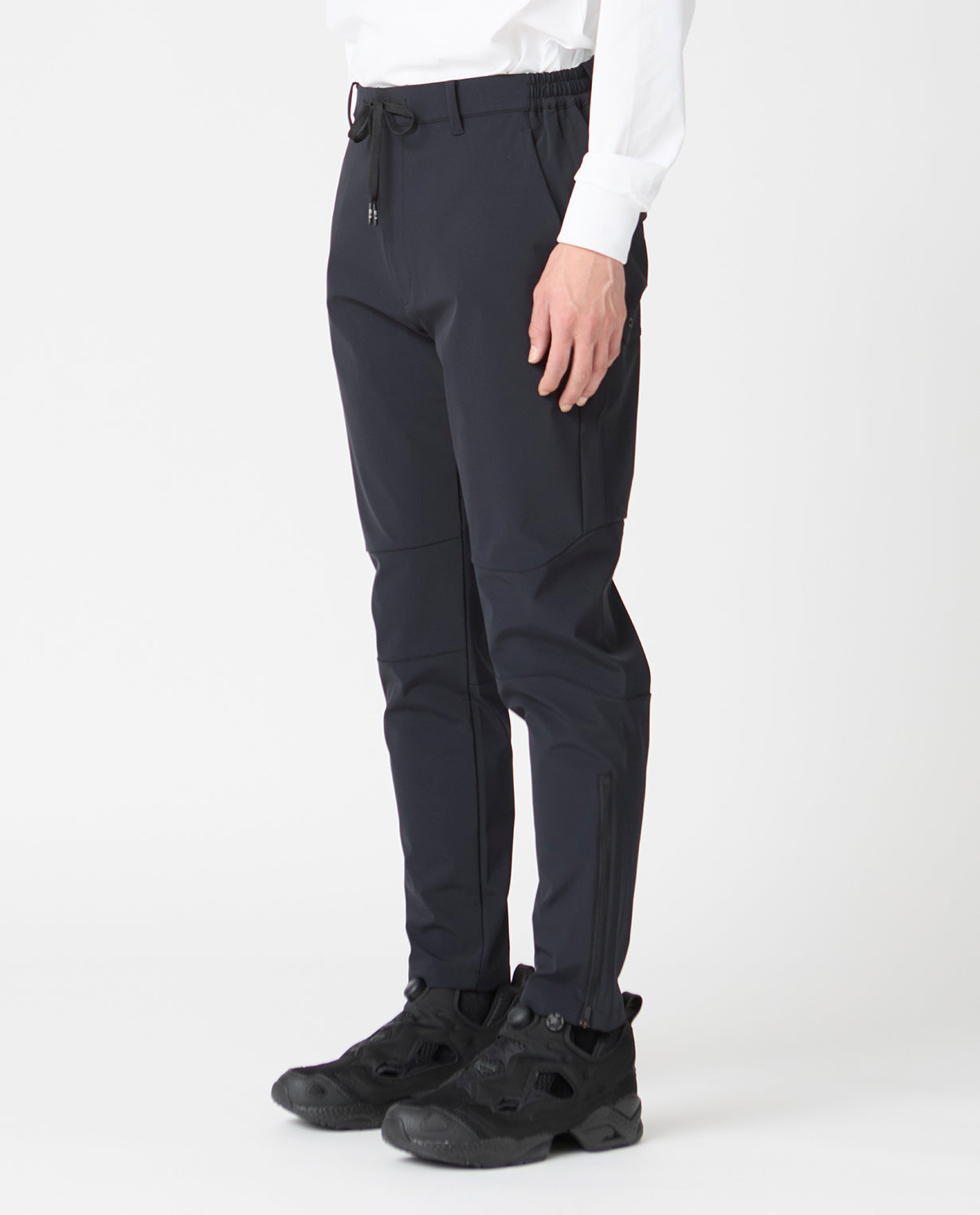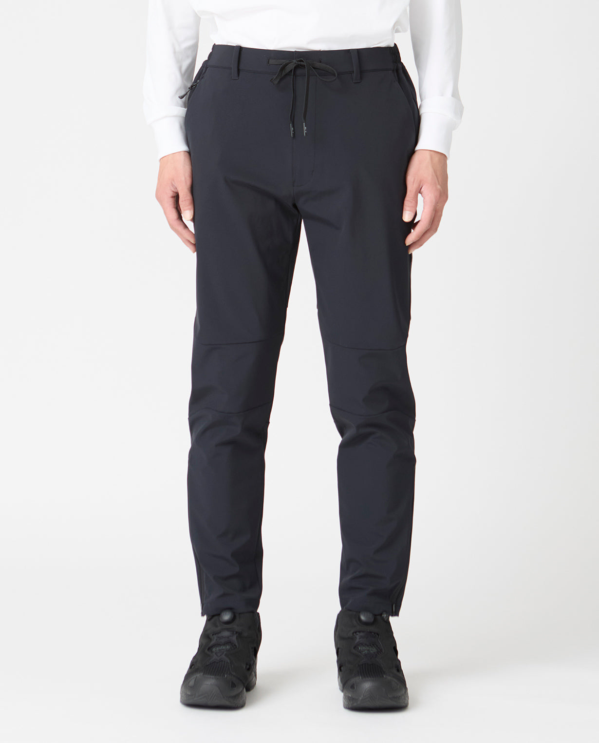 ■ 素材R生地は、経糸・緯糸ともにポリウレタン混の糸を使用した4WAYストレッチ素材。フルダル糸によるマットでフラットな質感と、パウダータッチの柔らかな手触りが特徴です。全方向に伸縮することで、スポーツシーンにも対応する軽量かつ耐久性に優れた布帛(ふはく)生地に仕上げています。今回はこのR生地に、別素材のニット生地と透湿防水フィルムをボンディング加工した3層構造のRB生地を採用。外側からの水の侵入を防ぎながら、内側の湿気を外に逃がす高い透湿防水性を実現しました。従来のR生地では対応しづらかった肌寒い季節でも、動きやすさはそのままに、雨風を防ぎながら快適な暖かさを保ちます。■ デザイン立体裁断(3Dカッティング)による複雑なパターン構成で、180度の開脚も可能な広い可動域を実現。横方向に切り替えた膝のパーツは屈伸動作をサポートし、膝抜けしにくい構造となっています。裾にはファスナーを配し、閉じればすっきりとしたテーパードシルエット、開ければ中から共布の当て布が現れストレートラインに。ハイカットのブーツやスニーカーの着脱をスムーズにする設計であると同時に、着こなしの幅を広げるディテールとしても機能します。ウエストは両脇ゴム仕様で、革ベルトとの併用も可能なベルトループ付き。内外どちらにも結べるドローコードを備えており、快適性と汎用性を両立しています。後ろポケットにはワンタッチボタン付きのフラップを配し、アクティブシーンでの安全性を確保。全体としてはスポーティな設計でありながら、無駄を削ぎ落としたクリーンなルックスでビジネスやゴルフ、ワークアウトから旅行まで、シーンを問わず活躍する一本です。■ スタイリング同じ生地の新商品の0_673_RBアクティブストレッチボンディングセットアップフルジップパーカとのセットアップとしての着用はもちろん、この肌寒くなる秋冬にかけての機能性パンツとしてぴったりの商品。