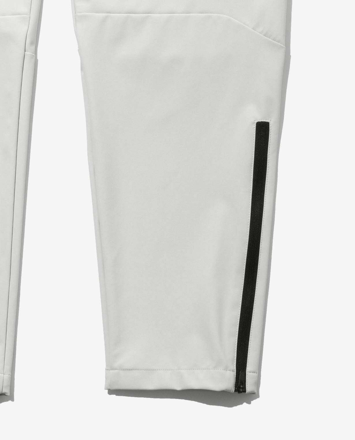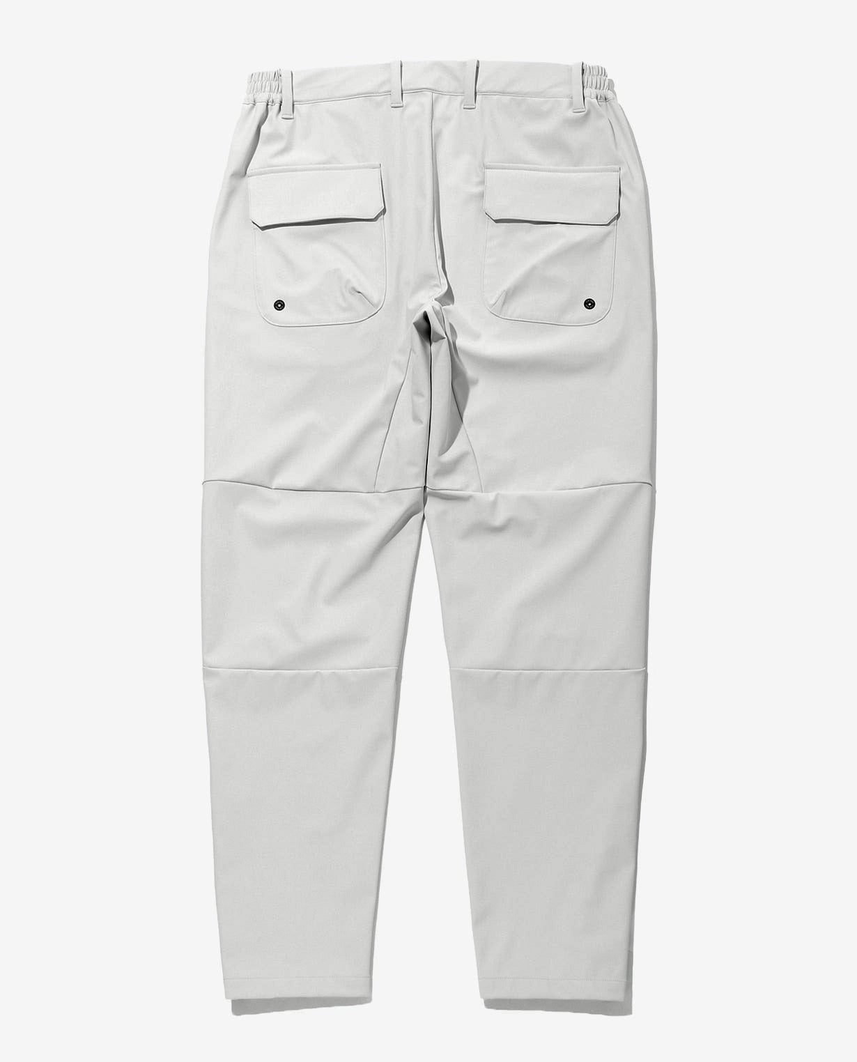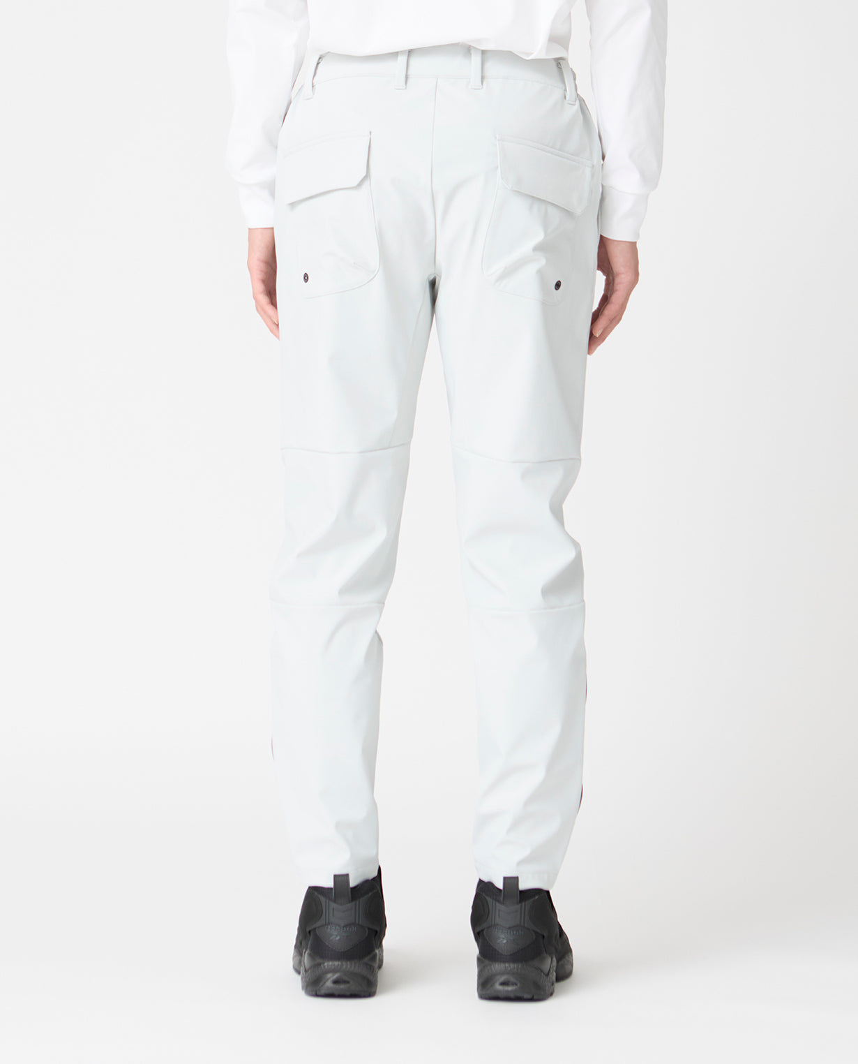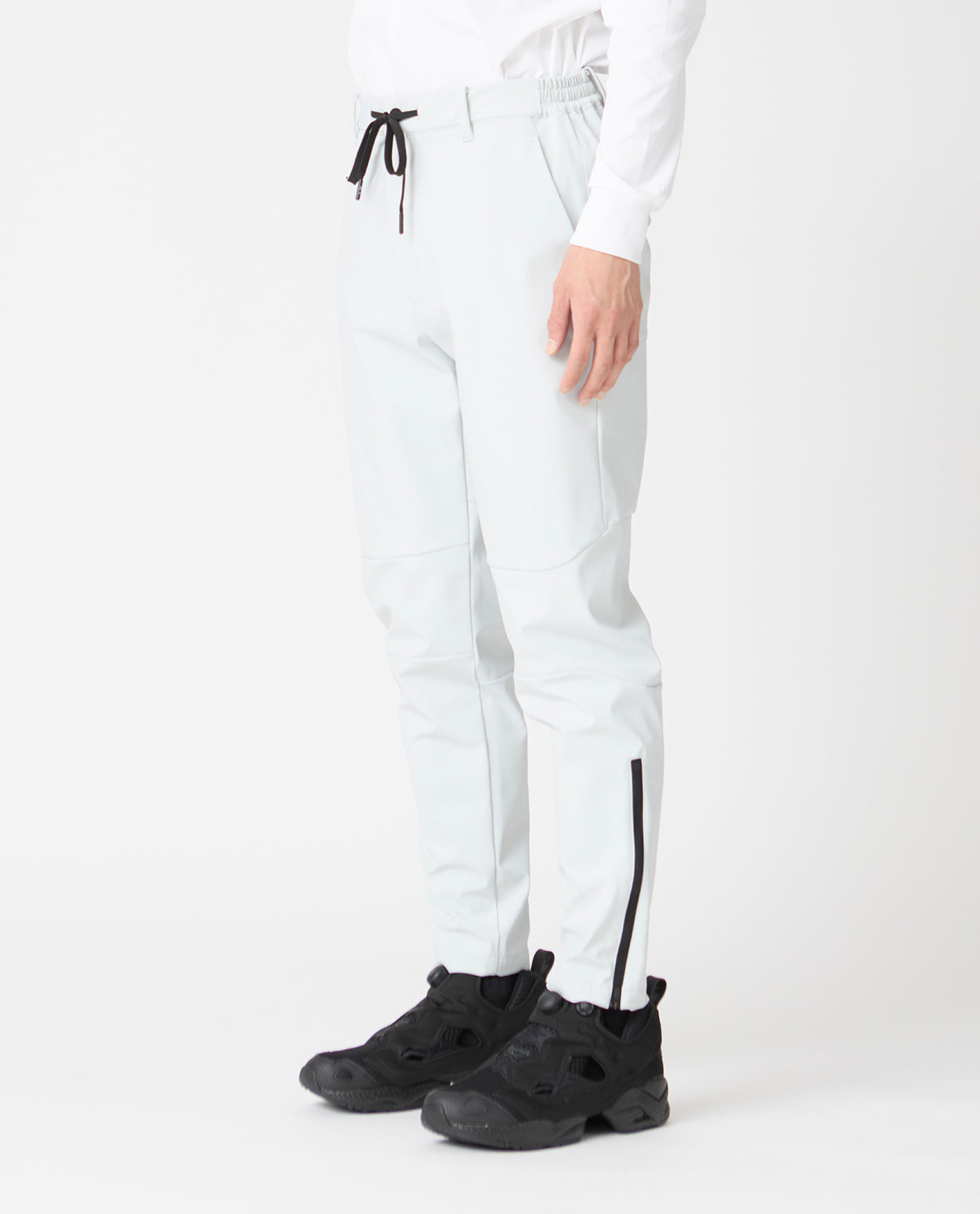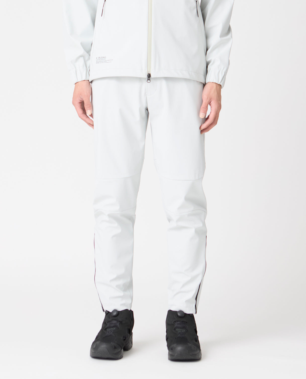 ■ 素材R生地は、経糸・緯糸ともにポリウレタン混の糸を使用した4WAYストレッチ素材。フルダル糸によるマットでフラットな質感と、パウダータッチの柔らかな手触りが特徴です。全方向に伸縮することで、スポーツシーンにも対応する軽量かつ耐久性に優れた布帛(ふはく)生地に仕上げています。今回はこのR生地に、別素材のニット生地と透湿防水フィルムをボンディング加工した3層構造のRB生地を採用。外側からの水の侵入を防ぎながら、内側の湿気を外に逃がす高い透湿防水性を実現しました。従来のR生地では対応しづらかった肌寒い季節でも、動きやすさはそのままに、雨風を防ぎながら快適な暖かさを保ちます。■ デザイン立体裁断(3Dカッティング)による複雑なパターン構成で、180度の開脚も可能な広い可動域を実現。横方向に切り替えた膝のパーツは屈伸動作をサポートし、膝抜けしにくい構造となっています。裾にはファスナーを配し、閉じればすっきりとしたテーパードシルエット、開ければ中から共布の当て布が現れストレートラインに。ハイカットのブーツやスニーカーの着脱をスムーズにする設計であると同時に、着こなしの幅を広げるディテールとしても機能します。ウエストは両脇ゴム仕様で、革ベルトとの併用も可能なベルトループ付き。内外どちらにも結べるドローコードを備えており、快適性と汎用性を両立しています。後ろポケットにはワンタッチボタン付きのフラップを配し、アクティブシーンでの安全性を確保。全体としてはスポーティな設計でありながら、無駄を削ぎ落としたクリーンなルックスでビジネスやゴルフ、ワークアウトから旅行まで、シーンを問わず活躍する一本です。■ スタイリング同じ生地の新商品の0_673_RBアクティブストレッチボンディングセットアップフルジップパーカとのセットアップとしての着用はもちろん、この肌寒くなる秋冬にかけての機能性パンツとしてぴったりの商品。