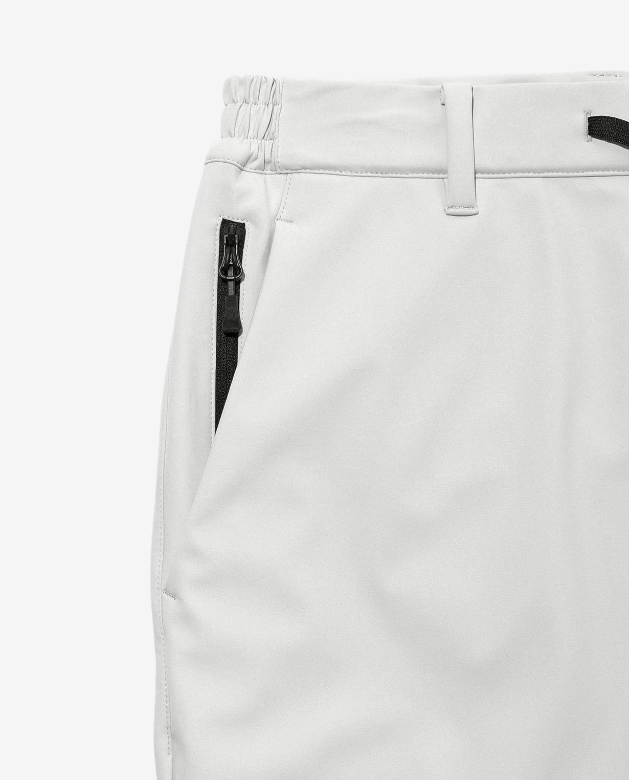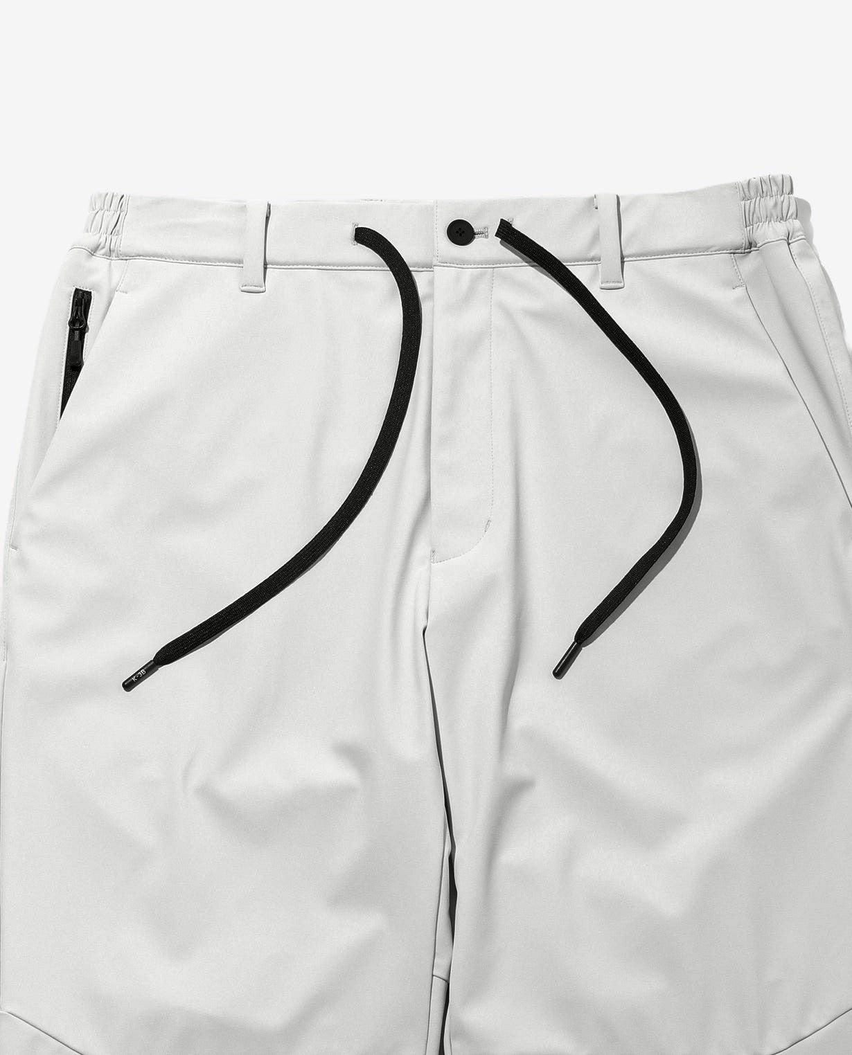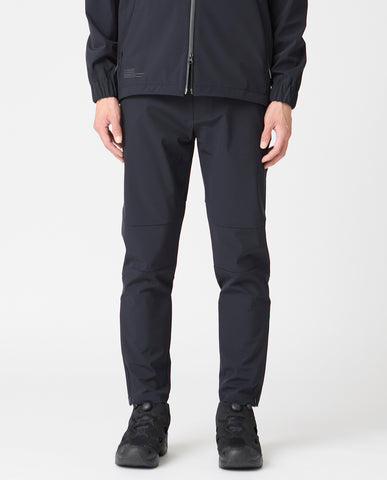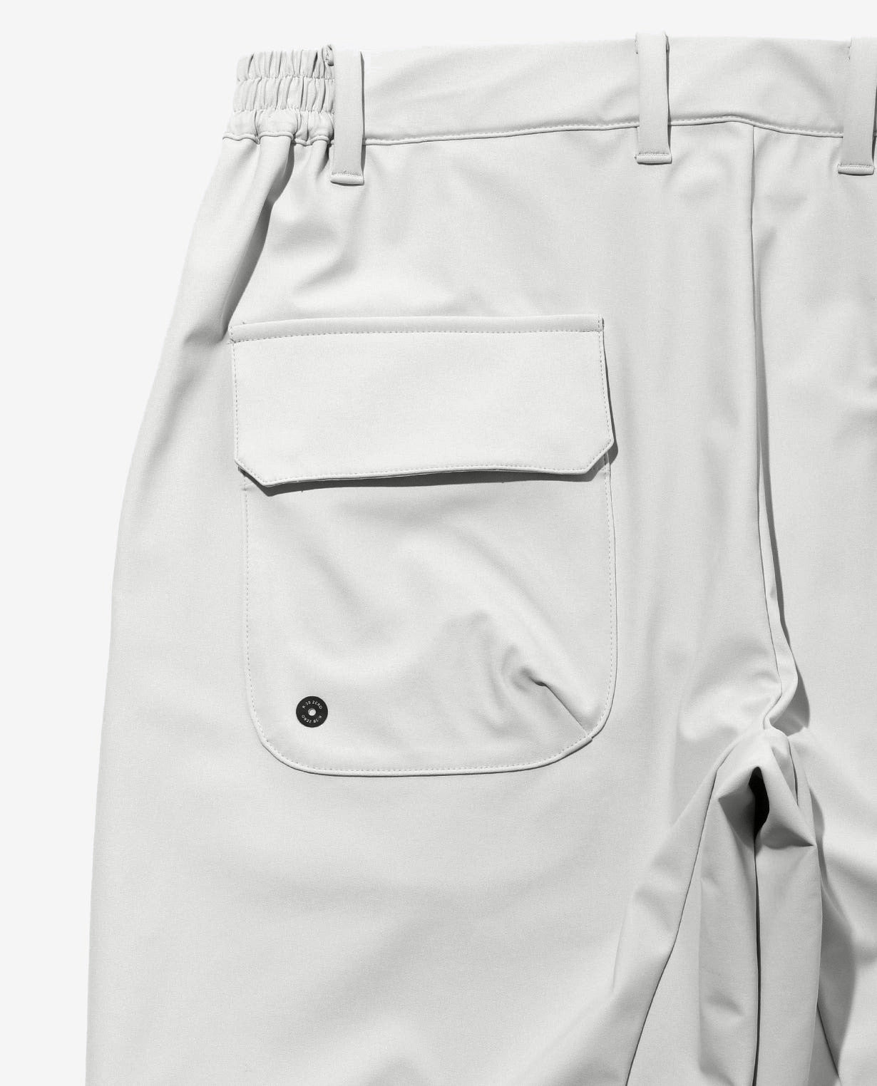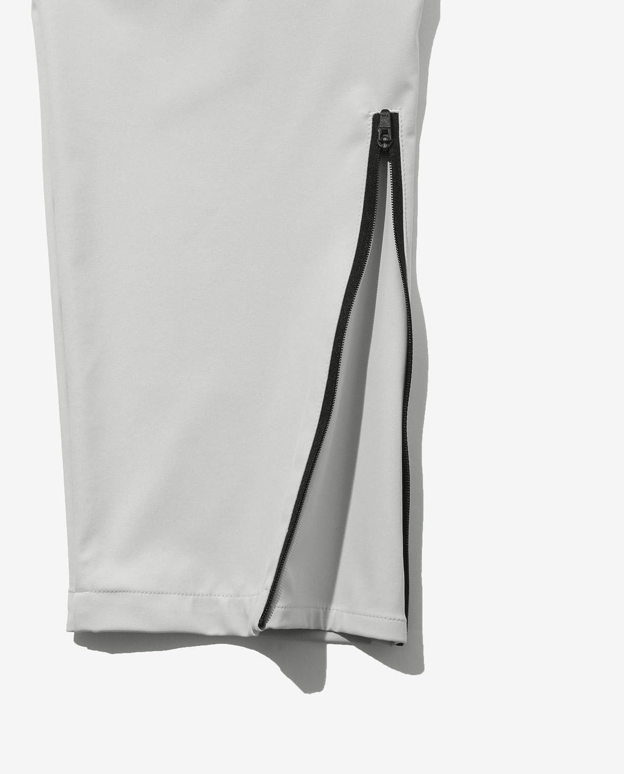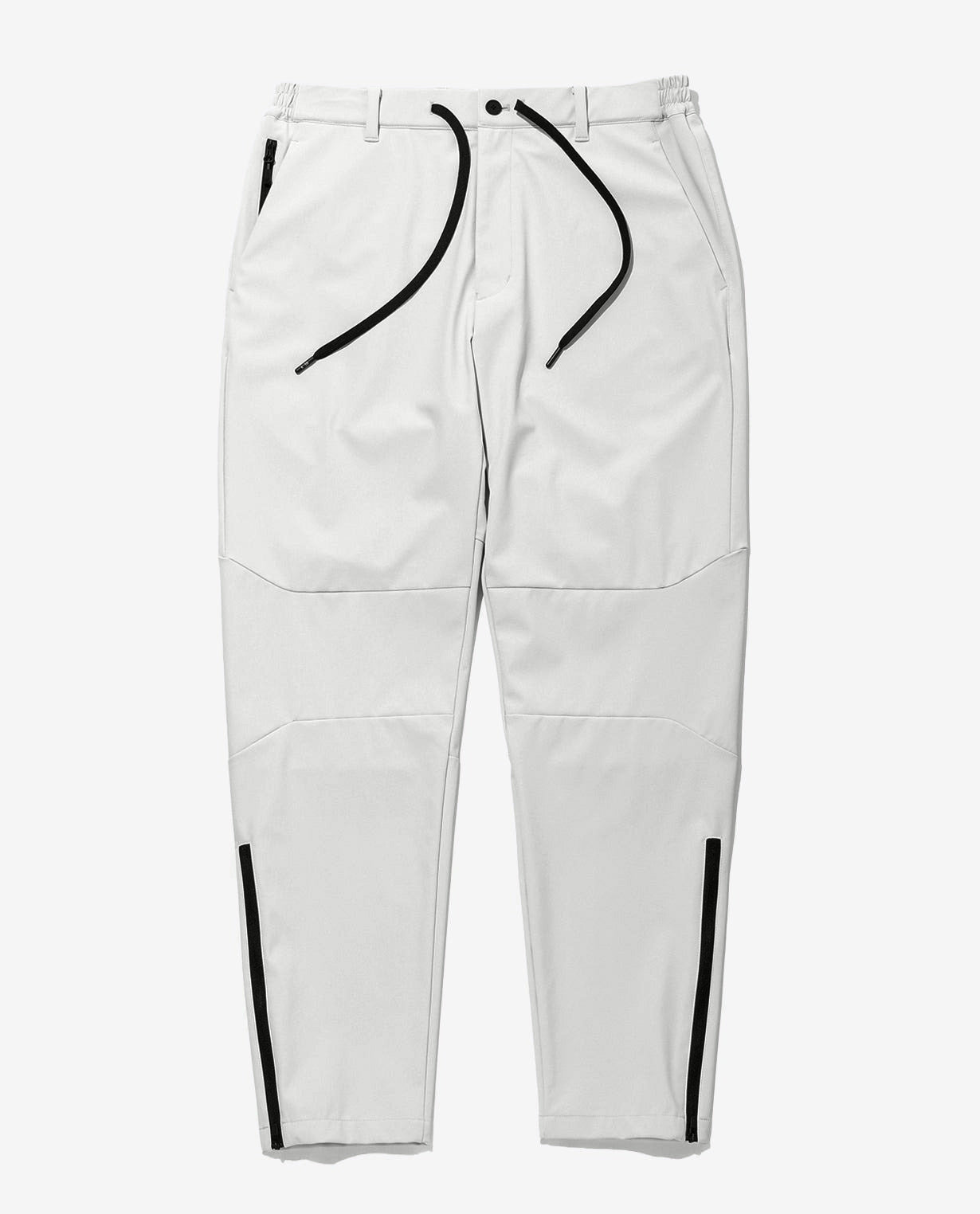 ■ 素材R生地は、経糸・緯糸ともにポリウレタン混の糸を使用した4WAYストレッチ素材。フルダル糸によるマットでフラットな質感と、パウダータッチの柔らかな手触りが特徴です。全方向に伸縮することで、スポーツシーンにも対応する軽量かつ耐久性に優れた布帛(ふはく)生地に仕上げています。今回はこのR生地に、別素材のニット生地と透湿防水フィルムをボンディング加工した3層構造のRB生地を採用。外側からの水の侵入を防ぎながら、内側の湿気を外に逃がす高い透湿防水性を実現しました。従来のR生地では対応しづらかった肌寒い季節でも、動きやすさはそのままに、雨風を防ぎながら快適な暖かさを保ちます。■ デザイン立体裁断(3Dカッティング)による複雑なパターン構成で、180度の開脚も可能な広い可動域を実現。横方向に切り替えた膝のパーツは屈伸動作をサポートし、膝抜けしにくい構造となっています。裾にはファスナーを配し、閉じればすっきりとしたテーパードシルエット、開ければ中から共布の当て布が現れストレートラインに。ハイカットのブーツやスニーカーの着脱をスムーズにする設計であると同時に、着こなしの幅を広げるディテールとしても機能します。ウエストは両脇ゴム仕様で、革ベルトとの併用も可能なベルトループ付き。内外どちらにも結べるドローコードを備えており、快適性と汎用性を両立しています。後ろポケットにはワンタッチボタン付きのフラップを配し、アクティブシーンでの安全性を確保。全体としてはスポーティな設計でありながら、無駄を削ぎ落としたクリーンなルックスでビジネスやゴルフ、ワークアウトから旅行まで、シーンを問わず活躍する一本です。■ スタイリング同じ生地の新商品の0_673_RBアクティブストレッチボンディングセットアップフルジップパーカとのセットアップとしての着用はもちろん、この肌寒くなる秋冬にかけての機能性パンツとしてぴったりの商品。