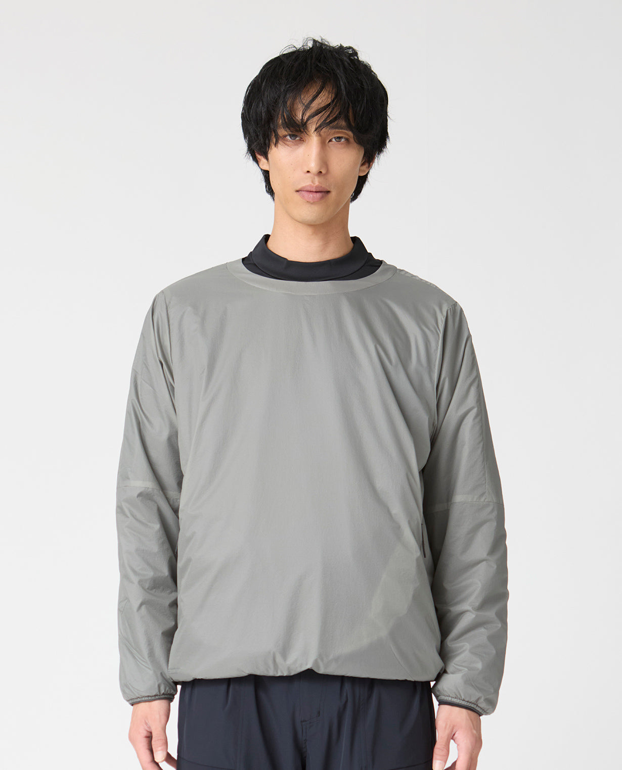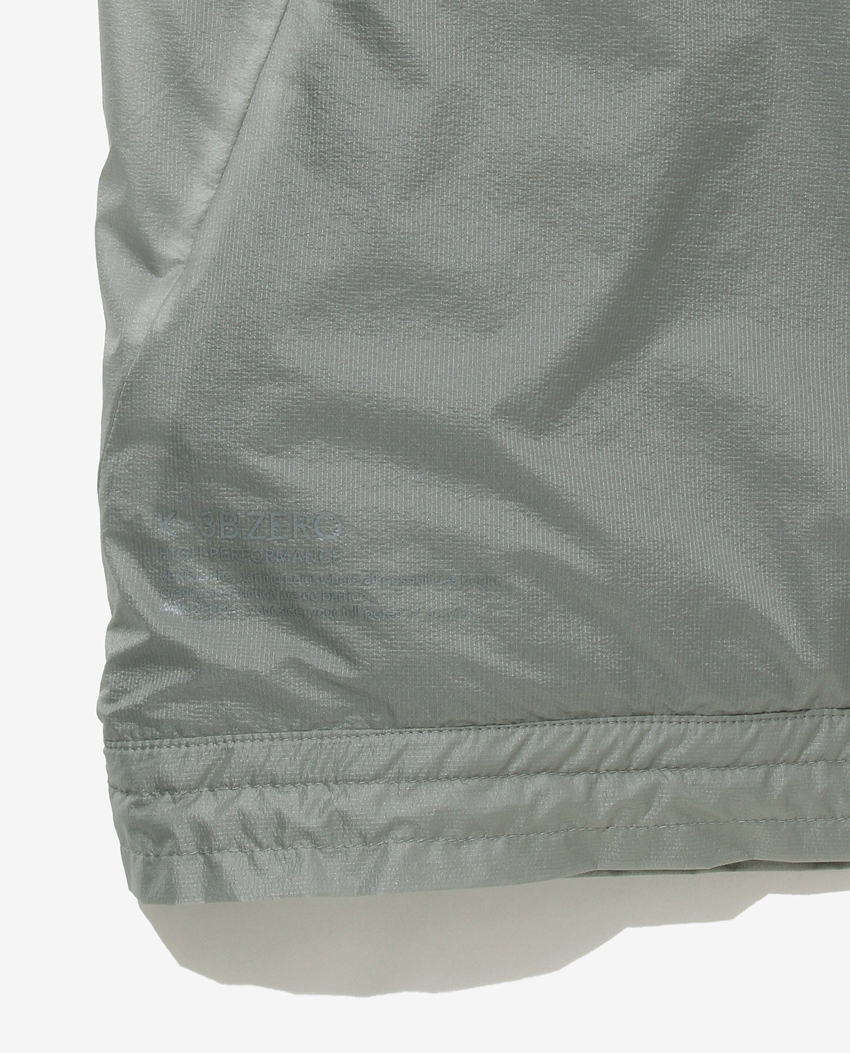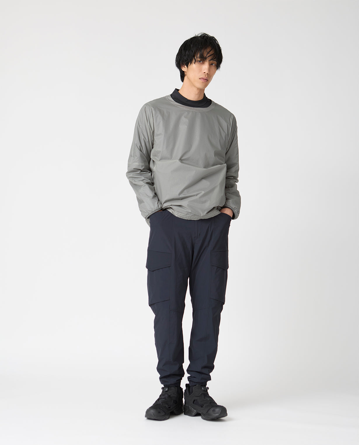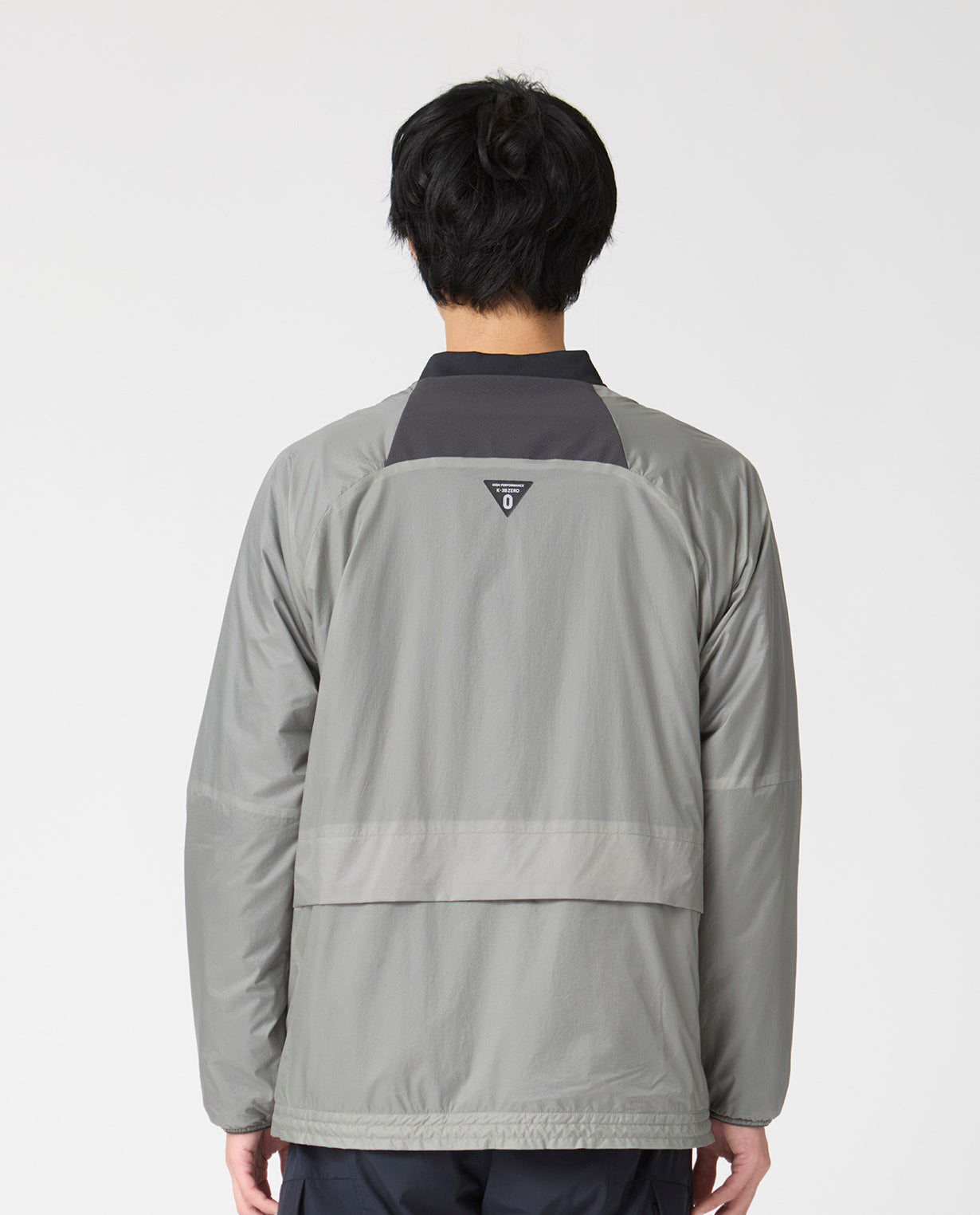 ■ 素材世界最軽量クラスの7d(デニール)のウーリー糸を使って織られた、羽根のように軽いF生地を採用。軽い雨を弾く撥水仕様で、家庭洗濯が可能。速乾性にも優れ、シワになりにくいのが特徴です。また、引き裂き強度の高いリップストップ組織で構成され、裏面には補強のコーティングを施しています。薄くて軽いにもかかわらず、強度と防風性能を両立した素材です。裏地には、多機能繊維「Octa® (オクタ®)」を使用。帝人フロンティアが開発した特殊な断面のポリエステル繊維で、アクティブインサレーション(動的保温着)に最適な高機能素材です。中空の糸に8つの突起を持つ断面構造によって、軽量性・保温性・断熱性・吸水性・速乾性に優れるため、低温下でも高い保温性を維持しつつ、通気性の良さでオーバーヒートを防止。脱ぎ着の必要がなく、着たままで快適な運動を続けることができます。■ デザイン超軽量素材と高機能裏地 Octa®(オクタ)を組み合わせた、アクティブインサレーションジャケット。ストレッチ性に優れ、身体の動きにしなやかに追従。軽さを感じさせない保温性で、快適な着心地を実現します。襟の後部には伸縮性の高い素材を配置し、着脱時のストレスを軽減。袖口裏にはメッシュ素材を採用し、肌離れの良さと速乾性を確保しています。背面にはベンチレーション機能を備えたフラップを設け、衣服内の熱を効果的に逃がして通気性を確保。さらに、背面のK-3Bロゴがシンプルなデザインの中にテクニカルなアクセントを添えています。ミニマルなデザインの中に、機能美とテクノロジーを凝縮した次世代のウォームジャケットです。■ スタイリング同じく Octa®を使用したカーゴジョガーパンツとセットアップでの着用がおすすめ。無駄のないミニマルデザインに、Octa®ならではの快適な保温性と通気性を備え、街からトレーニングシーンまでシームレスに対応します。出張やトラベルにも最適で、移動中も快適かつスマートに過ごせる機能性ウェアです。■ 同じ生地のアイテムを見るF生地 (MEN)■ ジャーナルの記事を見る「F生地」シリーズを徹底解説。世界最軽量クラスのリップストップ・ナイロン生地