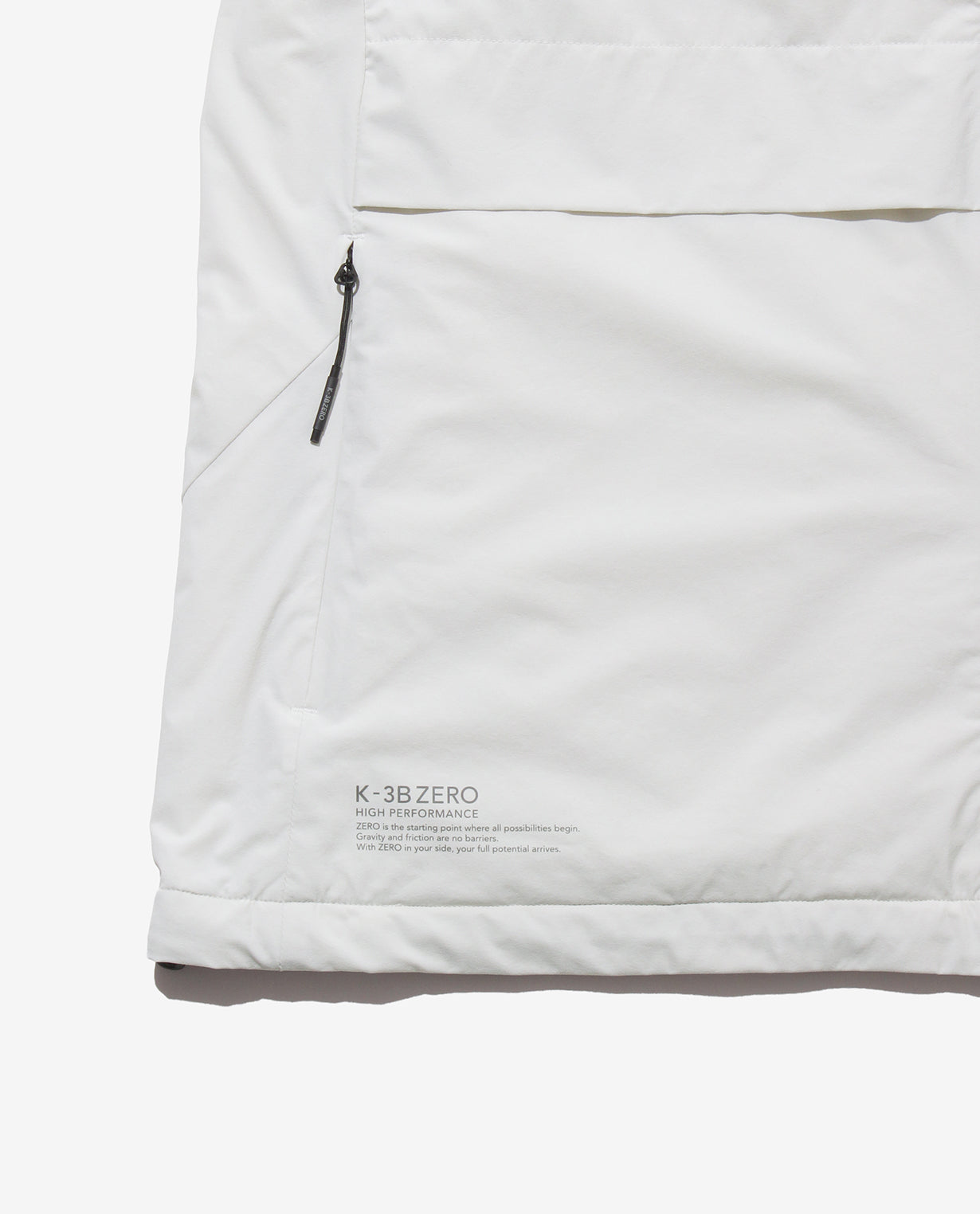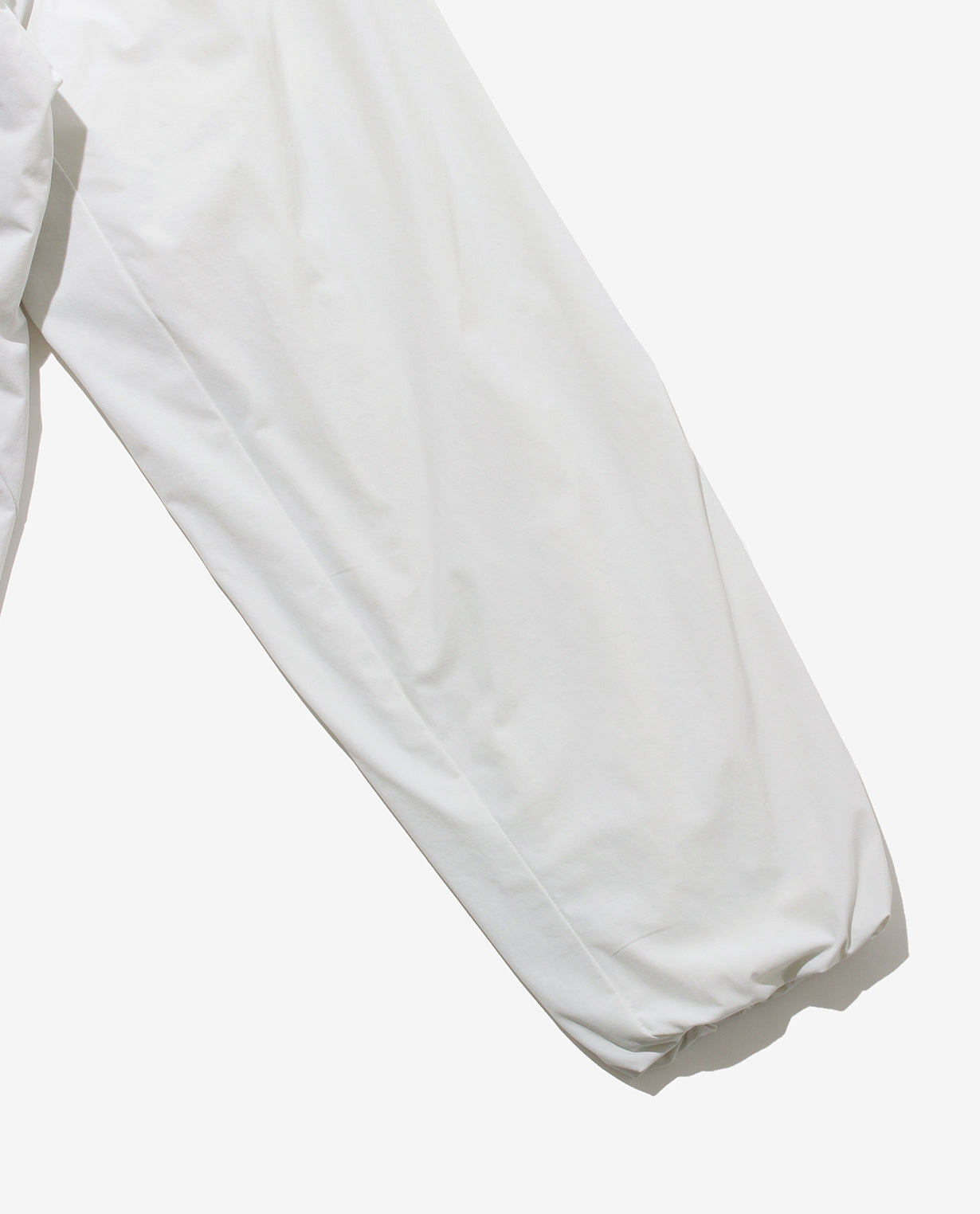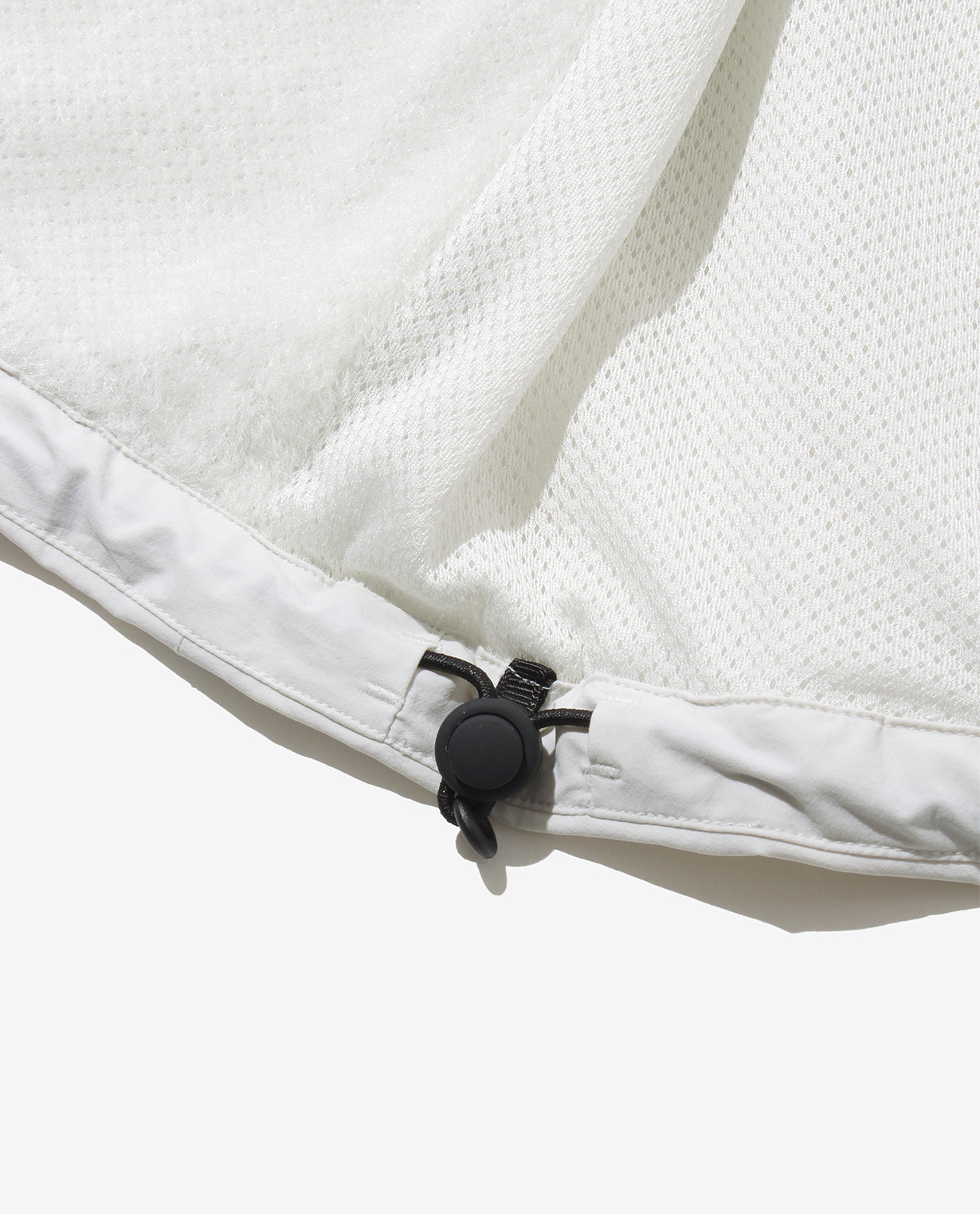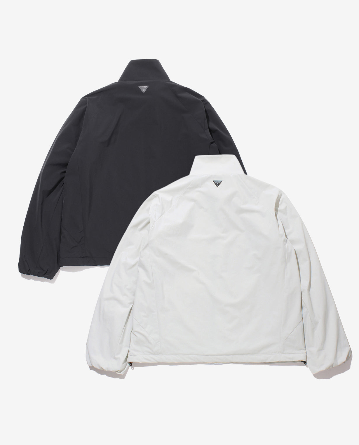 裏地には「OCTA(オクタ)®CPCP®を採用しています。オクタとは、帝人フロンティアが開発した高機能素材で、表面に8つの突起があり中心が空洞となった特殊な糸のこと。軽量で空気をたくさん含む構造になっています。そのオクタをメッシュ生地に編み込んだのがOCTA®CPCP®。片面は平滑なメッシュ・もう片面はふわふわの起毛パイル状で、中綿と裏地を一体化したようなテキスタイルです。高い保温性と吸湿速乾性・通気性を誇りながら非常に軽量なので、秋冬のアクティビティに最適です。■ デザインミニマルなデザインで一見すると防寒着とは思えない、軽量インサレーションジャケット。暖かいのに着膨れして見えないのが魅力です。裏地に高機能素材 OCTA®CPCP®を採用し、パーツによって起毛面とメッシュ面を使い分けることでより快適な着心地を実現。前後の身頃や外袖は起毛面が身体に当たるのでふんわりと柔らかく、脇や袖下は滑りのよいメッシュ面にしてあるので、保温性能を保ちながらインナーとの摩擦が起こりにくい設計になっています。前身頃の切り替え部分はベンチレーション機構になっていて、衣服内のムレを軽減。袖口はシャーリングのゴムを内側に隠し、カジュアル感を抑えています。腰ポケットの袋布も起毛になっているので、ハンドウォーマーがわりにも。スッと美しく立ち上がるスタンドカラーや配色のフロントファスナーがアクセントとなり、ミニマルなフォルムの中に機能美を感じさせます。体温調整が求められる季節の変わり目にも最適な高機能のブルゾンは、比較的にコンパクトな設計なのでゆったりしたコートの下ならミドラーとしても着用可能。軽量でストレスフリーな着心地かつ洗練されたルックスで、タウンユースからアクティブシーンまで幅広く活躍します。