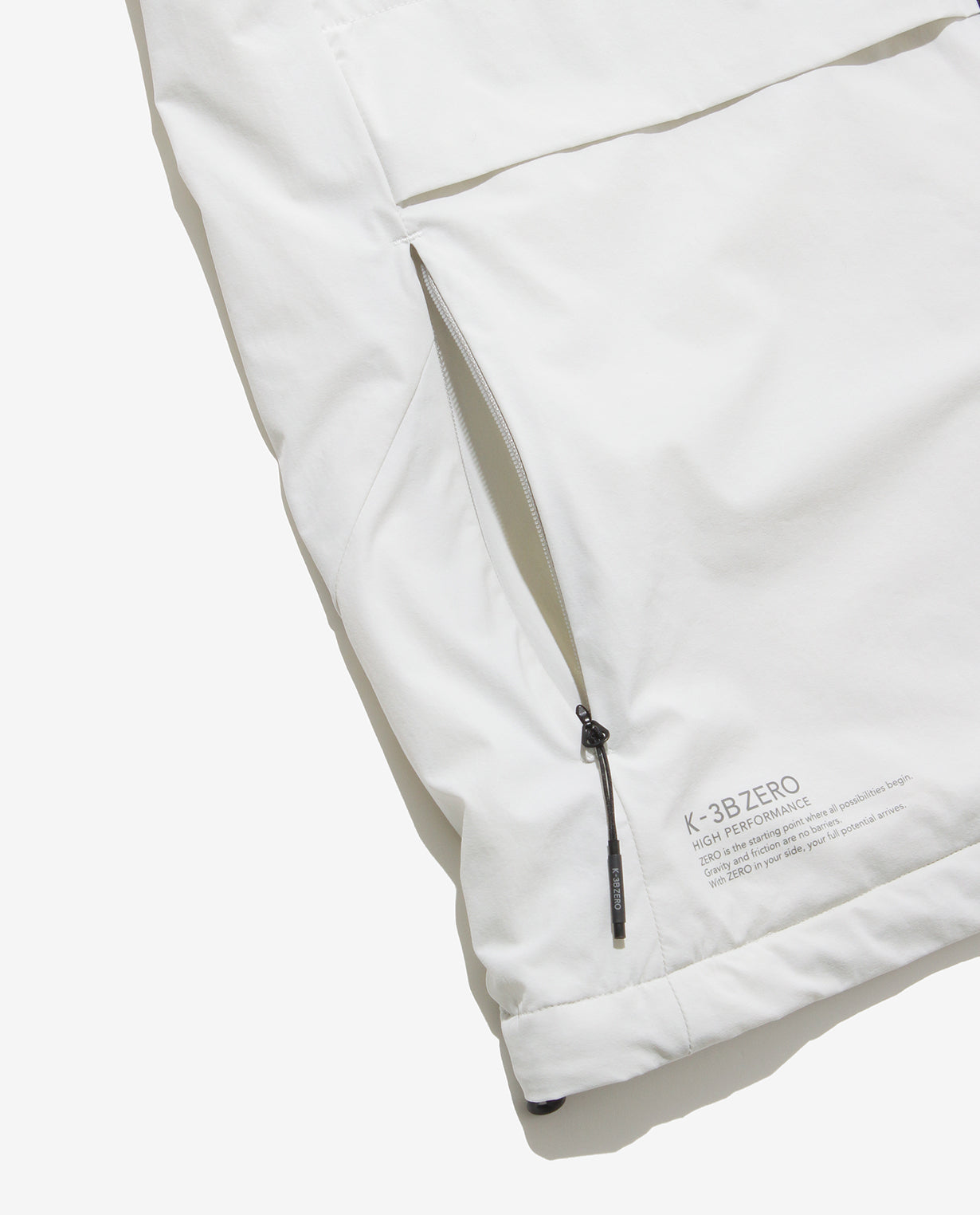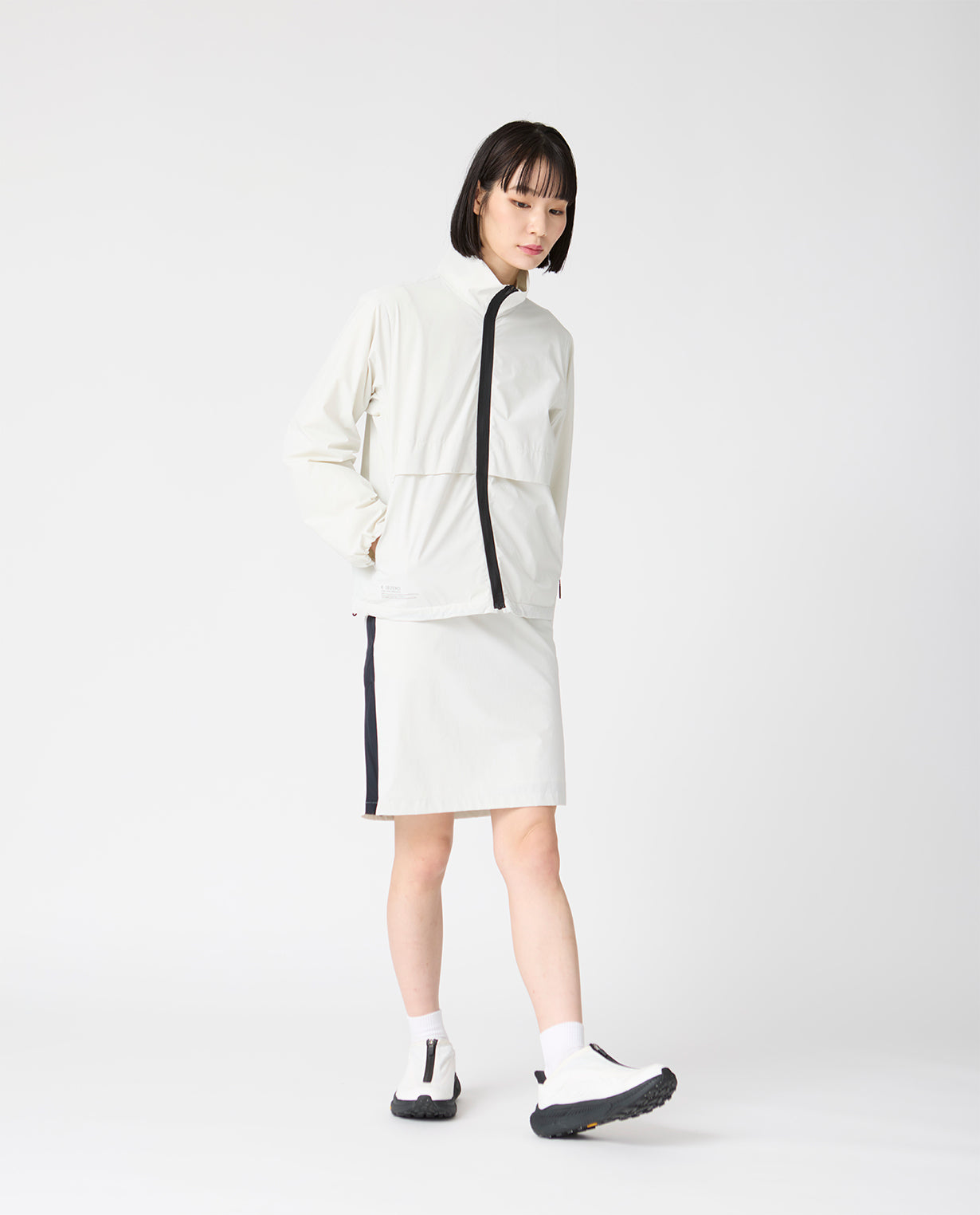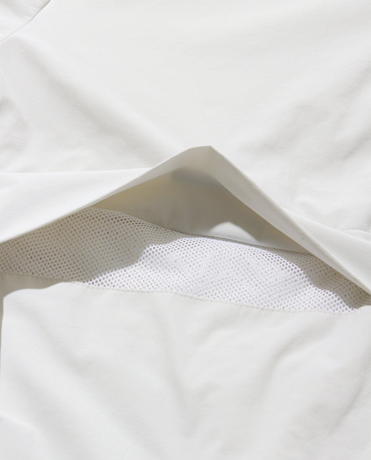 ■ 素材表地には、経糸・緯糸ともにポリウレタン混の糸を使用した4WAYストレッチ素材の「R生地」を採用。フルダル糸によるマットでフラットな質感と、パウダータッチの柔らかな手触りが特徴です。全方向に伸縮することで、スポーツシーンにも対応する軽量かつ耐久性に優れた布帛(ふはく)生地です。