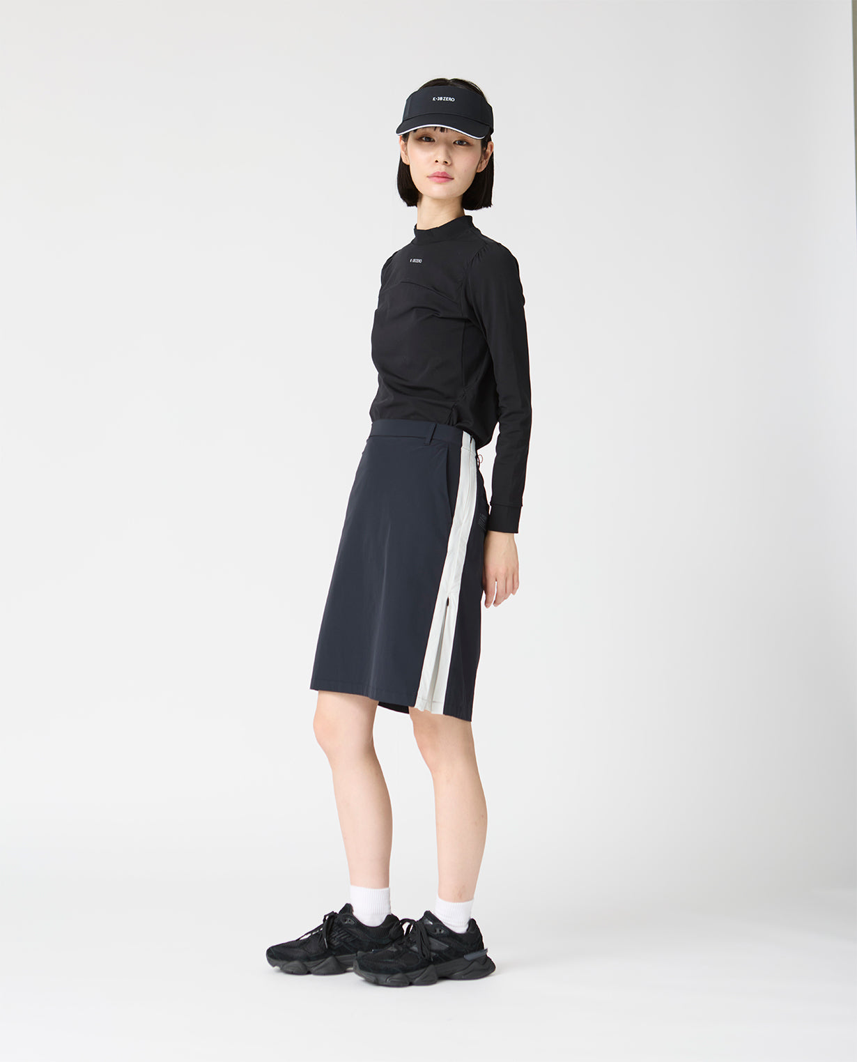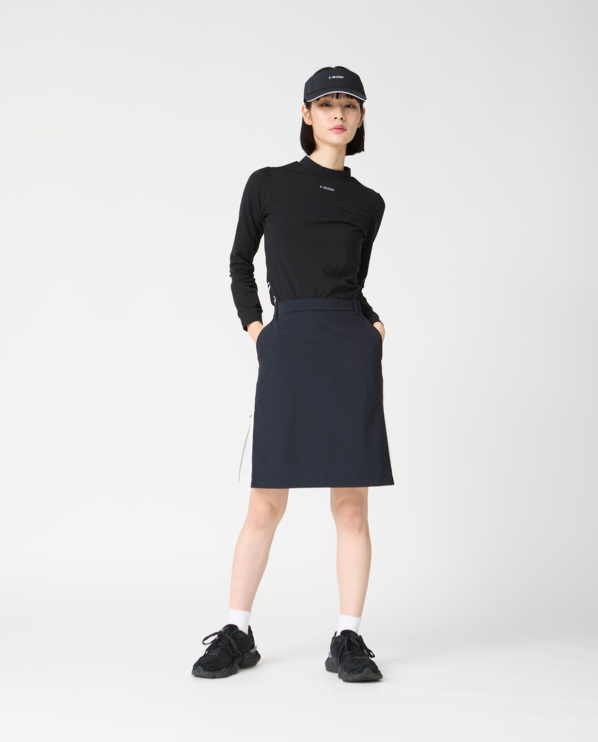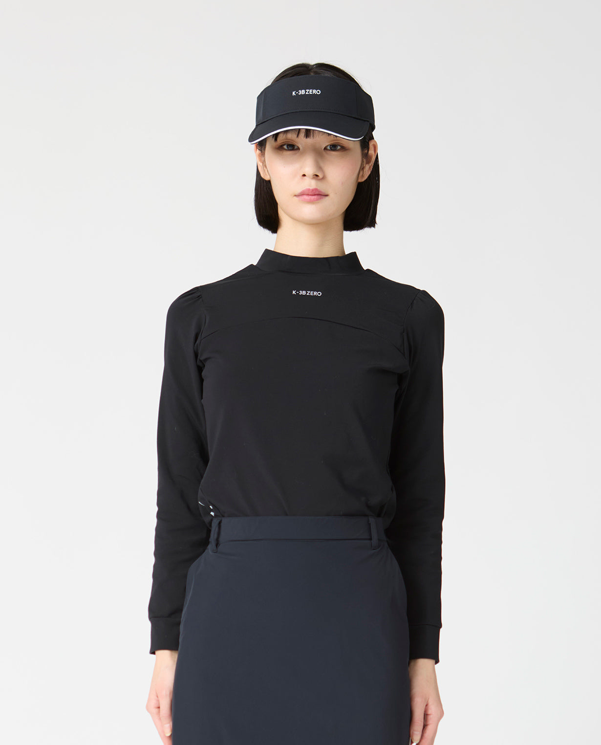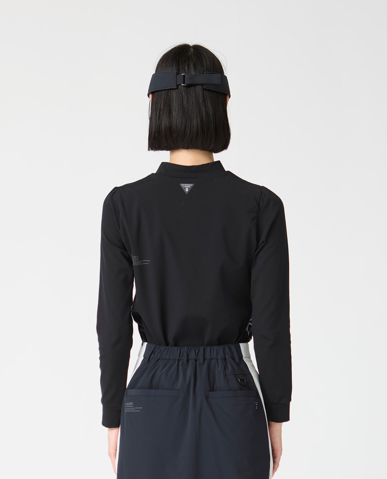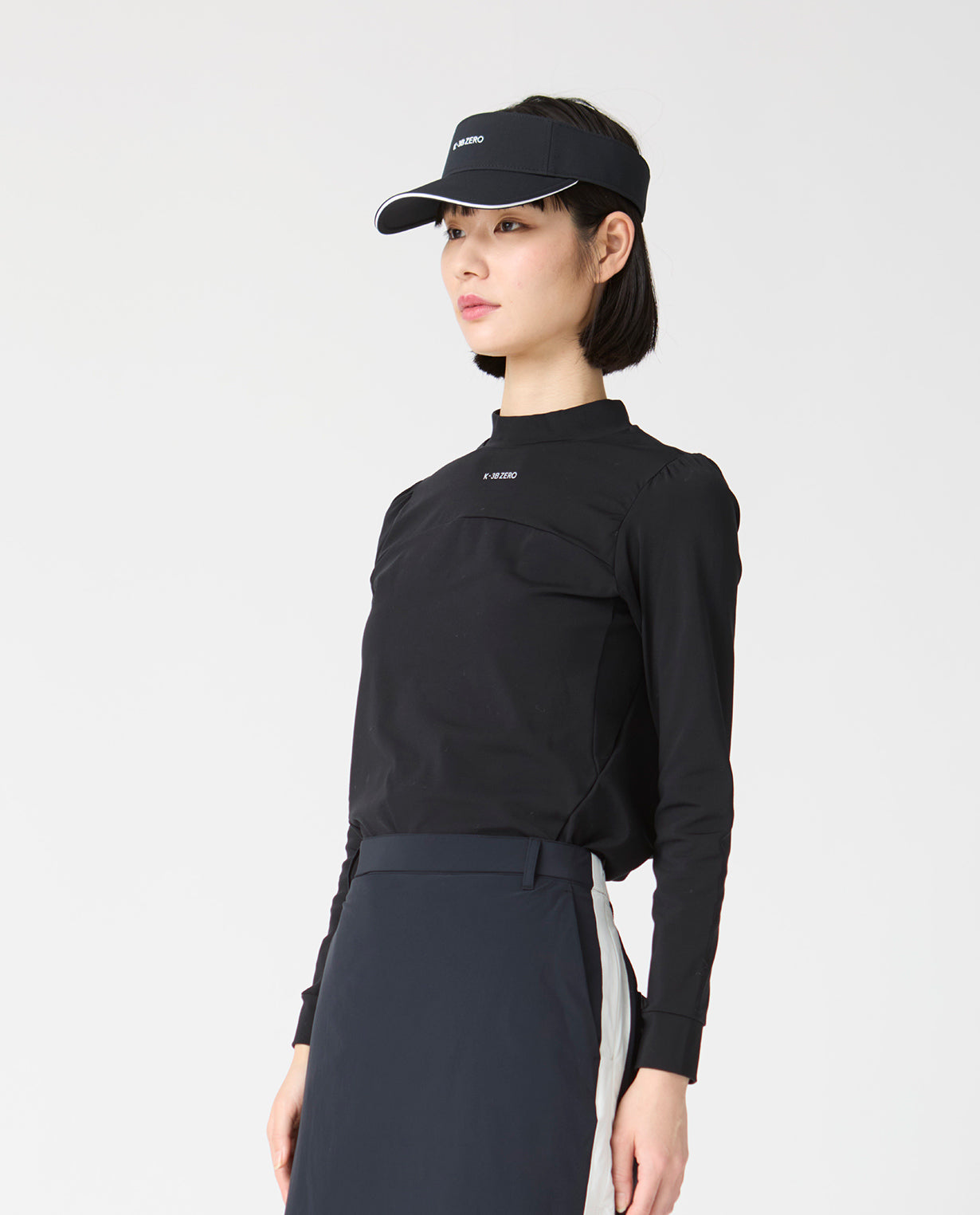 機能的でスタイルアップ効果のあるモックネック0◾素材ナイロン特有の表面の滑らかさとストレッチ性能を誇るジャージー素材「I生地」を使用。ナイロン・コットン・ポリウレタン混紡なので吸湿性があり着心地抜群。フラットできめ細かく滑らか、一見ジャージーとは思えない上質感のあるテクスチャーで、肌触りもサラッとしています。◾デザインスポーツウェアというカテゴリーにとらわれない普遍的な「かっこよさ」の中に、フェミニンさをプラスしたモックネックです。ナチュラルなフィット感ながら、前身頃には斜め方向にカットラインを走らせ、腰高でスレンダーに見せる効果があります。斜めラインに沿うロゴプリントも視線誘導で細見え効果をさらにアップ。袖山はシャーリングで少しパフさせているのでファッショナブルな印象。それに対し肘から下は無駄のないライン、かつ袖口はすっきり細くて邪魔にならない共布カフス。脇下にマチを入れてあるので腕の上げ下げがしやすく、それでいて全体のシルエットはすっきり。ゴルフなどのアクティブシーンでスタイリッシュな着こなしを楽しめるトップスです。◾スタイリングパンツやスカートと合わせることでゴルフシーンなどでの活用可能が可能です。