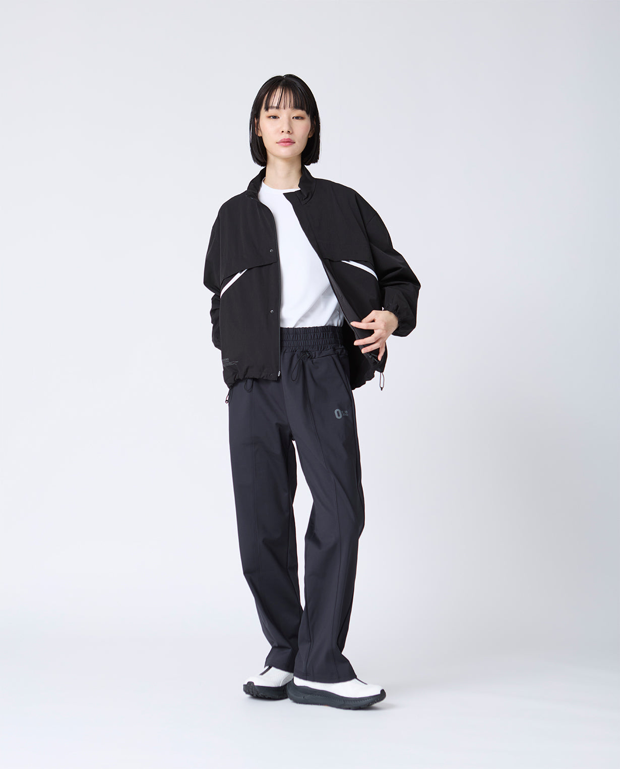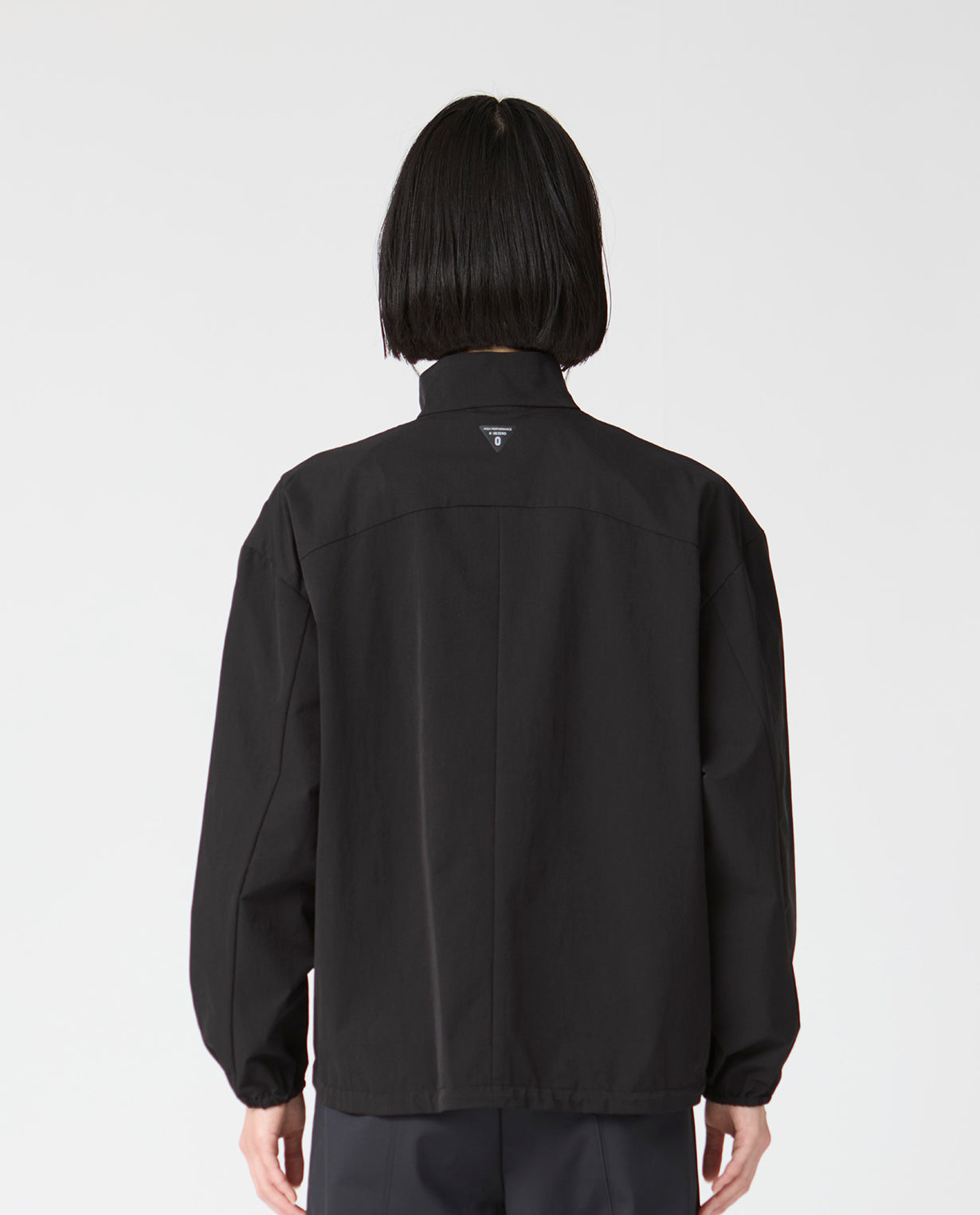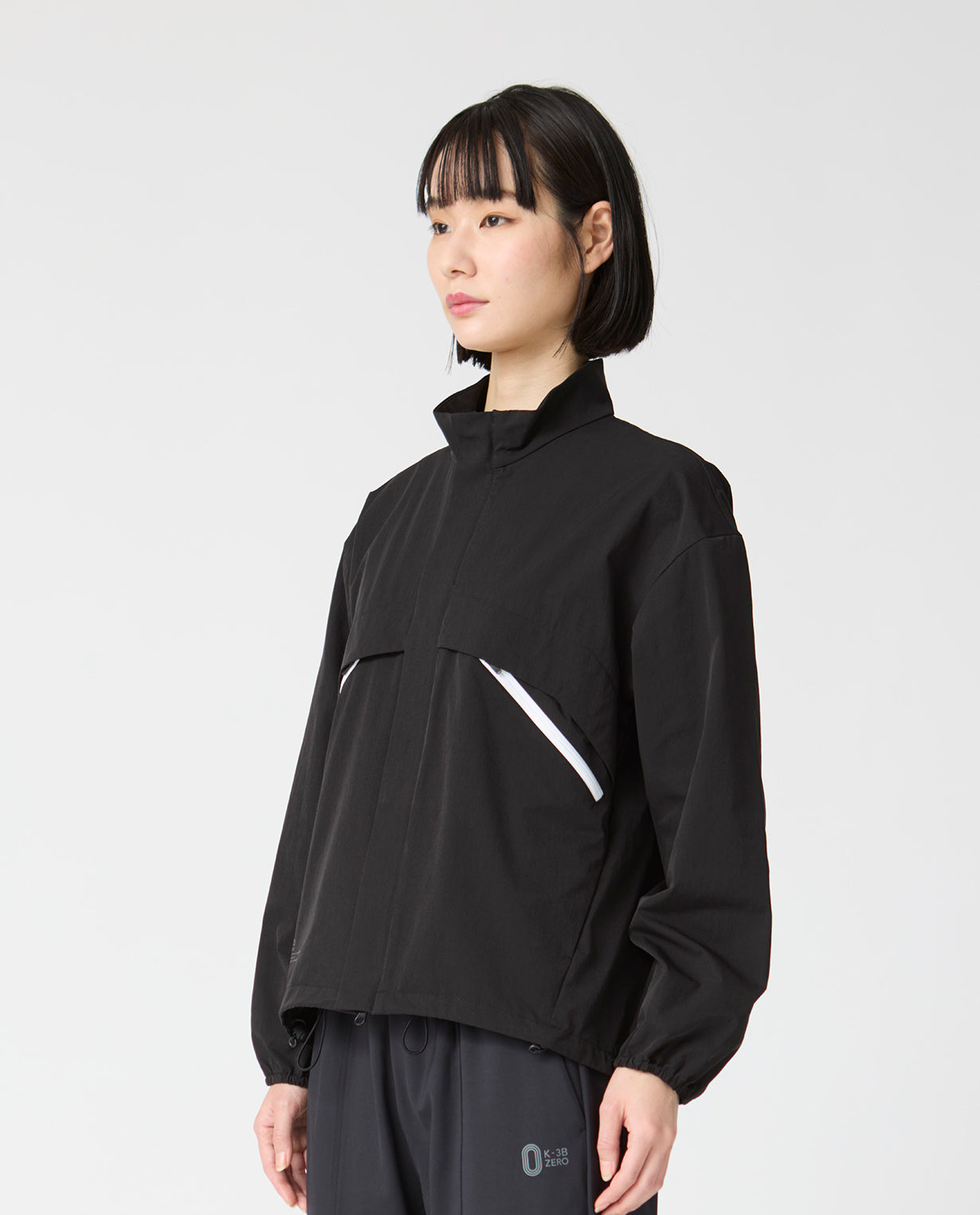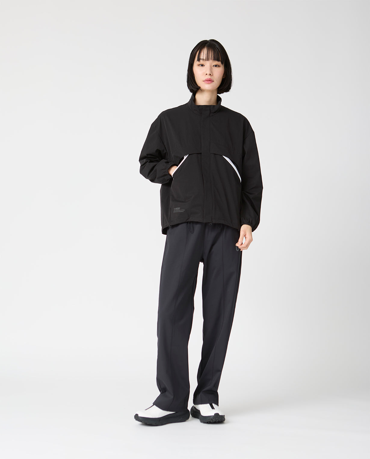 ■ 素材カジナイロンの仮撚(かりより)加工技術を活用し、収縮率の異なる糸を組み合わせて開発した独自のL生地を使用。 ストレッチ性を備えながら、天然素材のようなナチュラルな風合いが魅力です。 微マットなテクスチャーにより、軽やかさと程よいハリ感を両立し、ドライでさらりとした肌触りを実現。 速乾性にも優れたイージーケア素材で、快適な着心地と抜け感のあるシルエットにより、さまざまなアイテムで展開されています。■ デザイン 羽織るだけでモードスポーツな印象をつくる、ミニマルデザインのトラックジャケット。バイカラーの配色と高めのスタンドカラーが顔まわりをシャープに見せ、都会的でクールな雰囲気を演出します。派手な装飾を排除し、生地の美しい表情を活かした上品な仕上がり。家庭洗濯が可能でシワになりにくく、日常からアクティブシーンまで快適に着用できます。腰が隠れる後ろ下がりの着丈と、ゆとりある身幅・ドロップショルダーで動きやすさも抜群。裾にはドローコードを備え、シルエットを自在に調整可能です。フロントはオープンファスナーと隠しスナップボタンの二重仕様で、前立てが衿から裾まで美しく縦に走る構築的なラインを形成。衿先には傾斜をつけ、首元まで閉めても顎に当たらない快適設計です。脇下がりのラインを描く肩ヨークは、トラックジャケットをモダンに再構築したディテール。袖口は細幅のゴムシャーリングで手首に自然にフィットし、スマートウォッチとの干渉もありません。収納は、セキュリティに配慮したファスナーポケット2か所と、切替線を利用したスラッシュポケット2か所の計4か所を装備。デザイン性と機能性を両立した一着です。