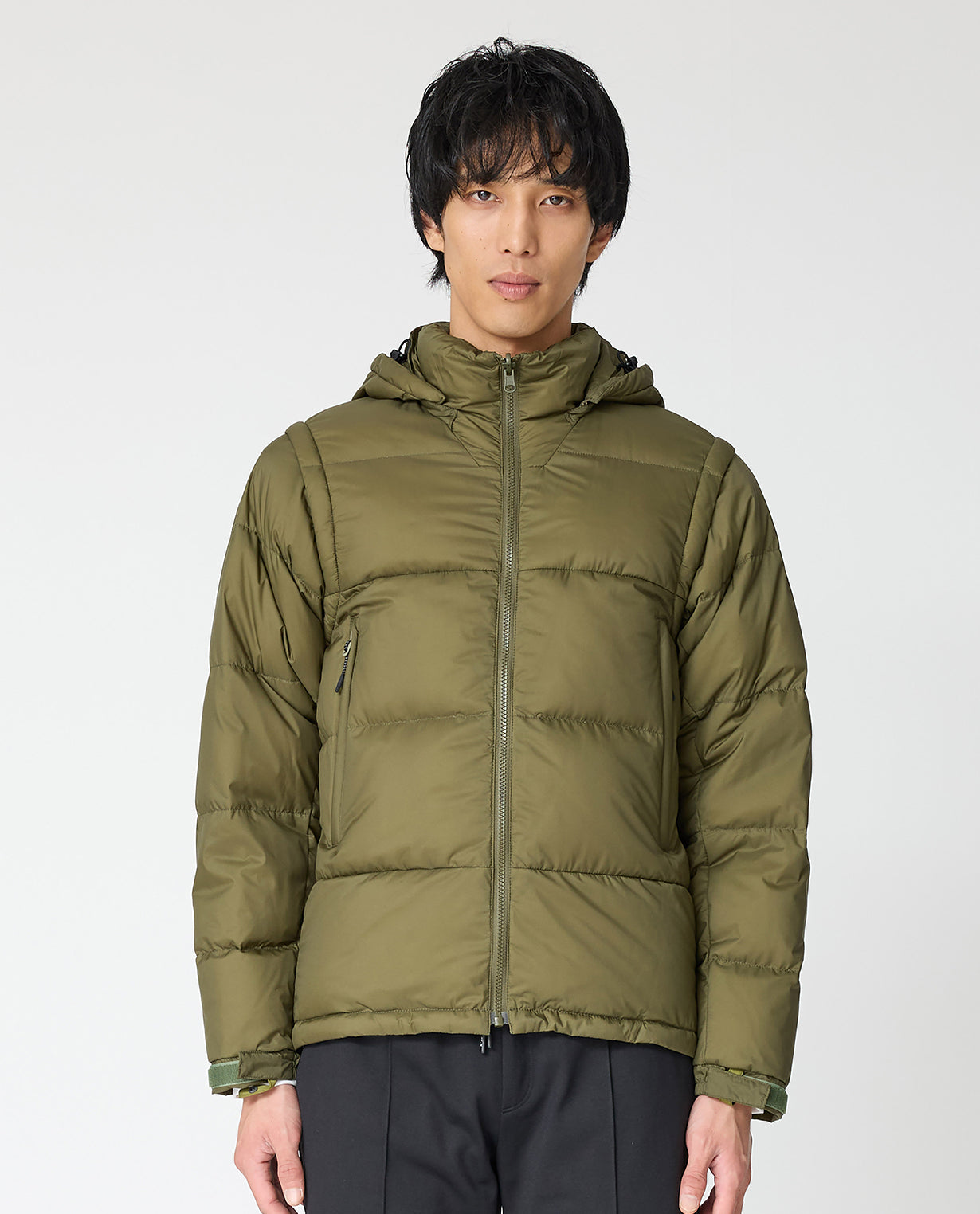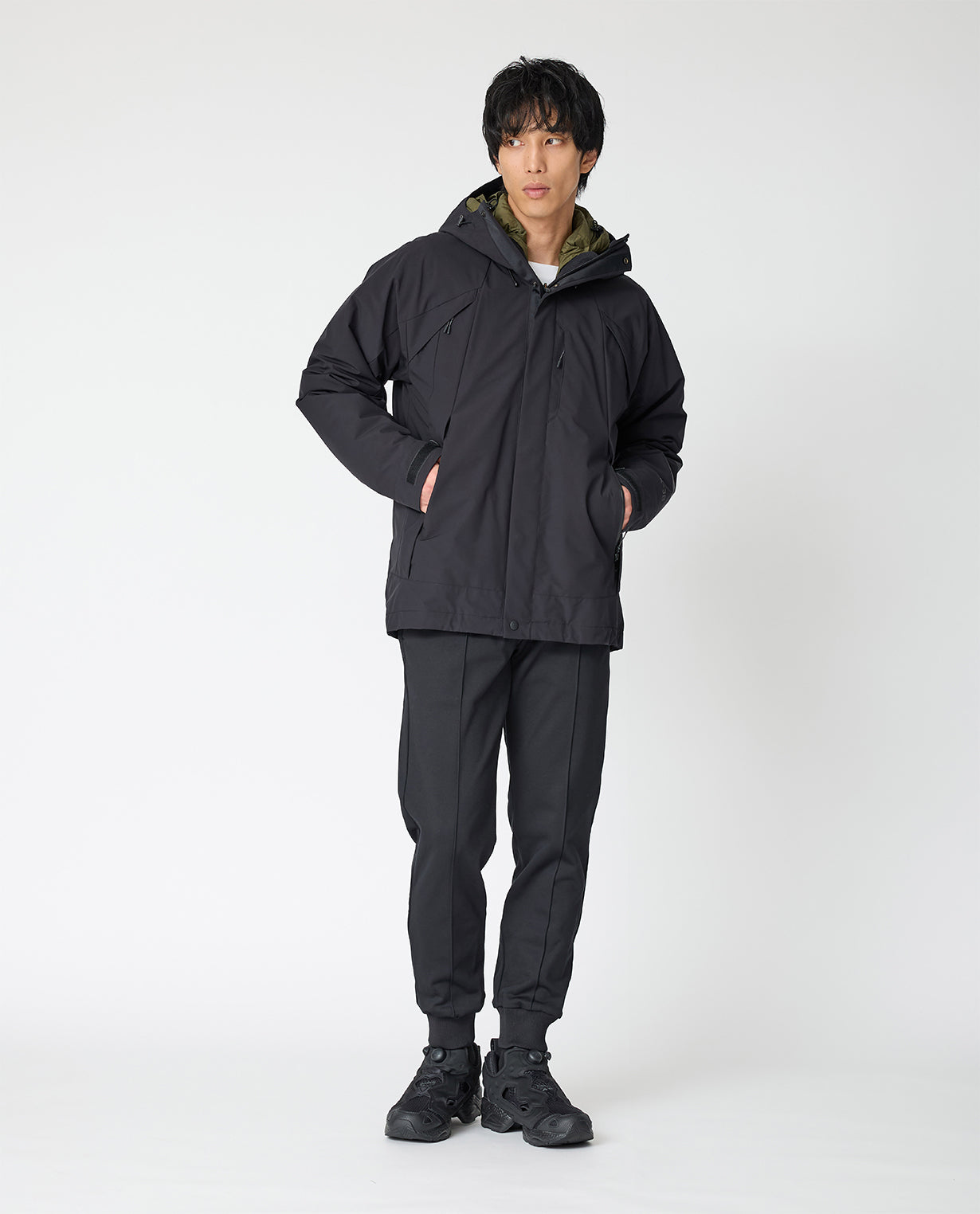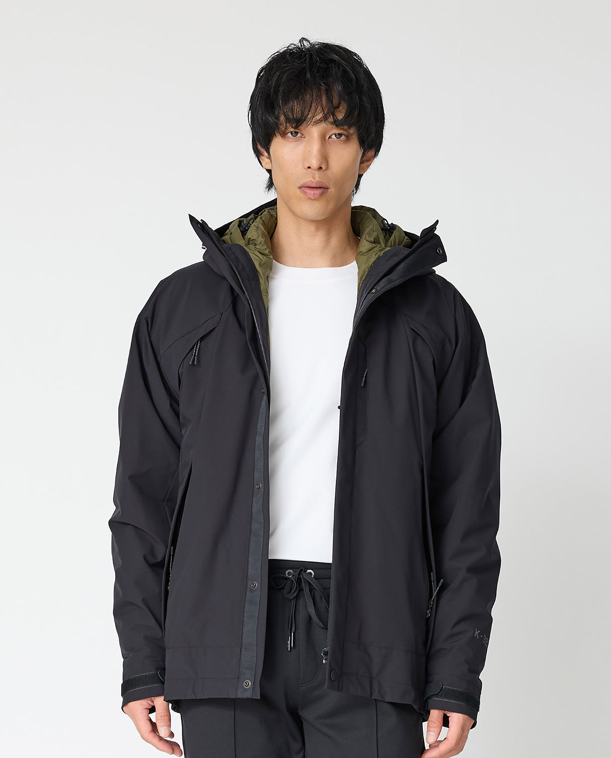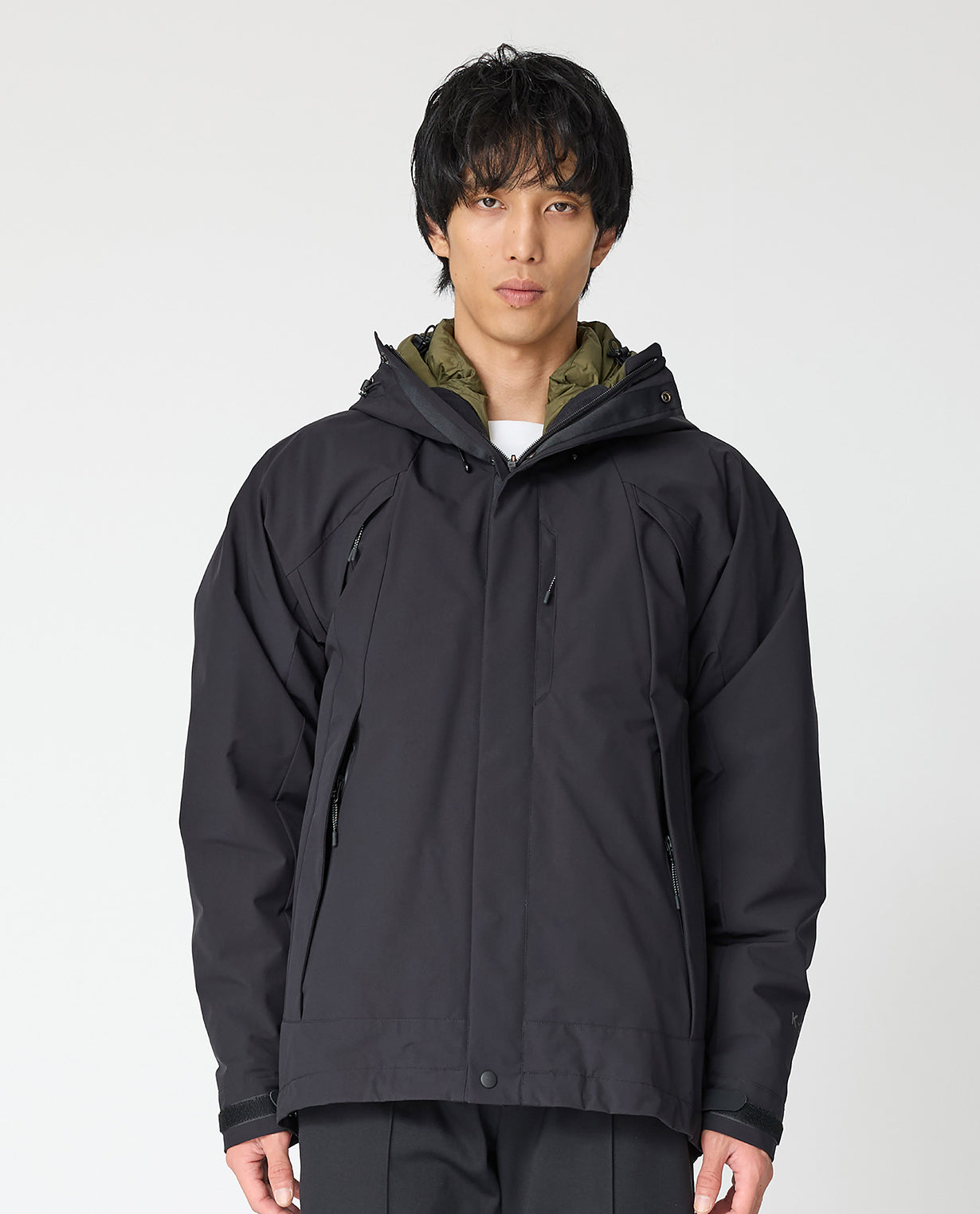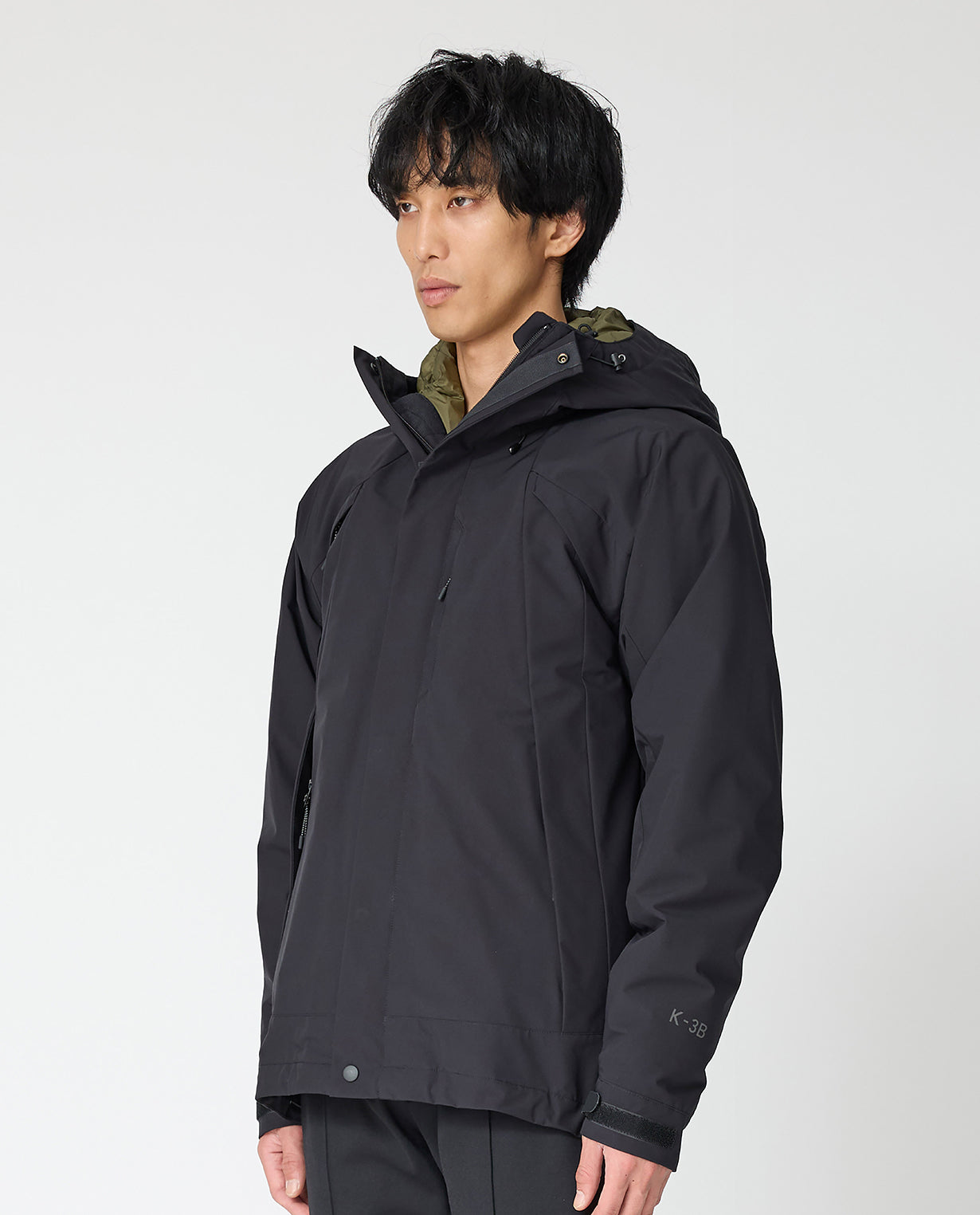 ◾素材 THE PROFESSIONAL SPEC(プロスペック)生地 透湿防水素材の最高峰・3レイヤー(三層構造)の生地を使ったアウトドアユースのシリーズ。 表地はKAJIF(カジフ)の4WAYストレッチナイロン、中間層は透湿防水フィルム、裏地はナイロン丸編み生地を3枚重ねて貼り合わせています。外側の層は水の分子をブロックするので高い防水性を持ちつつ、内側からの汗による水蒸気は外に逃がして蒸れにくいという透湿性も兼ね備えています。雨風を防ぎ雪にも強いプロスペック素材ならではの、仕立て映えのするハリ感も特徴です。