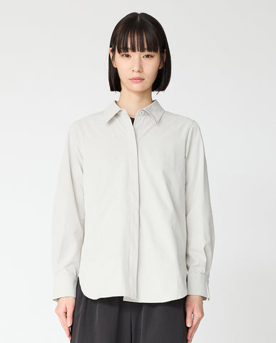 ■ 素材カジナイロンの仮撚(かりより)加工技術を活用し、収縮率の異なる糸を組み合わせた独自開発のL生地を使用。ストレッチ性を備えながら、天然素材のようなナチュラルな風合いが魅力です。微マットなテクスチャーが軽やかさと程よいハリ感を両立し、ドライでさらりとした肌触りを実現。速乾性にも優れ、イージーケアな点もポイントです。快適な着心地と抜け感のあるシルエットで人気を集め、さまざまなアイテムが展開されています。■ デザイン自然な風合いの生地と落ち着いたデザインが合わさった、大人らしい雰囲気のシャツです。丸みのあるシルエットとゆったりしたラグランスリーブで、着心地がよくリラックス感のある仕上がりに。ボリュームのある袖も五分丈にすることで重たくならず、バランスよく着られます。前開き部分をシンプルに見せる仕立てで、第一ボタンと袖口には共布のくるみボタンを採用。さらに袖口のスリットが、さりげなく上品さをプラスします。■ スタイリング短めの着丈はワイドパンツやボリュームスカートと好相性で、トレンド感のあるバランスの取れたスタイルを楽しめます。抜け感のあるシルエットは一枚での着用はもちろん、アクセサリーや小物を合わせることでドレッシーな印象にもアレンジ可能。オンオフ問わず幅広いシーンに活躍するシャツです。 ■ 同じ生地のアイテムを見るL生地 (WOMEN)