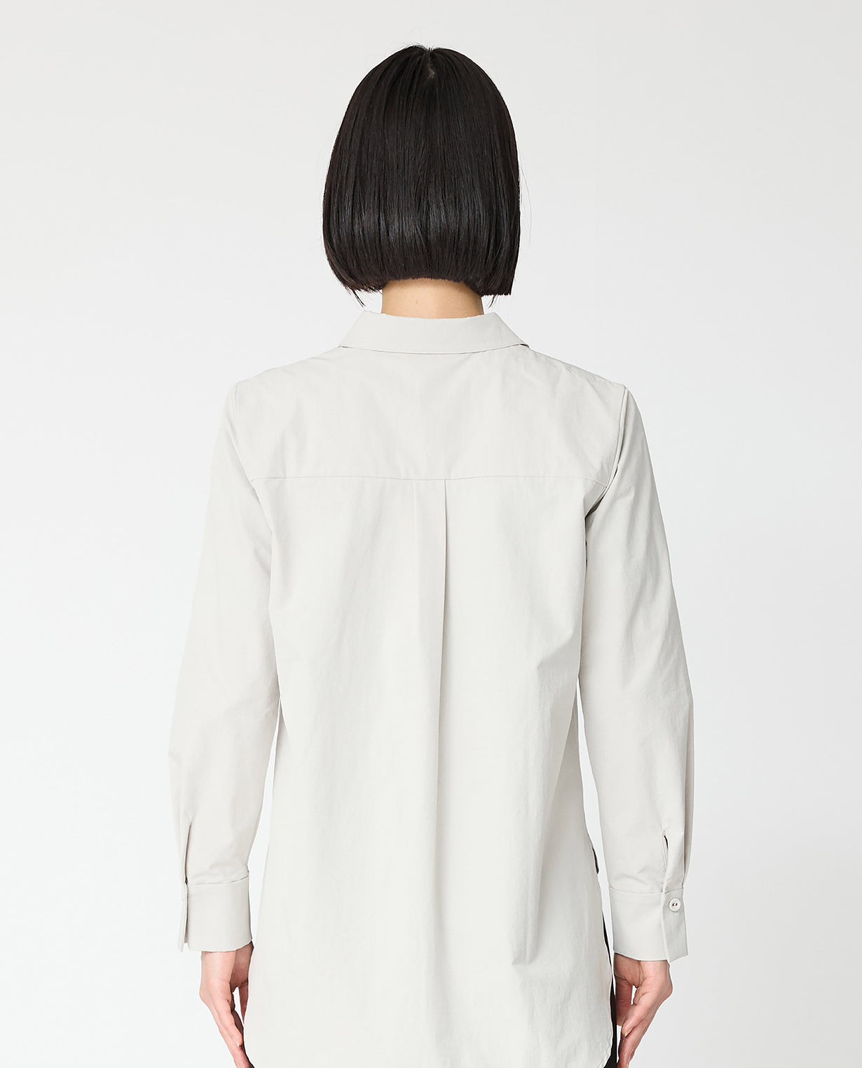 第一ボタンを開けた際に胸元が最も美しく見えるよう、ボタンの配置間隔にこだわり、カフスのボタンも中央ではなく付け根寄りに配置。これにより、トレンドの長めカフスデザインに大人っぽいニュアンスを加えました。カフスをまくっても美しく収まる設計です。