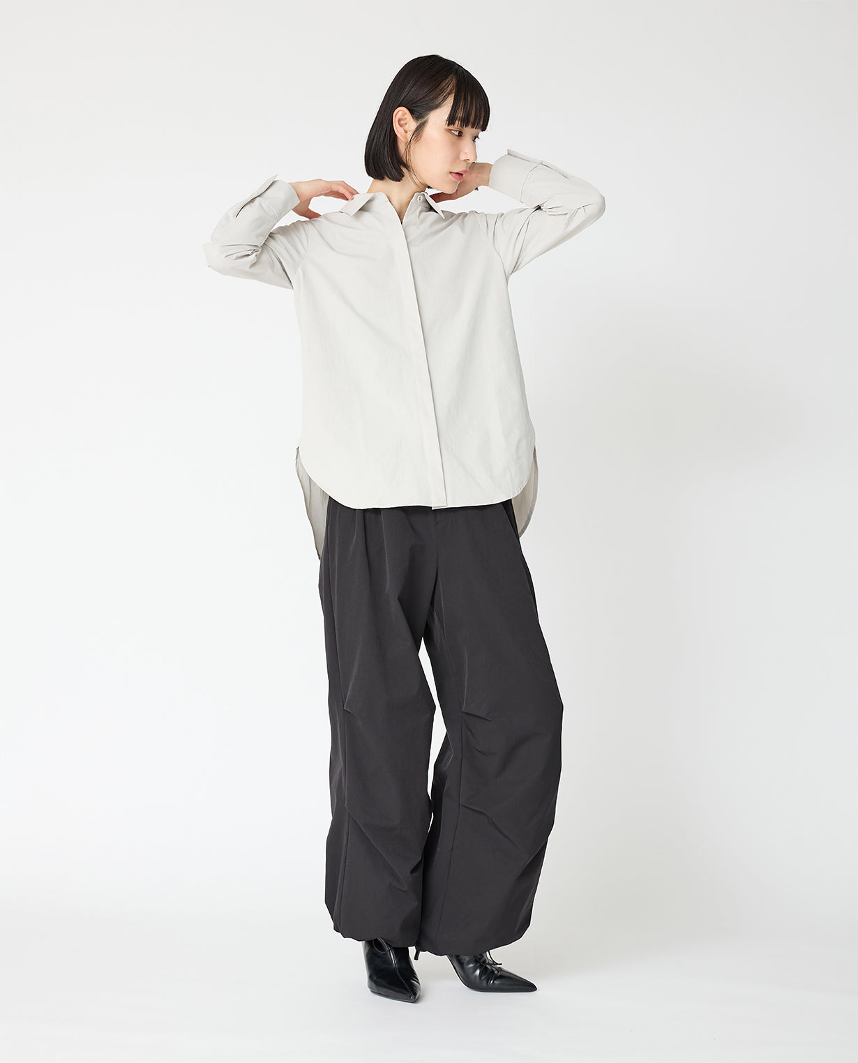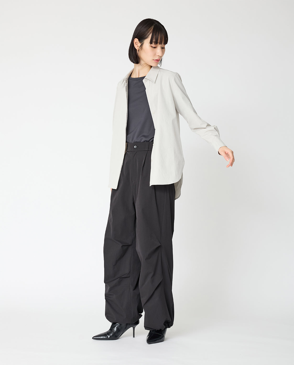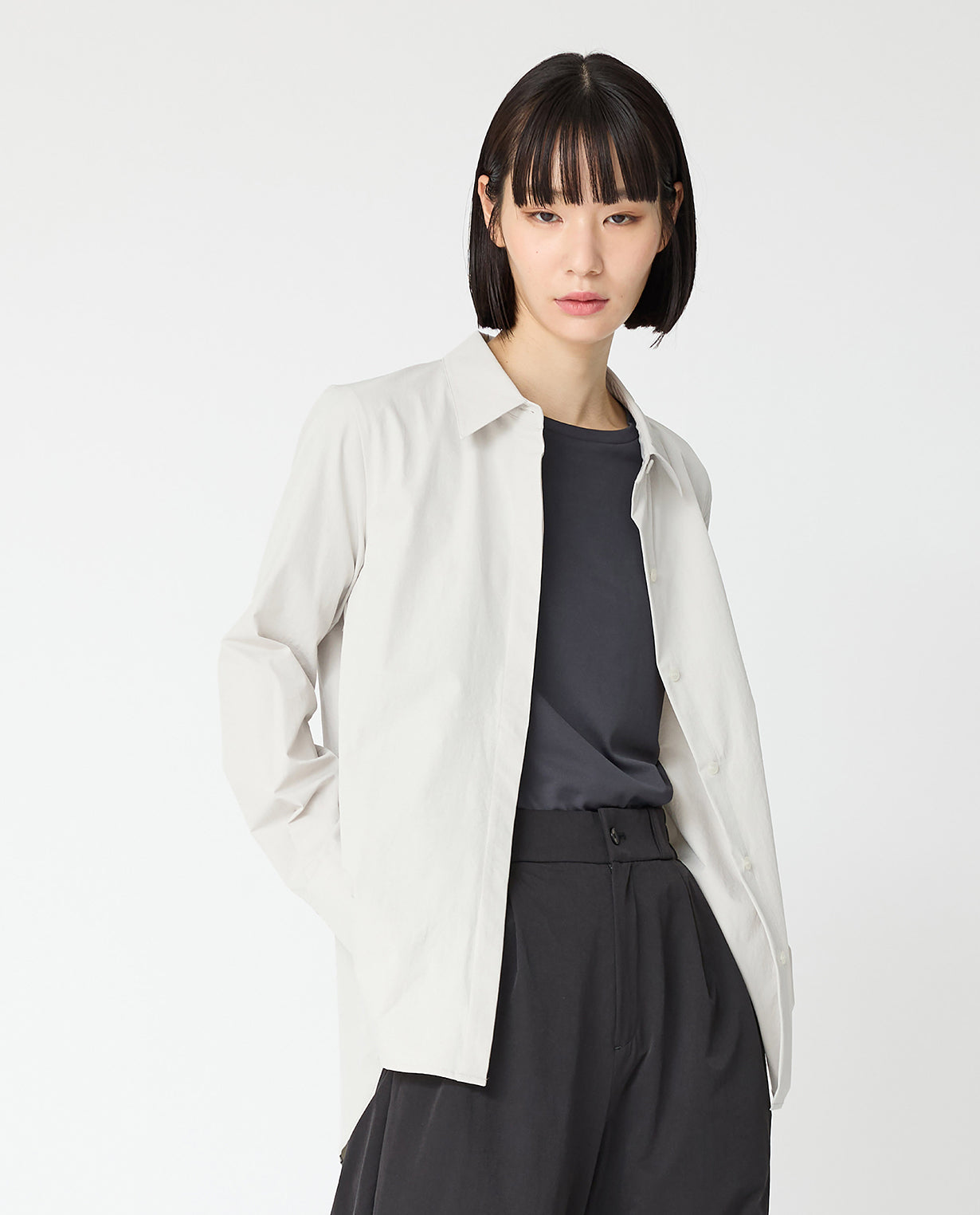 カジナイロンの仮撚(かりより)加工技術を活用し、収縮率の異なる糸を組み合わせた独自開発のL生地を使用。ストレッチ性を備えつつ、天然素材のような風合いが特徴です。微マットなテクスチャーが軽やかさと程よいハリ感を両立し、ドライでさらりとした肌触りを実現。速乾性にも優れたイージーケア素材です。