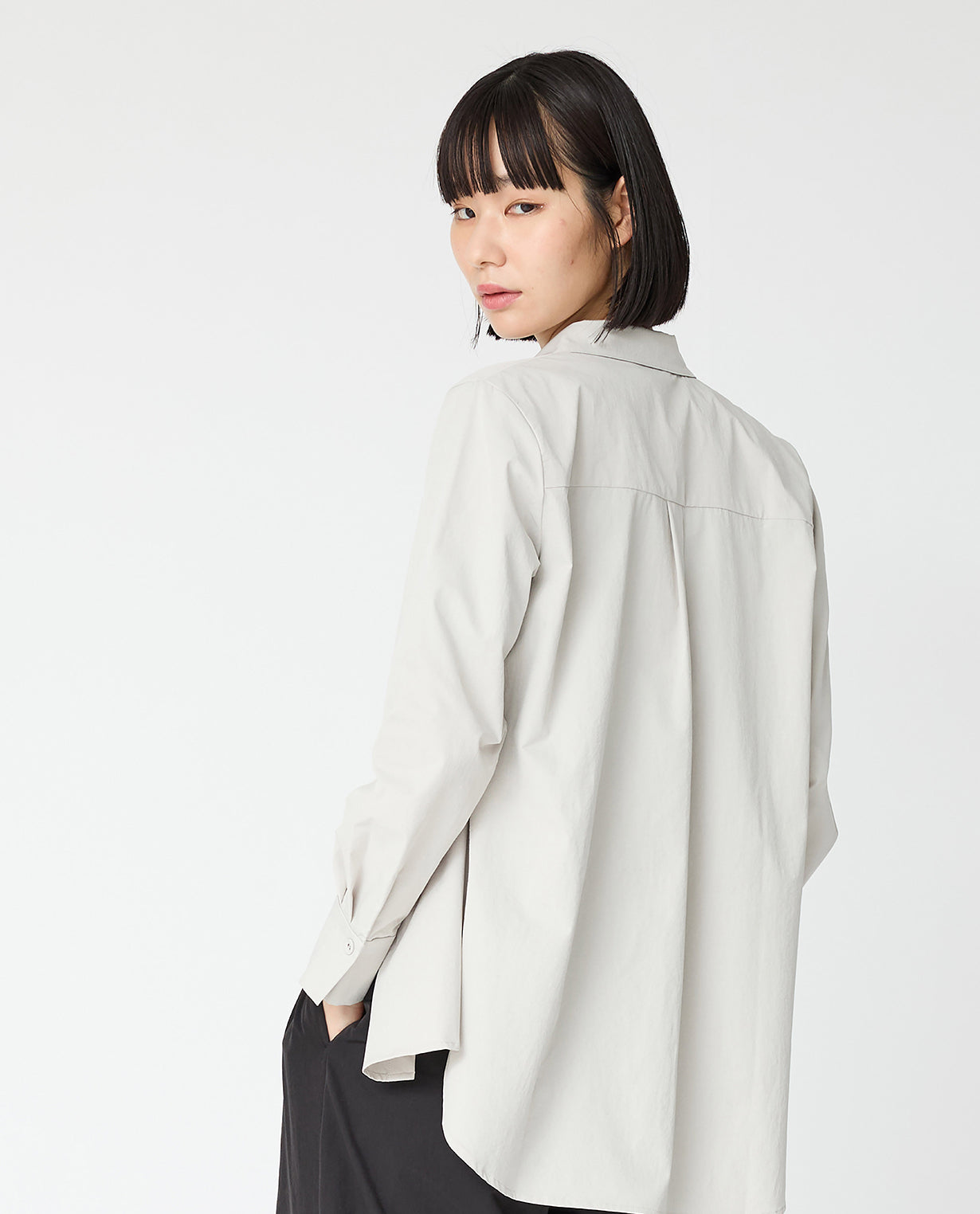 後ろ身頃はヒップラインをしっかりカバーする長めの着丈、前身頃は短めに設計されており、タックインや裾を結ぶスタイルなど、多彩な着こなしが可能。ナチュラルフィットのボクシーなシルエットとベーシックなカラー展開で、オールシーズン活躍するアイテムです。