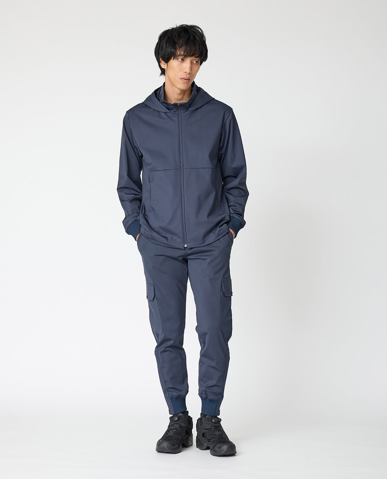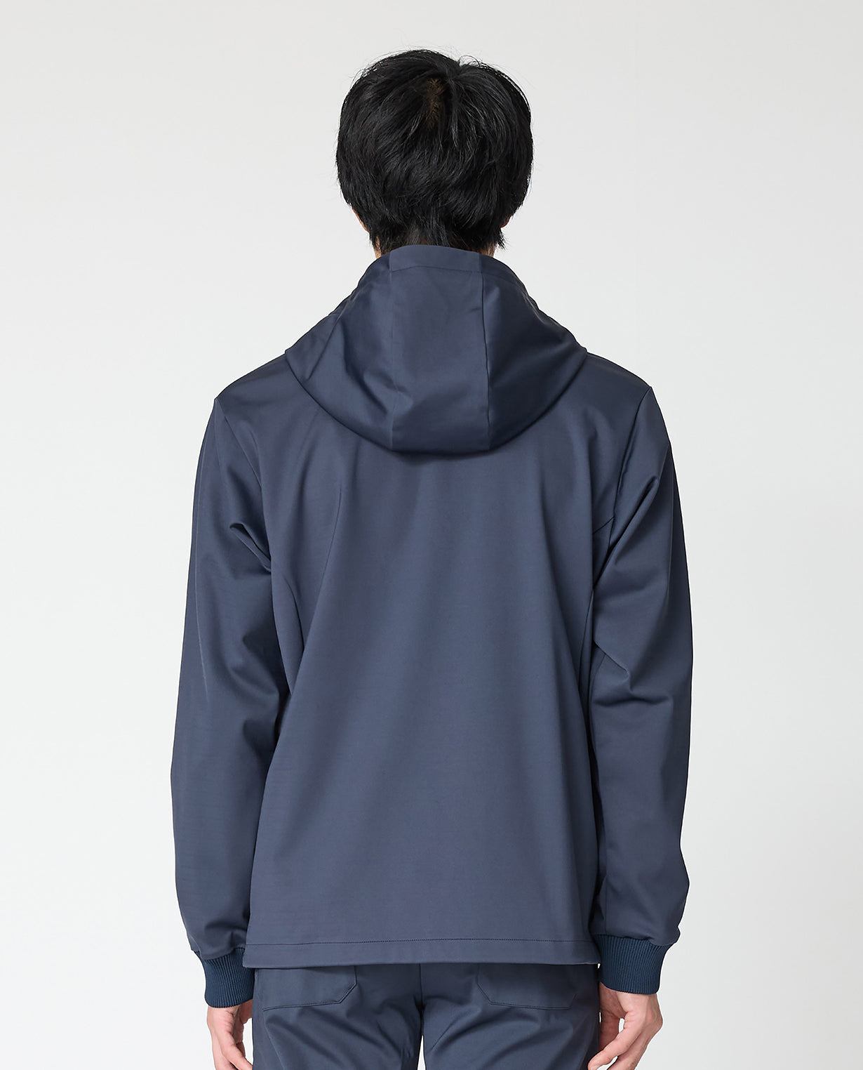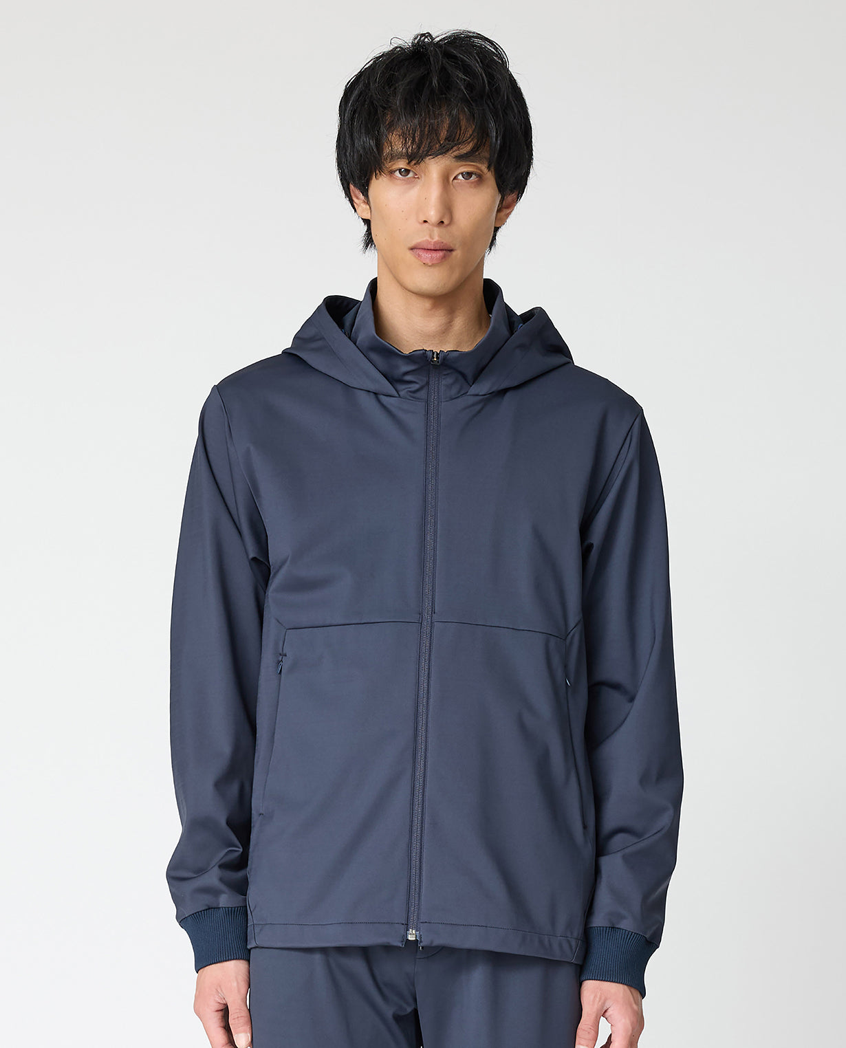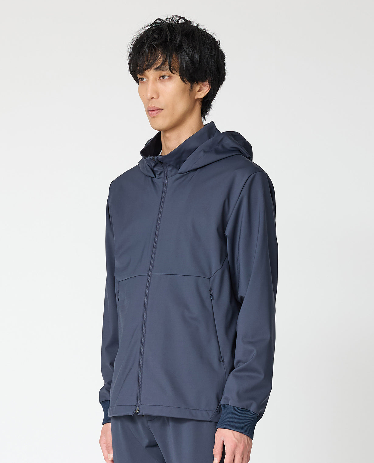 ■ 素材「24HR-WEARABLE(24時間着ていたい)」をコンセプトにした本シリーズには、石川県発のテキスタイルブランド「KAJIf(カジフ)」の生地を採用。ハイゲージダブルニットで編み上げられたN生地は、滑らかで柔らかい肌触りと、身体の動きにしなやかに追従するハイパワーストレッチ性が特徴です。マットで美しい表面は高密度ならでは。さらに、撥水加工も施されており、急な天候変化にも対応可能です。合成繊維の持つ機能性と取り扱いやすさを活かしながら、上質感を備えています。■ デザインフロントジップにフードを組み合わせたフーデッドジャケット。襟もとはスタンドカラー仕様になっており、ファスナーを上まで閉めることで首元をしっかりとカバーし、シャープで都会的な印象を与えます。切り替えラインを効かせたミニマルなデザインに、ジップ付きサイドポケットを備えることで、シンプルながらも機能性を兼備。袖口と裾にはリブを配し、程よいフィット感と動きやすさを両立しています。日常使いからアクティブシーンまで幅広く活躍する、洗練された一枚です。■ スタイリングスタンドカラーとフードを備えた、ミニマルで都会的なデザインのフーディー。カットソーと合わせた軽快なカジュアルスタイルから、スラックスやレザーシューズを組み合わせたスマートな着こなしまで対応できる、汎用性の高い一着です。■ 同じ生地のセットアップを見るN生地■ 同じ生地のアイテムを見るN生地