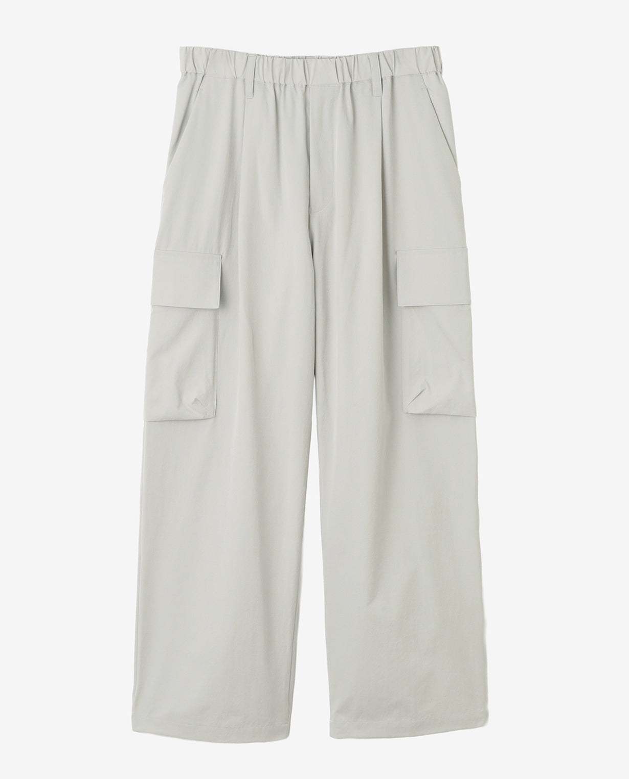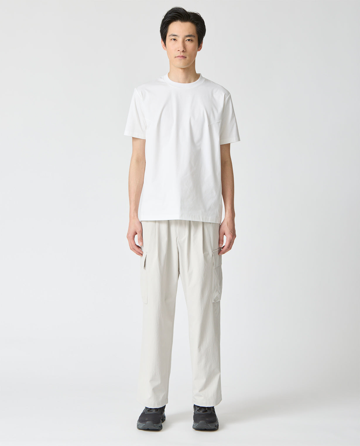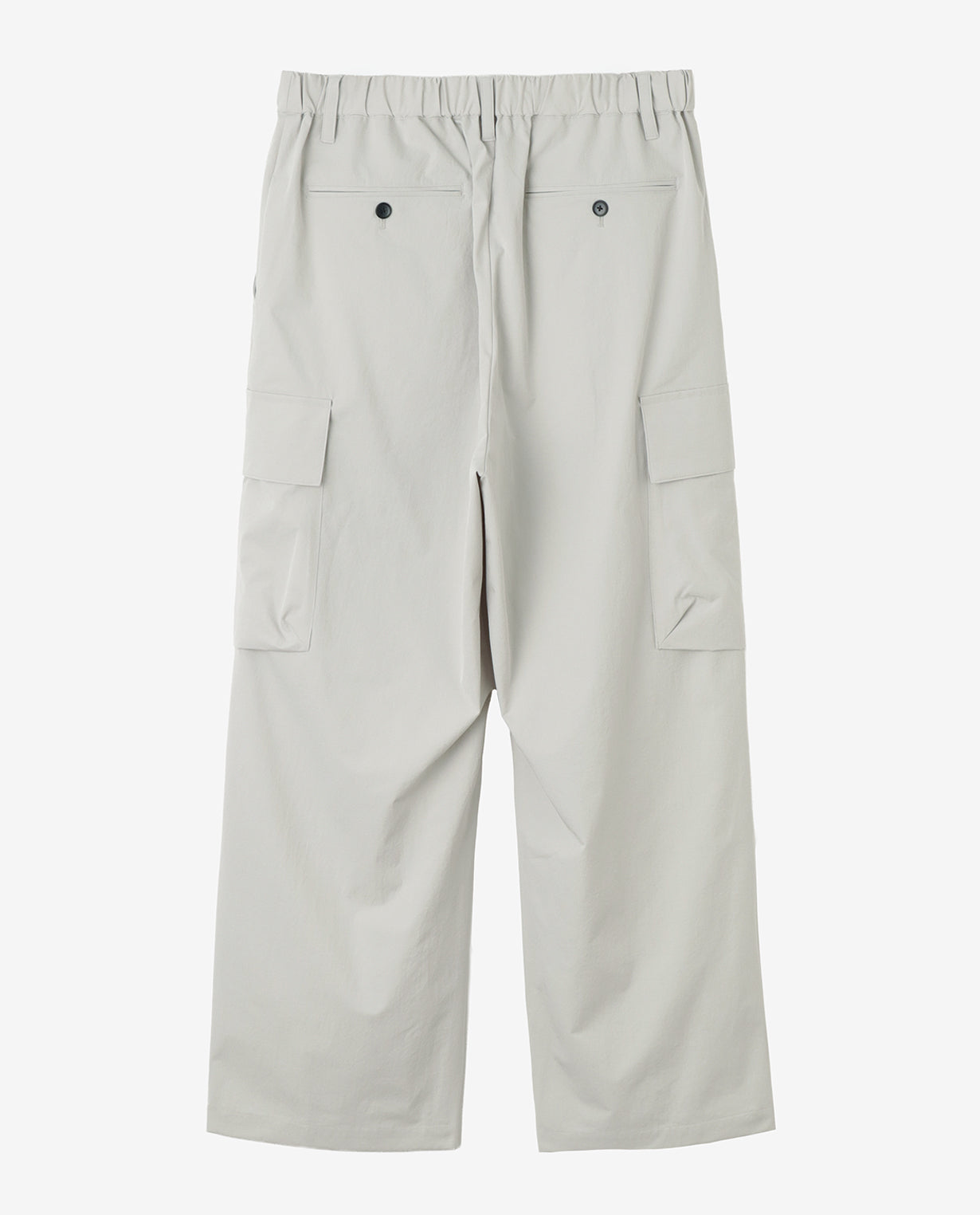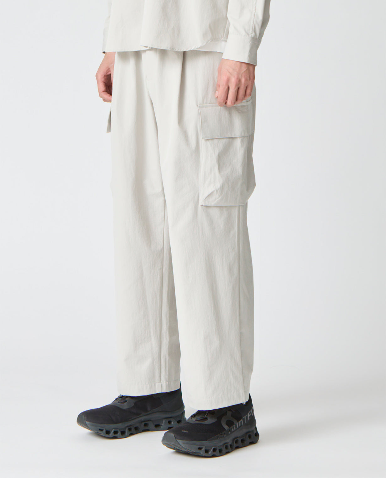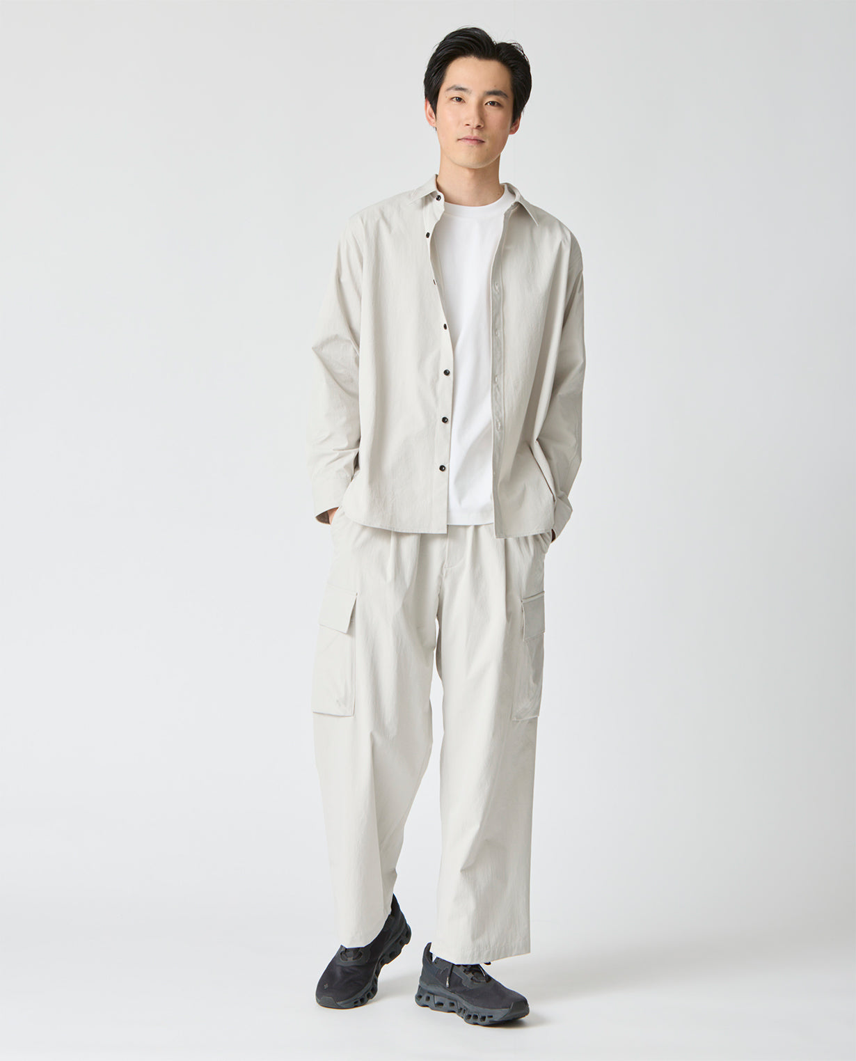 ■ 素材カジナイロンの仮撚(かりより)加工技術を活用し、収縮率の異なる糸を組み合わせた独自開発のL生地を使用。ストレッチ性を備えながら、天然素材のようなナチュラルな風合いが魅力です。微マットなテクスチャーが軽やかさと程よいハリ感を両立し、ドライでさらりとした肌触りを実現。速乾性にも優れ、イージーケアな点もポイントです。快適な着心地と抜け感のあるシルエットで人気を集め、さまざまなアイテムが展開されています。■ デザイン分量感のあるストレートシルエットで構築した、ワイド設計のカーゴパンツ。腰まわりから裾にかけて落ちる直線的なラインが、力みのない佇まいを生み出します。ウエストは総ゴム仕様にドローコードを備え、フィット感を自在に調整可能。ベルトループも配置しており、スタイルに応じたアレンジにも対応します。両腿にはフラップ付きのカーゴポケットを配置。立体的すぎないフラットな設計にすることで、無骨さを抑えた都会的な印象に仕上げています。加えて、脇ポケットと背面ポケットも備え、収納力を確保しています。裾幅は広めに設定し、シューズとのバランスを取りやすい設計。ボリュームを活かしたコーディネートはもちろん、トップスをタックインすることでウエストまわりをすっきりと見せる着こなしも可能です。機能性とミニマルな表情を両立した、現代的なワイドカーゴパンツです。■ スタイリングボリュームのあるシルエットを活かし、トップスはコンパクトなカットソーやシャツを合わせることで全体が引き締まります。同素材のトップスと組み合わせれば、統一感のあるセットアップスタイルとしても着用可能。足元はレザーシューズで端正に、スニーカーで軽快にと、合わせる一足で印象の変化を楽しめます。■ 同じ生地のアイテムを見るL生地 (MEN)