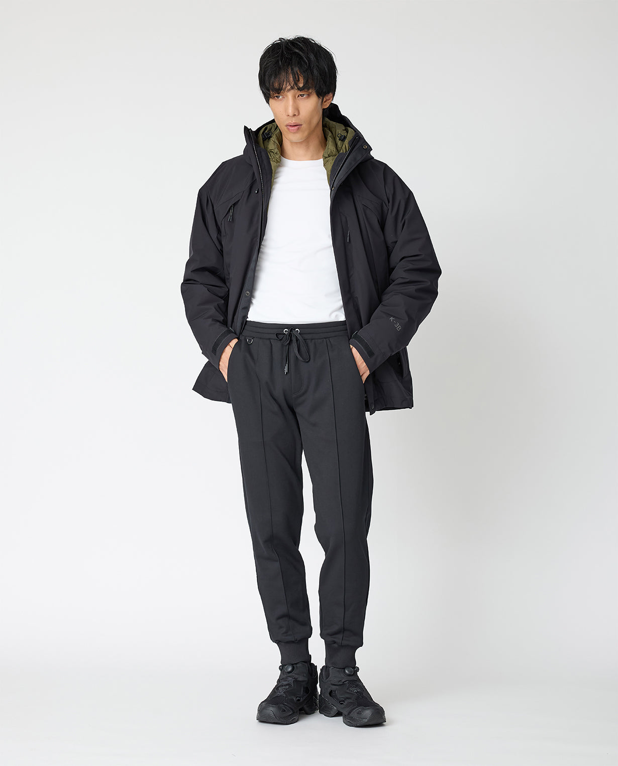 K-3B's specialty is this urban jogger with a streamlined silhouette. The pin-tuck crease on the front creates a more beautiful leg effect. The waist is fully elastic and shirred for a light feel.
