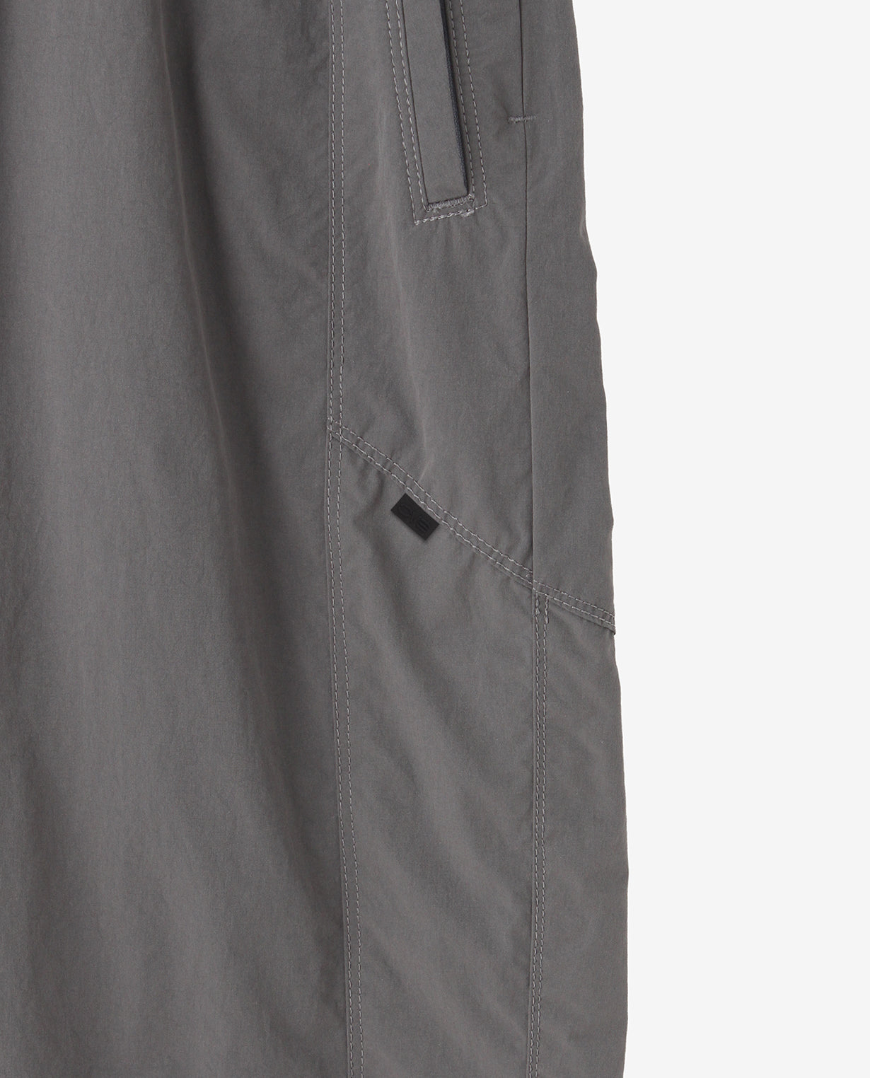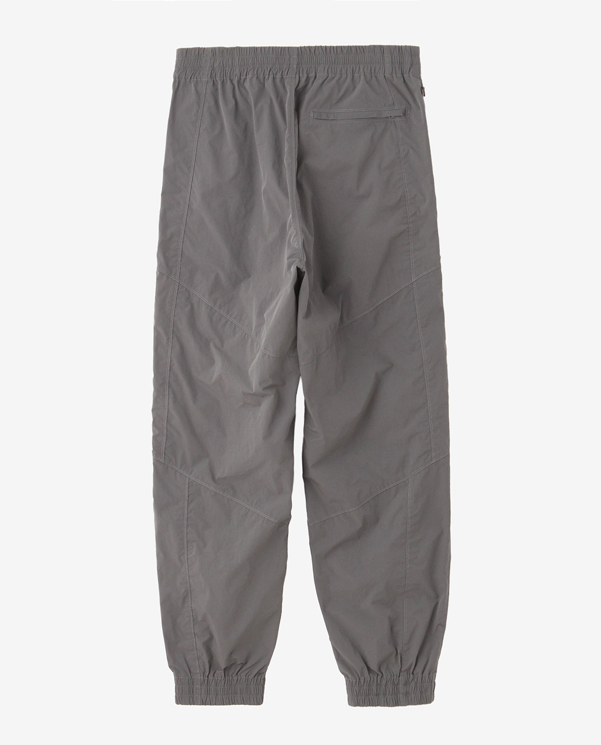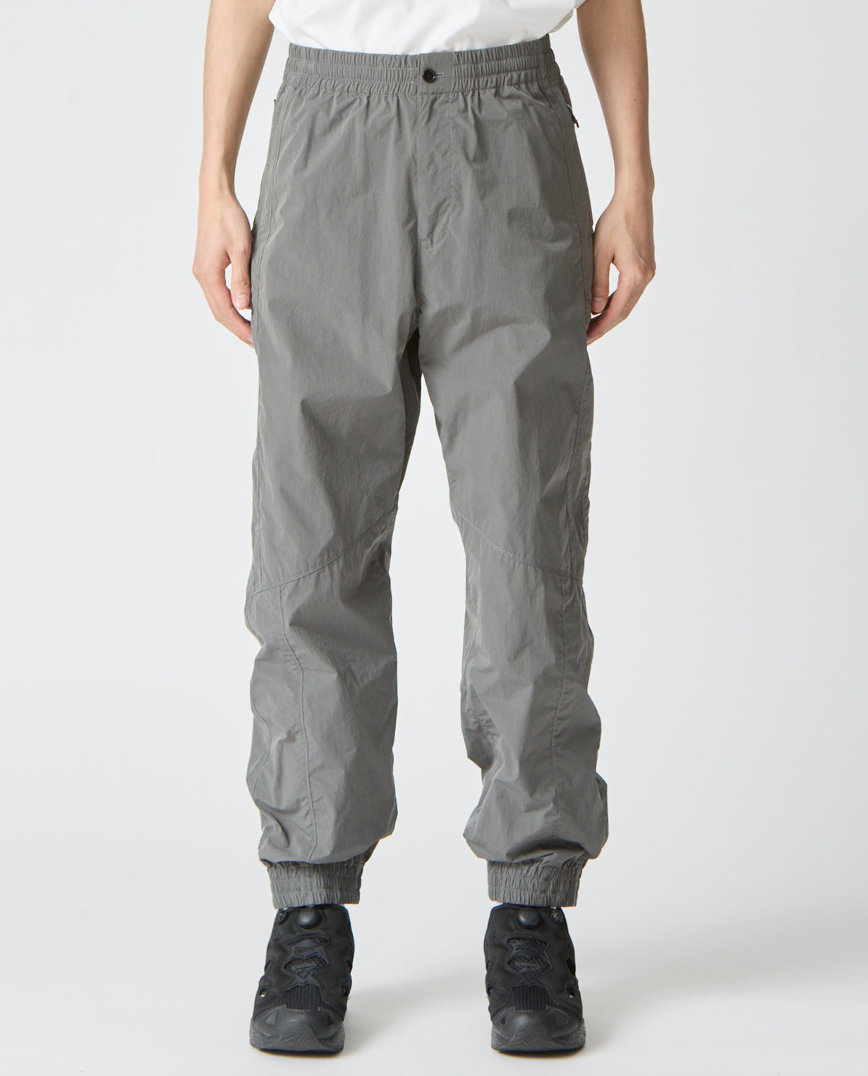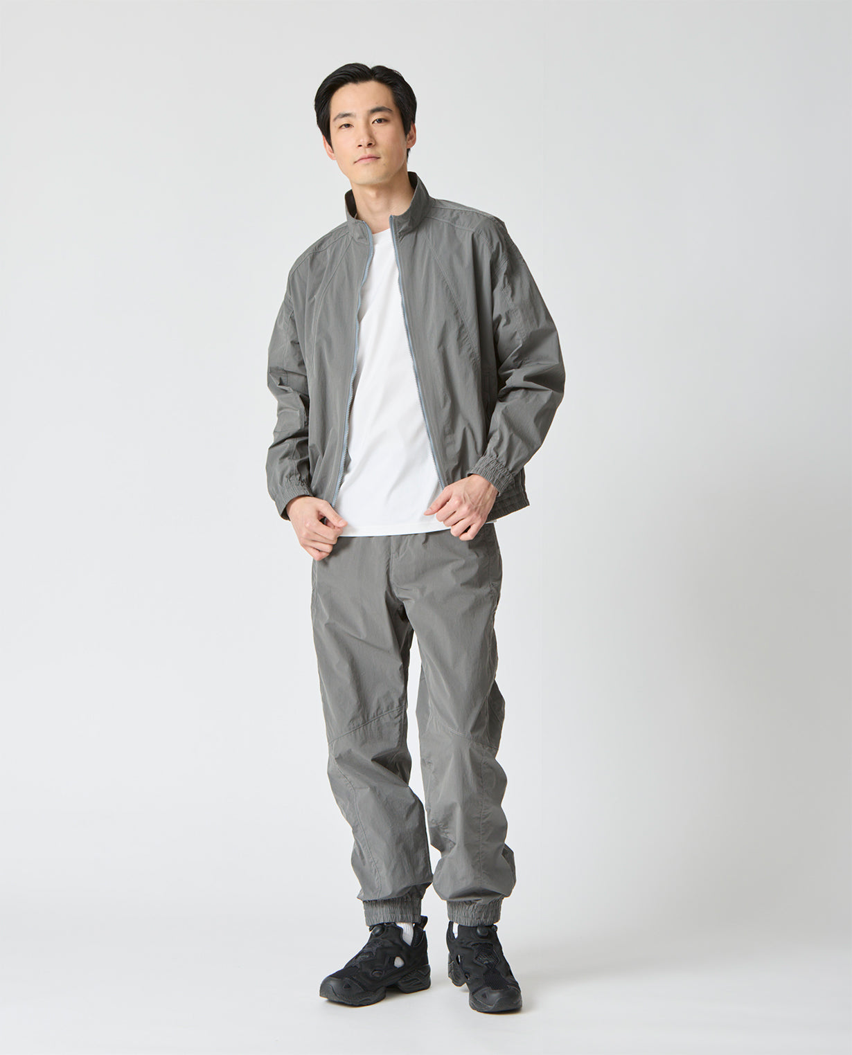 ■ 素材触れた瞬間に、違いが分かる。OVS生地は、今回のカプセルコレクションのために当社の生地ブランド「KAJIF(カジフ)」が手がけた新素材です。ナイロン100%でありながら、これまでにない表情と触り心地を実現するために設計。軽さや機能性だけを追い求めるのではなく、「表面の美しさ」と「素材としての存在感」を最優先に開発されました。加工だけに頼らず、糸の選定、タテ・ヨコの組織、打ち込み密度のバランスを細かく調整することで、パリッとした乾いたタッチと、芯のあるハリ感を両立。ゴワつきや過度なシャカシャカ感を抑えながら、機能服としても成立する上品さを保っています。着用時には、動いたときの立体感や自然なシワの入り方が美しく、夏場でも肌に張りつきにくいドライな着用感を発揮。軽さや撥水性といった機能だけでは語れない、素材そのものの存在が際立つナイロン生地です。■ デザインOVS(オーバーサイズ)を下半身の設計に落とし込んだ、パネルディメンションジョガー。身体を覆うのではなく、包み込みながら余白を設計するという考え方のもと、脚の動きとシルエットの両立を目指しています。前後・内外に分割されたパネル構成により、ヒップから太ももにかけてはゆとりを確保しつつ、膝下は過度に広がらない立体バランスを形成。オーバーサイズ特有のルーズさを抑え、動いたときにこそ美しく見える輪郭を作り出しています。股下から膝、ふくらはぎへと続く切替ラインは、脚の屈伸や歩行時のストレスを軽減するための機能的設計。同時に、脚線を分断せず縦の流れを強調することで、分量感のあるシルエットをすっきりと見せています。ウエストはイージー仕様ながら、腰まわりの分量を精密にコントロールすることで、穿いた瞬間に自然と収まる設計に。裾のリブも、オーバーサイズのボリュームをまとめる役割を担い、全体のバランスを整えています。さらに、OVSシリーズ専用のピスネームを取り付けることで、本シリーズならではのコンセプトとアイデンティティを静かに主張しています。OVSというサイズ思想を、構造・分量・動きのすべてで成立させた、K-3Bらしい一本です。 ■ 同じコレクションのアイテムを見る OVS コレクション ■ YouTubeで動画を見る 同じナイロンでも、ここまで違う。糸設計が生地を変える:テキスタイルメーカー発K-3Bの素材講座 | EP.002【K-3B Textile Lab】