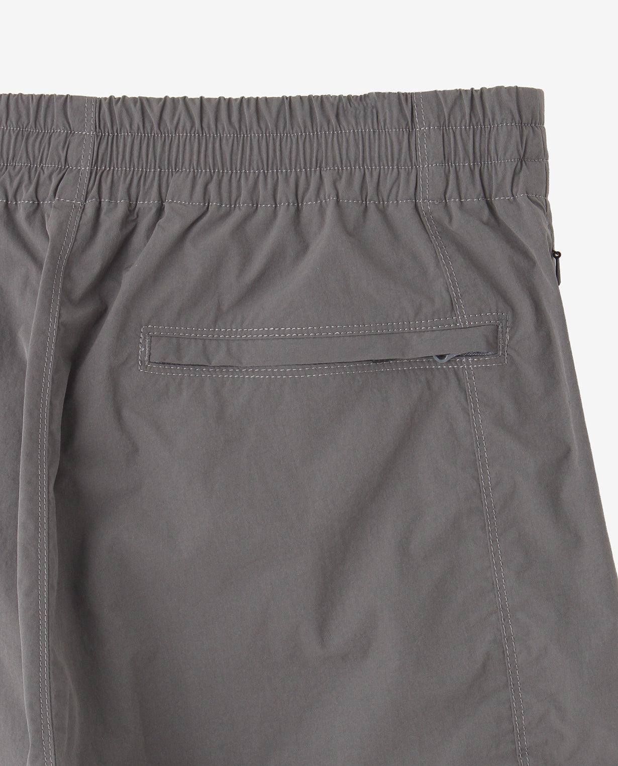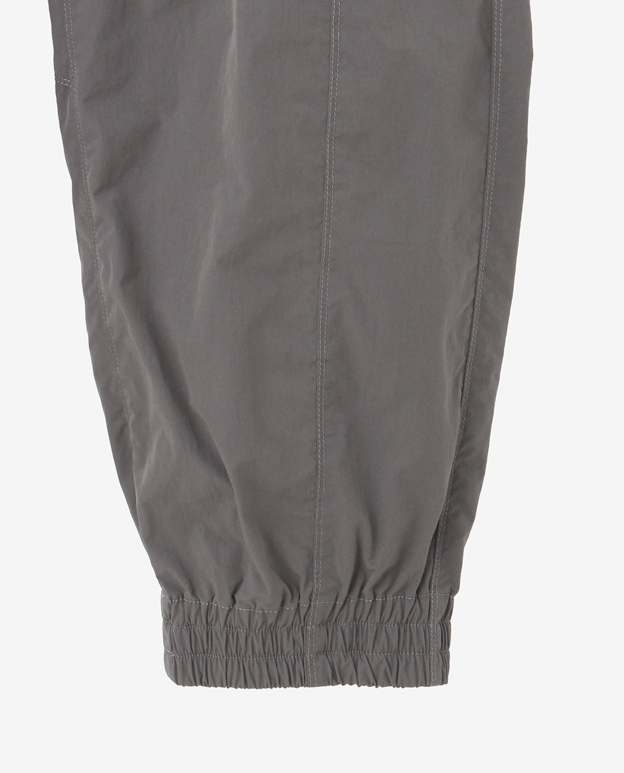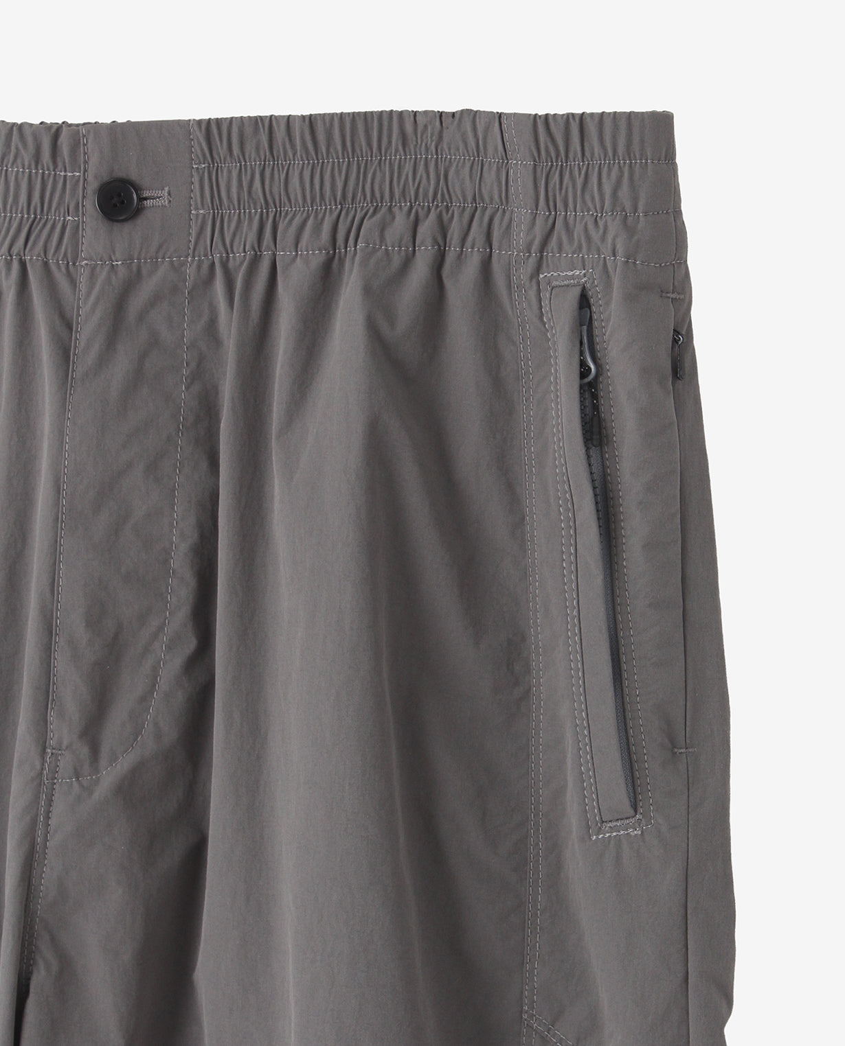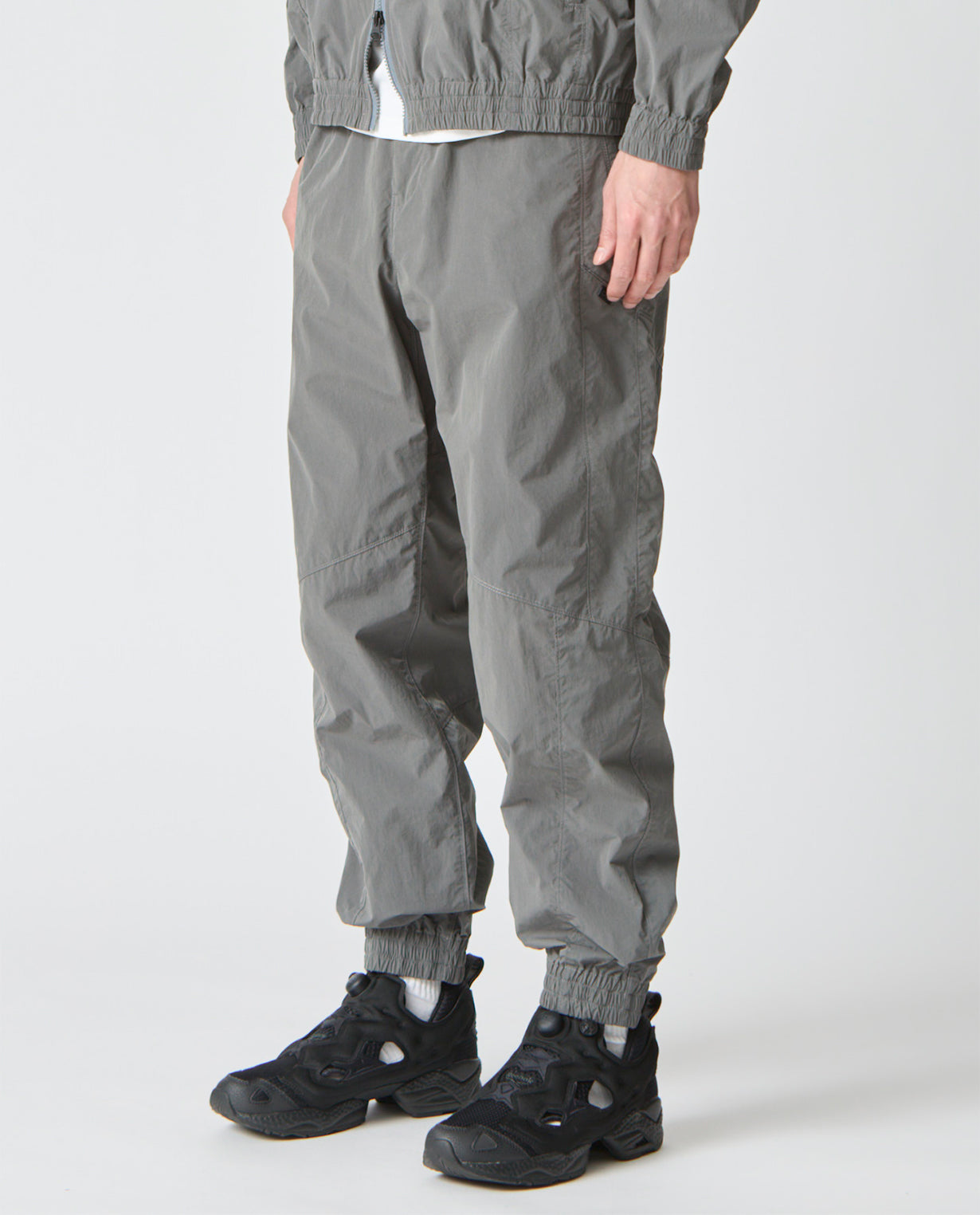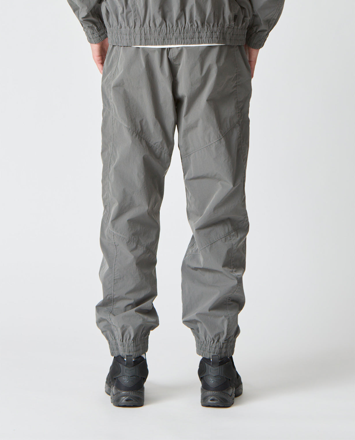 ■ 素材触れた瞬間に、違いが分かる。OVS生地は、今回のカプセルコレクションのために当社の生地ブランド「KAJIF(カジフ)」が手がけた新素材です。ナイロン100%でありながら、これまでにない表情と触り心地を実現するために設計。軽さや機能性だけを追い求めるのではなく、「表面の美しさ」と「素材としての存在感」を最優先に開発されました。加工だけに頼らず、糸の選定、タテ・ヨコの組織、打ち込み密度のバランスを細かく調整することで、パリッとした乾いたタッチと、芯のあるハリ感を両立。ゴワつきや過度なシャカシャカ感を抑えながら、機能服としても成立する上品さを保っています。着用時には、動いたときの立体感や自然なシワの入り方が美しく、夏場でも肌に張りつきにくいドライな着用感を発揮。軽さや撥水性といった機能だけでは語れない、素材そのものの存在が際立つナイロン生地です。■ デザインOVS(オーバーサイズ)を下半身の設計に落とし込んだ、パネルディメンションジョガー。身体を覆うのではなく、包み込みながら余白を設計するという考え方のもと、脚の動きとシルエットの両立を目指しています。前後・内外に分割されたパネル構成により、ヒップから太ももにかけてはゆとりを確保しつつ、膝下は過度に広がらない立体バランスを形成。オーバーサイズ特有のルーズさを抑え、動いたときにこそ美しく見える輪郭を作り出しています。股下から膝、ふくらはぎへと続く切替ラインは、脚の屈伸や歩行時のストレスを軽減するための機能的設計。同時に、脚線を分断せず縦の流れを強調することで、分量感のあるシルエットをすっきりと見せています。ウエストはイージー仕様ながら、腰まわりの分量を精密にコントロールすることで、穿いた瞬間に自然と収まる設計に。裾のリブも、オーバーサイズのボリュームをまとめる役割を担い、全体のバランスを整えています。さらに、OVSシリーズ専用のピスネームを取り付けることで、本シリーズならではのコンセプトとアイデンティティを静かに主張しています。OVSというサイズ思想を、構造・分量・動きのすべてで成立させた、K-3Bらしい一本です。 ■ 同じコレクションのアイテムを見る OVS コレクション ■ YouTubeで動画を見る 同じナイロンでも、ここまで違う。糸設計が生地を変える:テキスタイルメーカー発K-3Bの素材講座 | EP.002【K-3B Textile Lab】