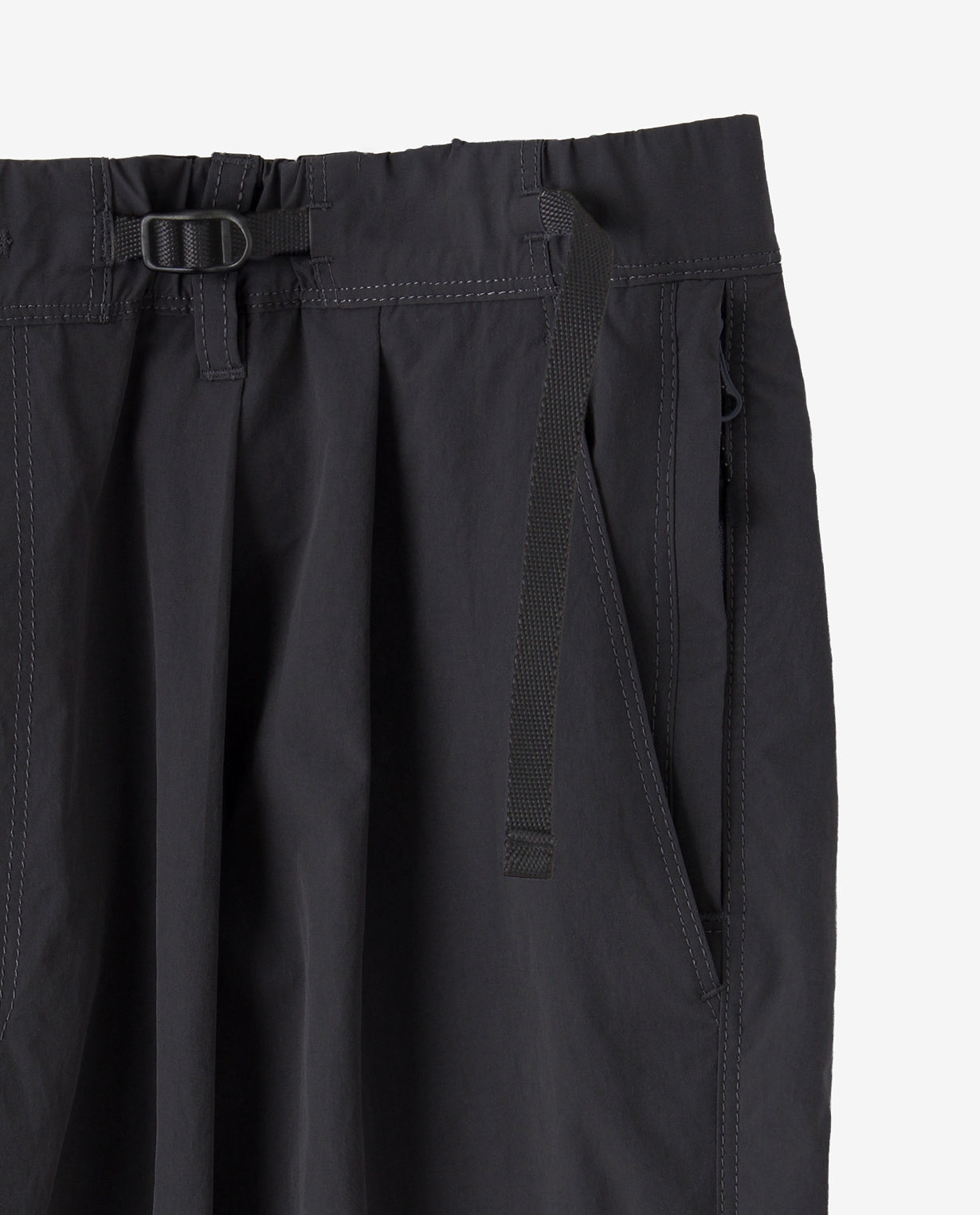 フロントには適度な分量を持たせたタックを配置し、腰まわりに自然な立体感を形成。