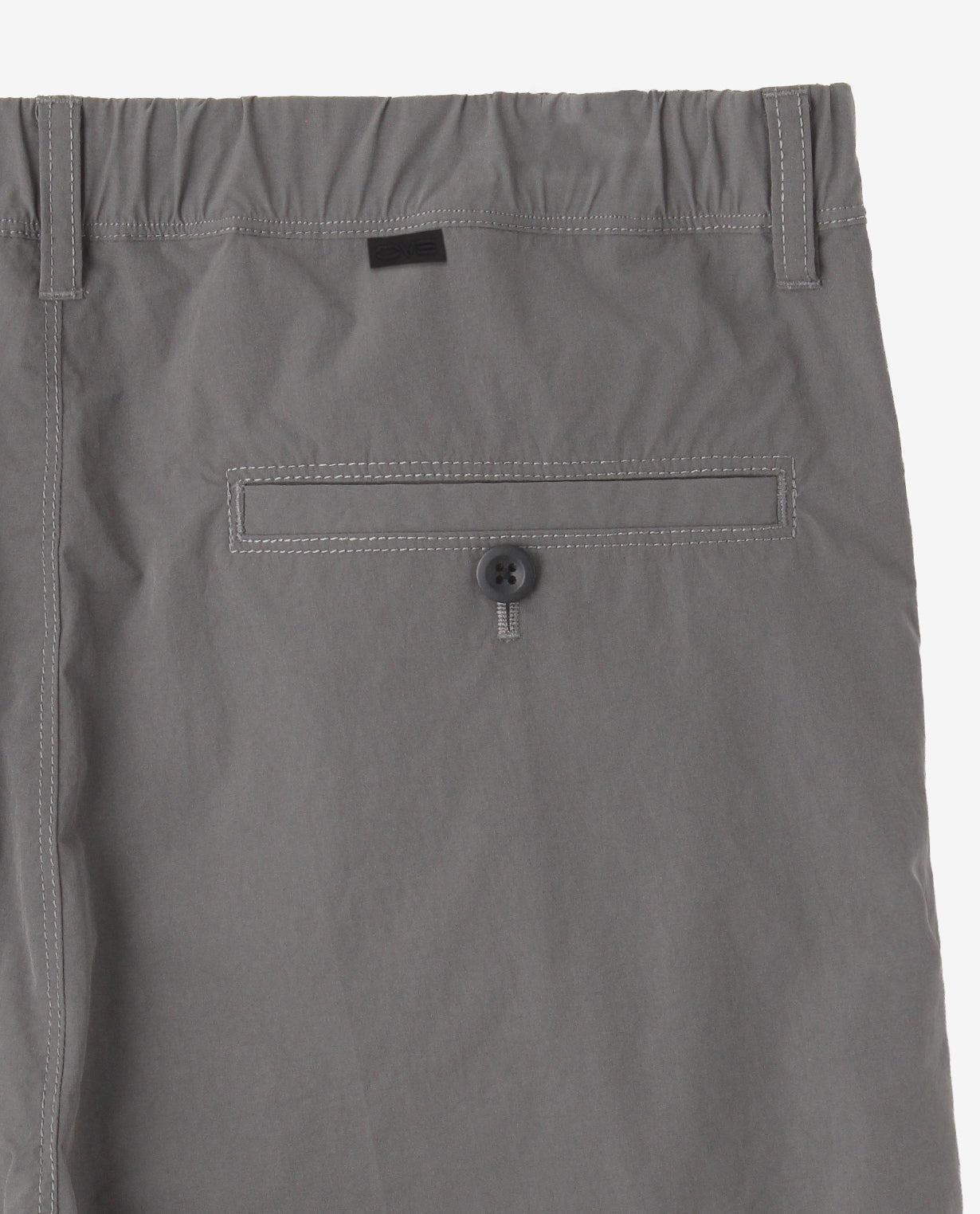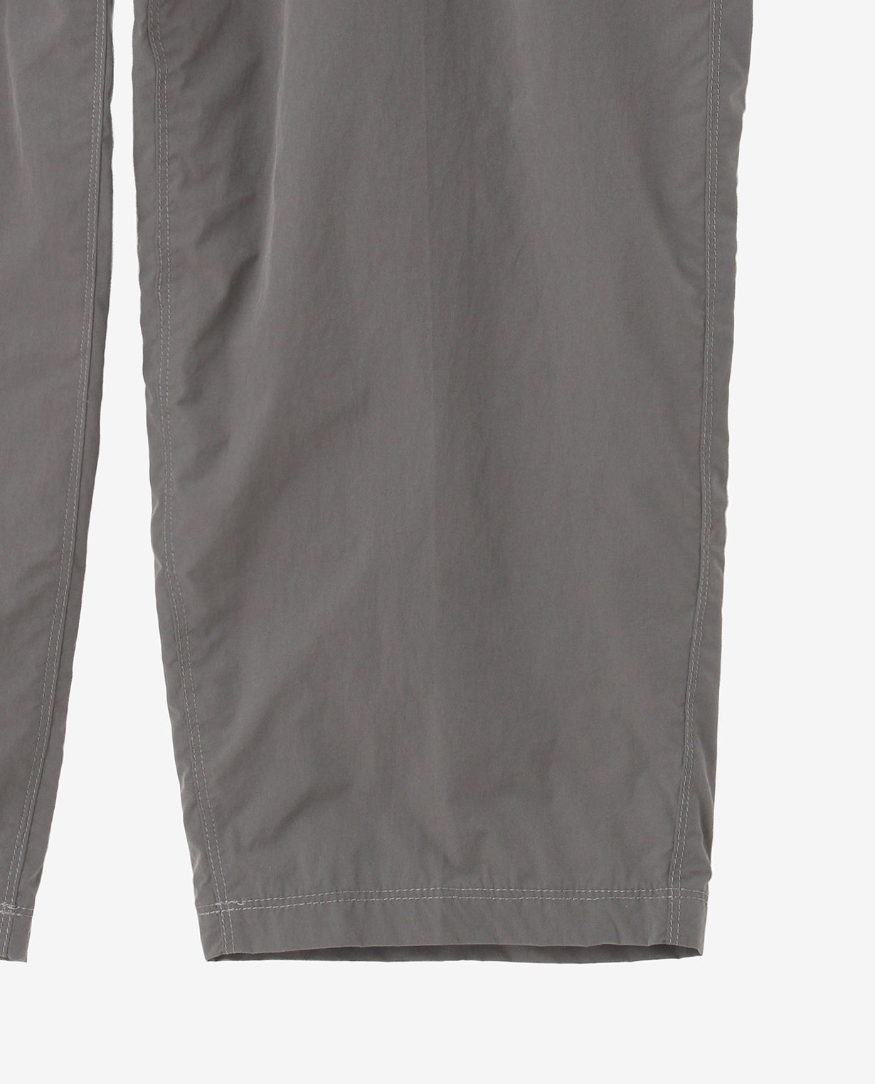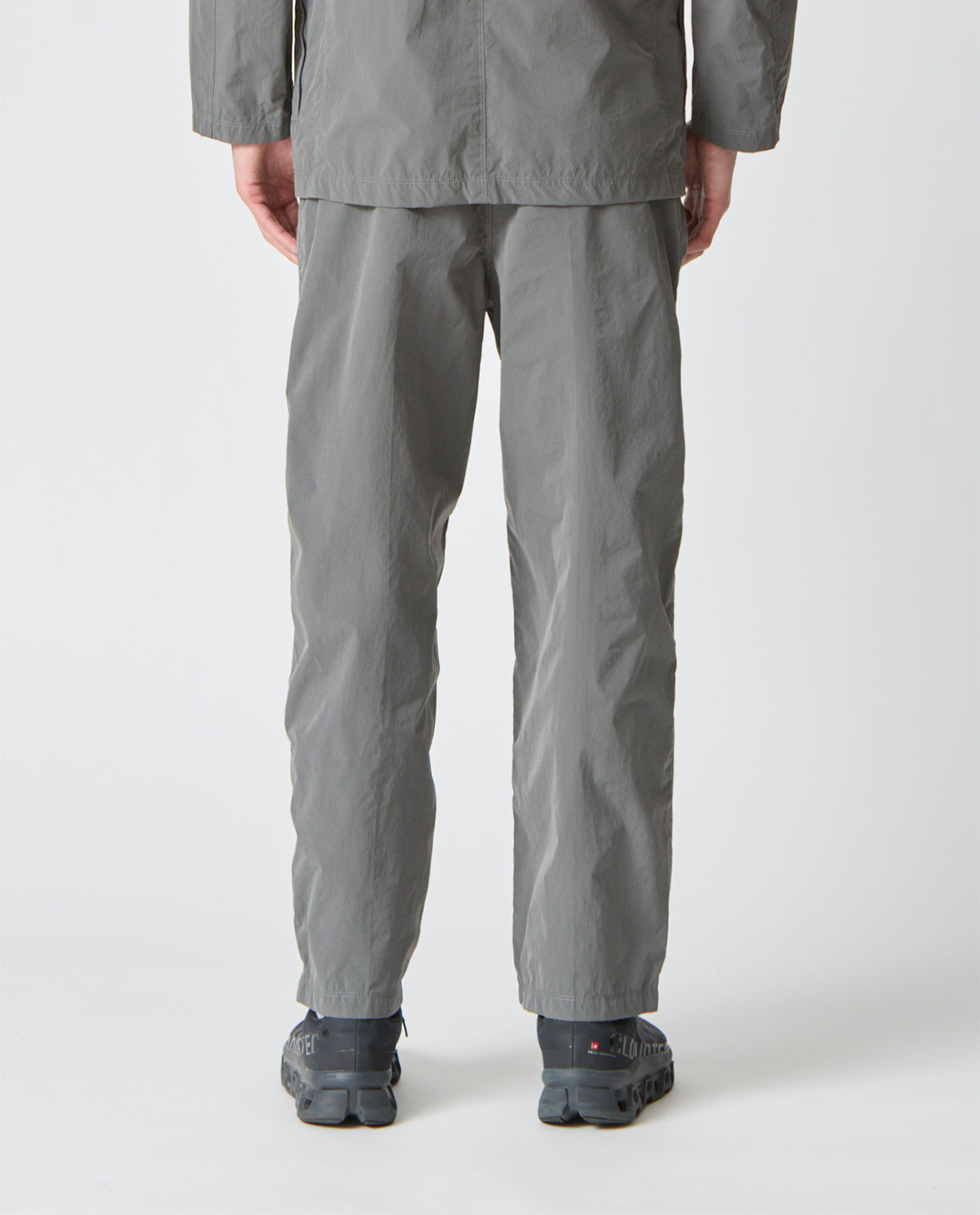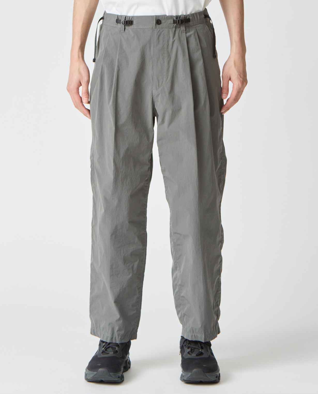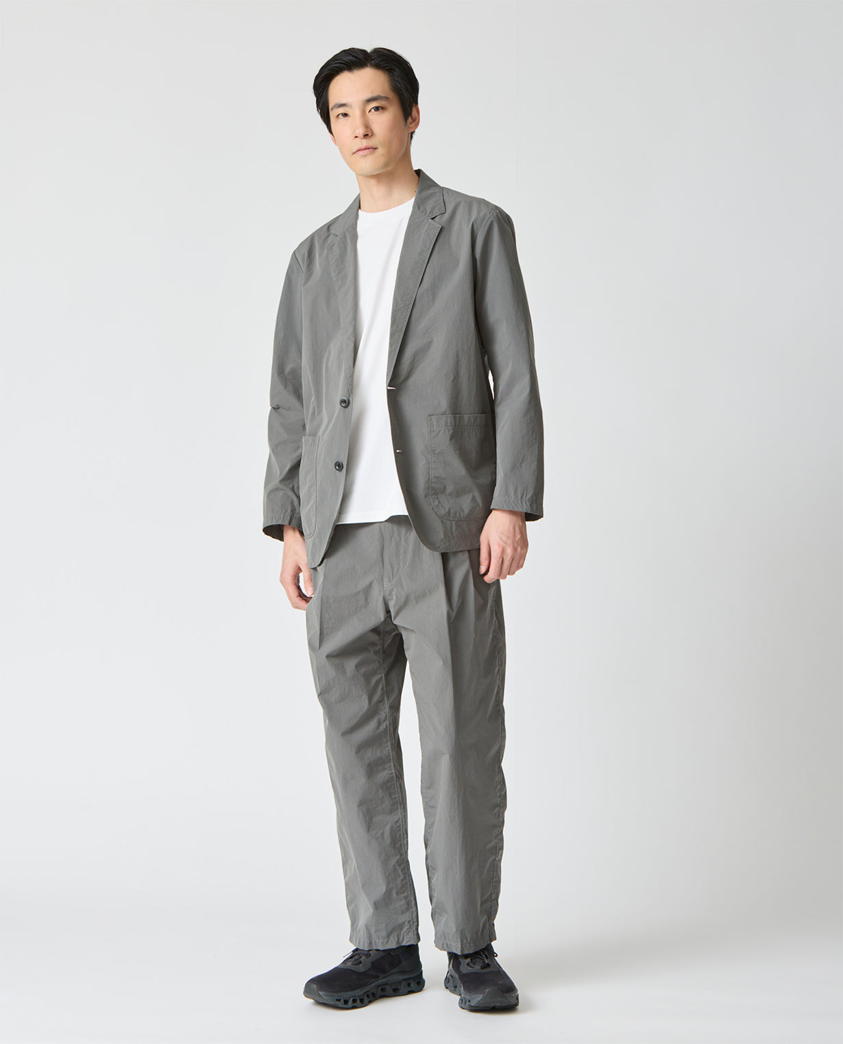 ■ 素材触れた瞬間に、違いが分かる。OVS生地は、今回のカプセルコレクションのために当社の生地ブランド「KAJIF(カジフ)」が手がけた新素材です。ナイロン100%でありながら、これまでにない表情と触り心地を実現するために設計。軽さや機能性だけを追い求めるのではなく、「表面の美しさ」と「素材としての存在感」を最優先に開発されました。加工だけに頼らず、糸の選定、タテ・ヨコの組織、打ち込み密度のバランスを細かく調整することで、パリッとした乾いたタッチと、芯のあるハリ感を両立。ゴワつきや過度なシャカシャカ感を抑えながら、機能服としても成立する上品さを保っています。着用時には、動いたときの立体感や自然なシワの入り方が美しく、夏場でも肌に張りつきにくいドライな着用感を発揮。軽さや撥水性といった機能だけでは語れない、素材そのものの存在が際立つナイロン生地です。■ デザインOVSシリーズの思想を、ボトムスとして具現化したワイドディメンションパンツ。単なる太さや分量感に頼るのではなく、パターン構成と素材のハリによって、立体として成立するワイドシルエットを設計しています。OVS生地の乾いたタッチと芯のあるハリ感が、歩行時や着座時にもシルエットを支え、ワイドでありながら輪郭の曖昧さを感じさせない表情を生み出します。フロントには適度な分量を持たせたタックを配置し、腰まわりに自然な立体感を形成。裾に向かってストンと落ちるラインは、身体との距離を保ちながら、過度なボリューム感を抑えています。ウエストはイージー仕様をベースにしながらも、タックインやジャケットスタイルにも対応できる設計。内蔵されたアジャスターやベルト構造により、着用シーンに応じたフィット調整が可能です。縫製にはOVSシリーズ共通のダブルステッチを採用。切替線や縫い目が構造線として機能し、ミニマルな中に無骨さと存在感を与えています。さらに、OVSシリーズ専用のピスネームを取り付けることで、本シリーズならではのコンセプトとアイデンティティを静かに主張しています。トップスを選ばず、OVSジャケットやブルゾンと組み合わせることで、シリーズならではの「構造で完成するセットアップ」を実現。素材・パターン・縫製が一体となり、理知的なワイドシルエットを描き出す一本です。 ■ 同じコレクションのアイテムを見る OVS コレクション ■ YouTubeで動画を見る 同じナイロンでも、ここまで違う。糸設計が生地を変える:テキスタイルメーカー発K-3Bの素材講座 | EP.002【K-3B Textile Lab】
