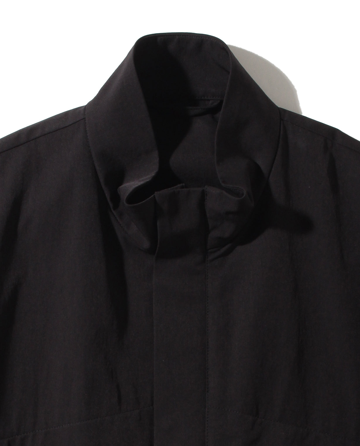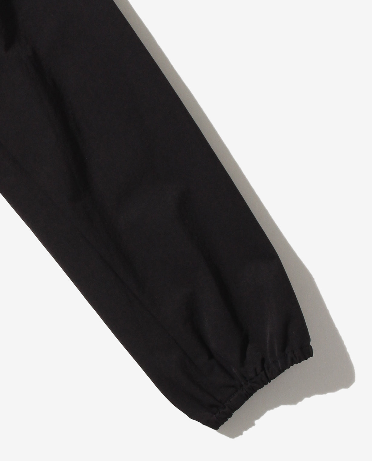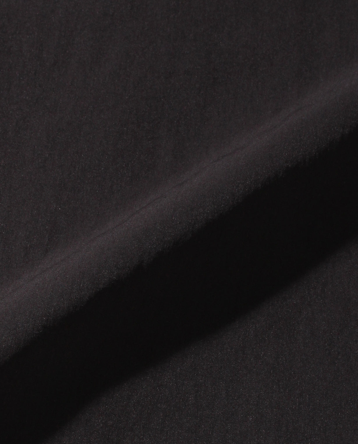 ■ 素材カジナイロンの仮撚(かりより)加工技術を活用し、収縮率の異なる糸を組み合わせて開発した独自のL生地を使用。 ストレッチ性を備えながら、天然素材のようなナチュラルな風合いが魅力です。 微マットなテクスチャーにより、軽やかさと程よいハリ感を両立し、ドライでさらりとした肌触りを実現。 速乾性にも優れたイージーケア素材で、快適な着心地と抜け感のあるシルエットにより、さまざまなアイテムで展開されています。■ デザイン 羽織るだけでモードスポーツな印象をつくる、ミニマルデザインのトラックジャケット。バイカラーの配色と高めのスタンドカラーが顔まわりをシャープに見せ、都会的でクールな雰囲気を演出します。派手な装飾を排除し、生地の美しい表情を活かした上品な仕上がり。家庭洗濯が可能でシワになりにくく、日常からアクティブシーンまで快適に着用できます。腰が隠れる後ろ下がりの着丈と、ゆとりある身幅・ドロップショルダーで動きやすさも抜群。裾にはドローコードを備え、シルエットを自在に調整可能です。フロントはオープンファスナーと隠しスナップボタンの二重仕様で、前立てが衿から裾まで美しく縦に走る構築的なラインを形成。衿先には傾斜をつけ、首元まで閉めても顎に当たらない快適設計です。脇下がりのラインを描く肩ヨークは、トラックジャケットをモダンに再構築したディテール。袖口は細幅のゴムシャーリングで手首に自然にフィットし、スマートウォッチとの干渉もありません。収納は、セキュリティに配慮したファスナーポケット2か所と、切替線を利用したスラッシュポケット2か所の計4か所を装備。デザイン性と機能性を両立した一着です。