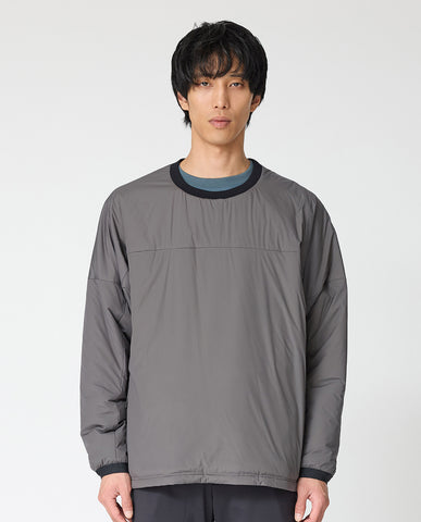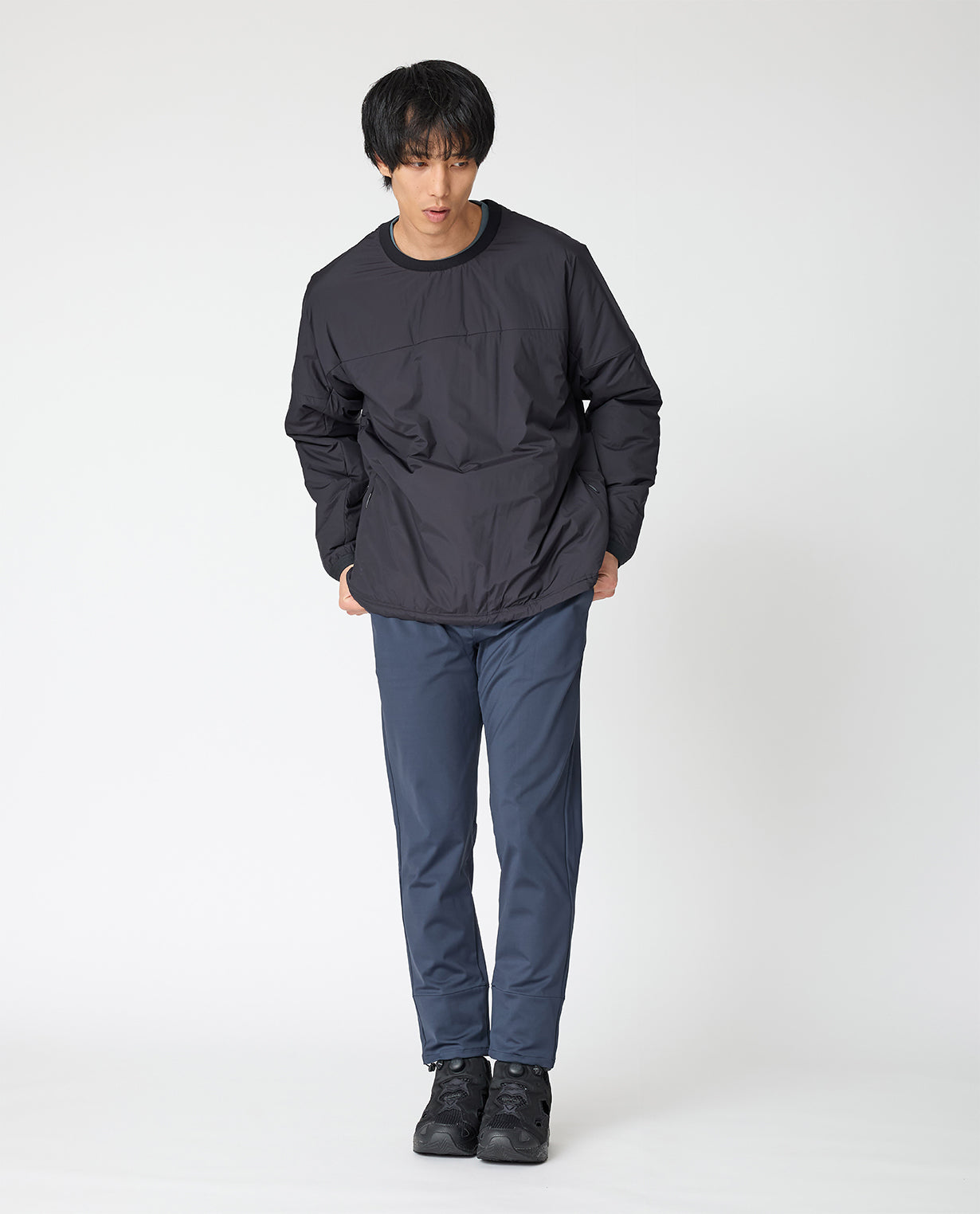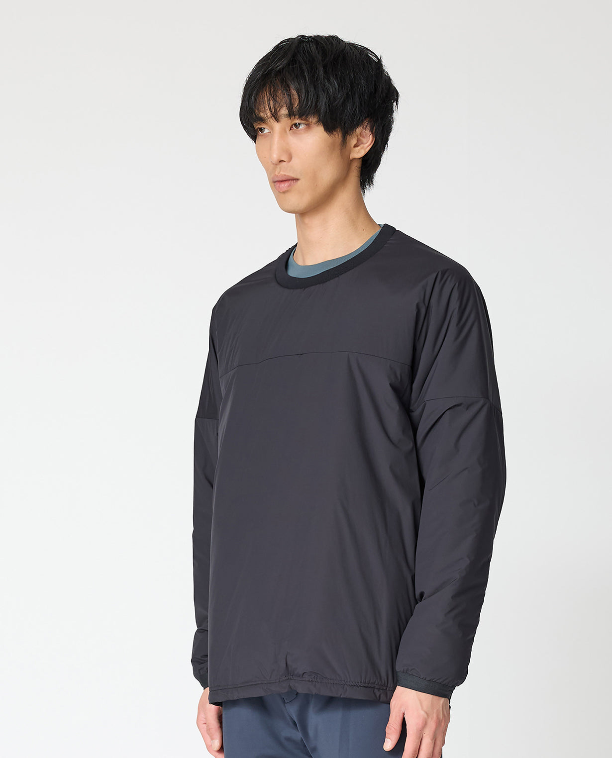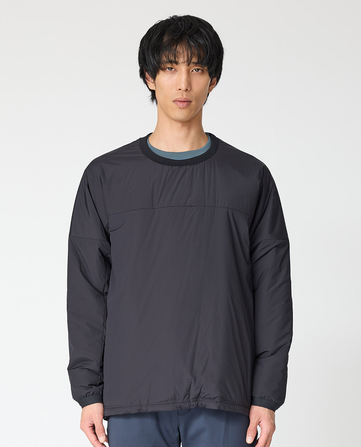 The neckline is a clean round neckline. It can be layered with a mock neck for a well-balanced look. The length can be adjusted by tightening the drawstring at the hem. The simple design allows you to enjoy a wide range of coordination depending on how you combine it.