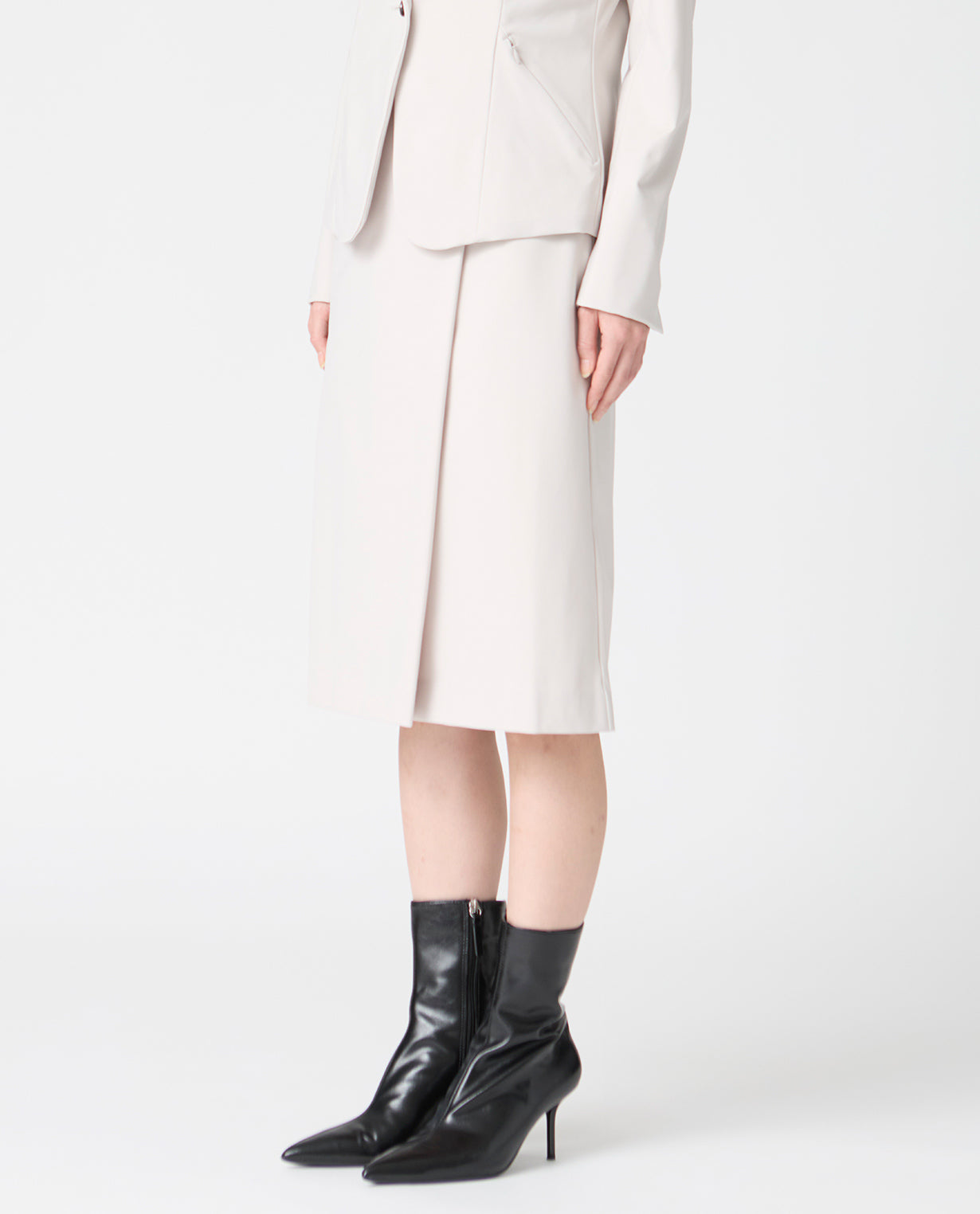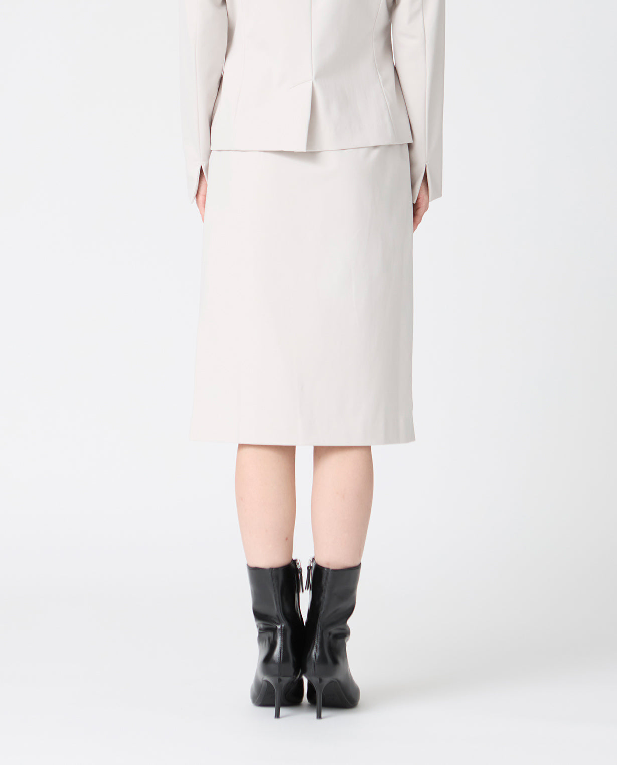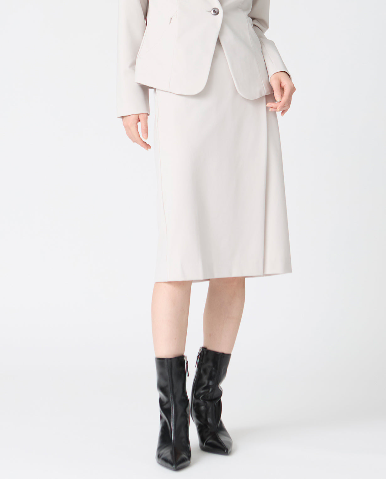 きめ細かいダブルフェイス・ニットN生地で伸縮性と質感のよいドレススカート。■ デザインダブルフェイスニット・N生地ならではの着心地のよさと足捌きのよさを体感できるレディライクなスカート。膝が隠れるノーマル丈、フロントのラップ風タックだけをデザインポイントにした、大人っぽい究極のミニマルデザイン。斜めに走るタックのラインが腰高に見せる視覚効果を発揮します。一見すると裾幅が狭そうなボックス型シルエットですが、タックの奥に膝頭までの隠しスリットが入っているので大股で歩いても大丈夫。座っても裾がずり上がりにくく、タイトスカートが苦手な方でもアクティブに着こなせる設計となっています。ウエストは裏側にストレッチベルトを仕込んであり、伸縮性があるのでお腹を締め付けません。左脇はコンシールファスナーあき、右脇はスラッシュポケット付き。ミニマルでエレガントなルックスを実現するためのこだわりが詰まった一着は、さまざまなオケージョンに対応可能。■ 素材24HR-WEARABLEというコンセプトのセットアップシリーズ。ハイゲージダブルニットで編み上げられた生地は滑らかで肌当たりが柔らかく、高密度編みによって叶えられたフラットで美しい表面感とハイパワーストレッチが特徴。■ コーディネート同素材0021_Nジャケットとのセットアップでセミフォーマルやビジネスに、0606_Nブルゾンと合わせてちょっとしたお出掛けに。■ 同じ生地のアイテムを見るN生地