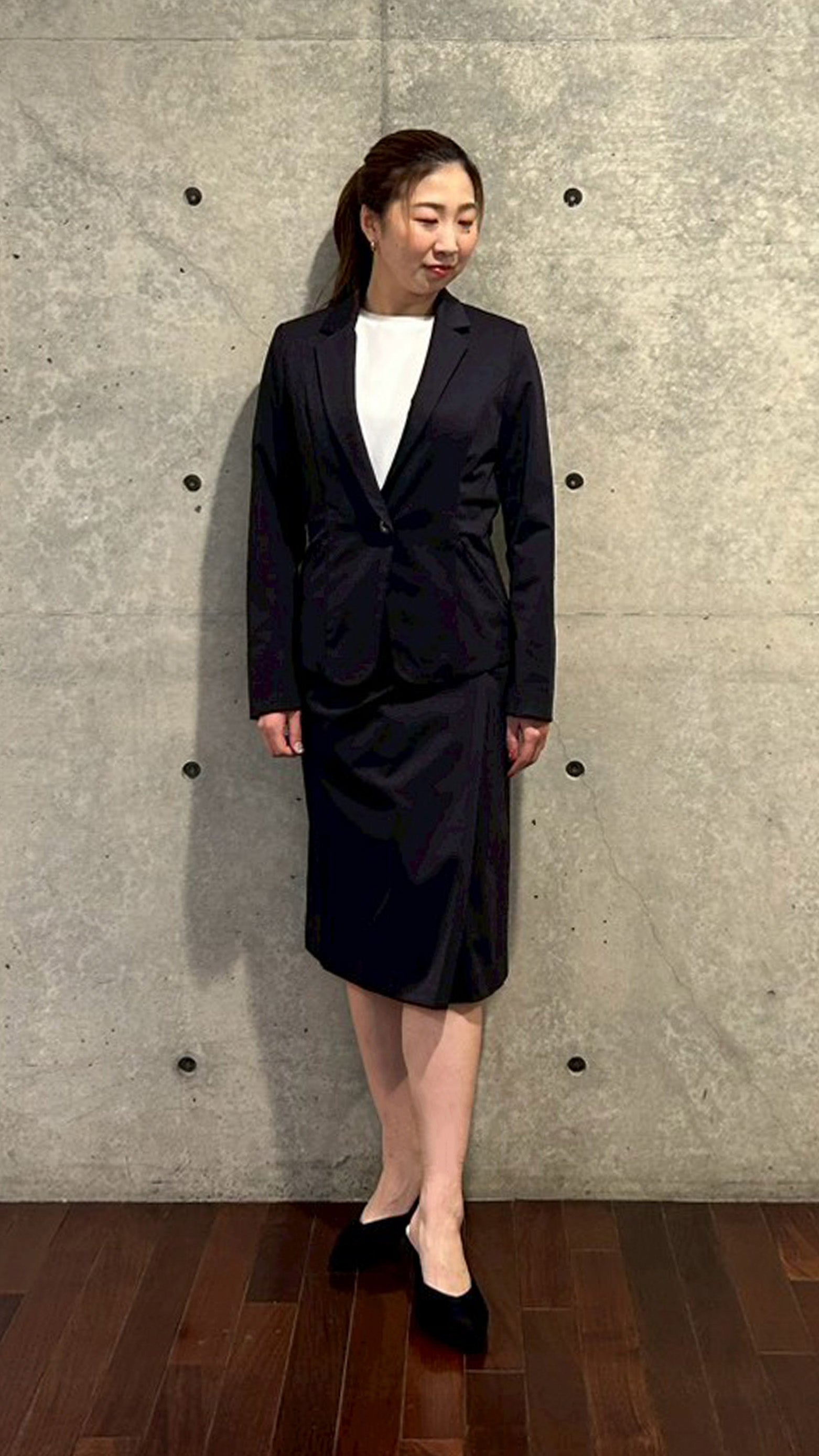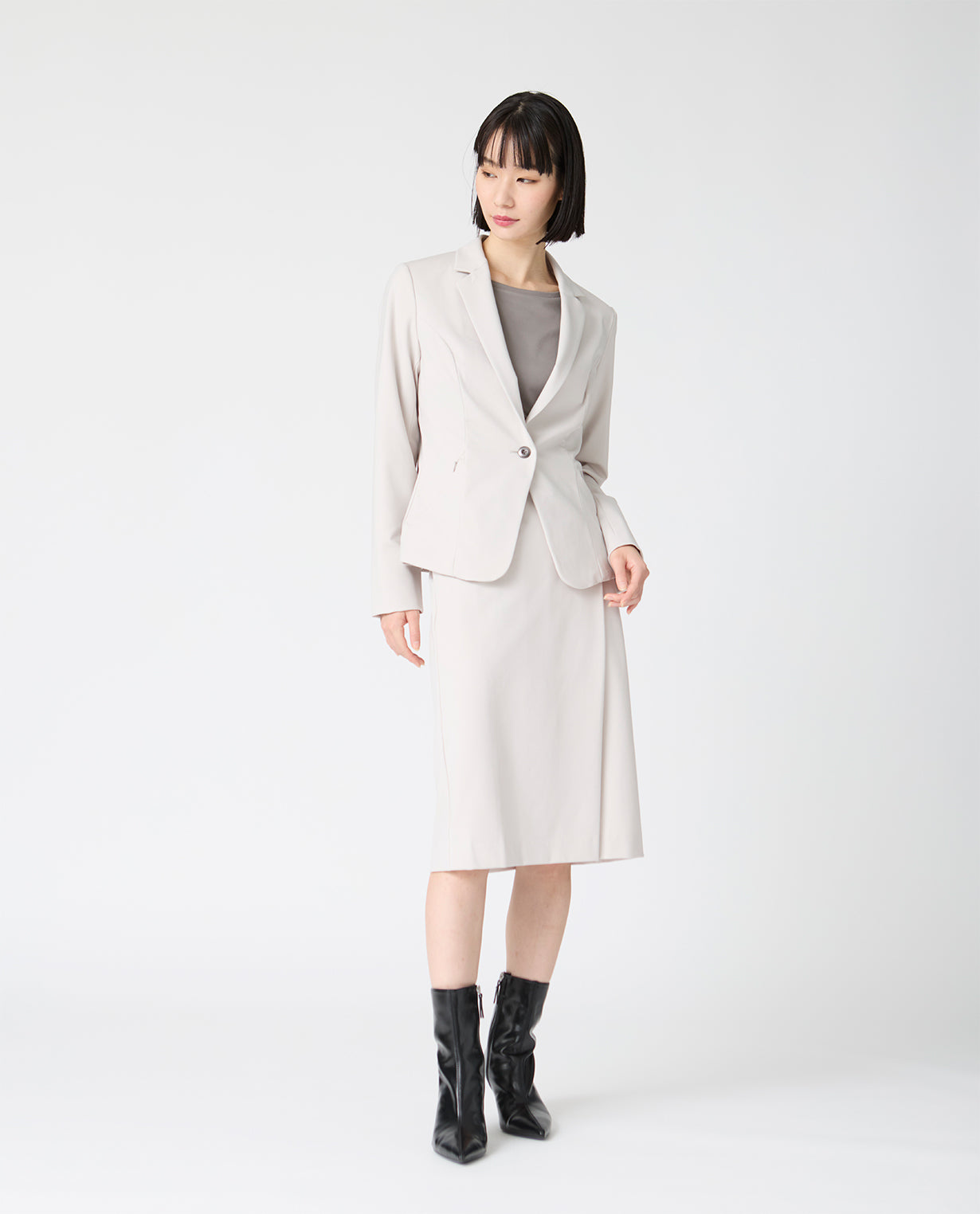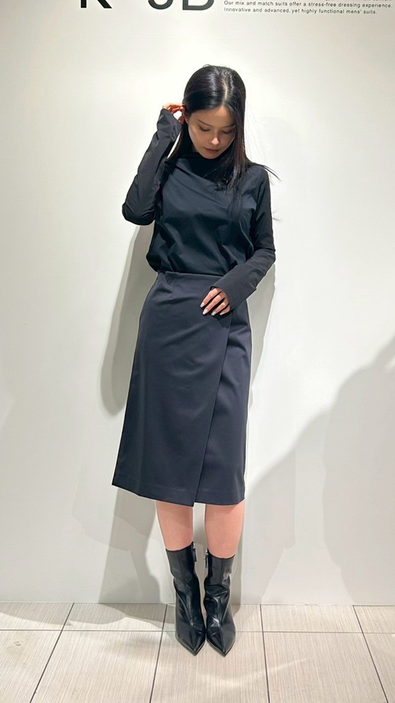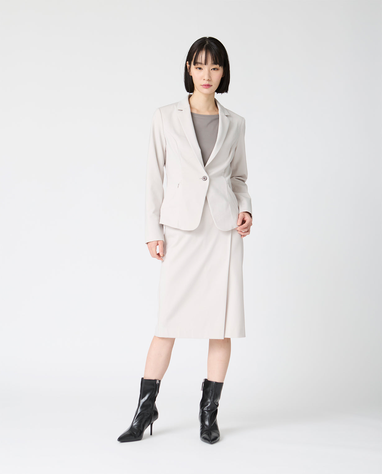 きめ細かいダブルフェイス・ニットN生地で伸縮性と質感のよいドレススカート。■ デザインダブルフェイスニット・N生地ならではの着心地のよさと足捌きのよさを体感できるレディライクなスカート。膝が隠れるノーマル丈、フロントのラップ風タックだけをデザインポイントにした、大人っぽい究極のミニマルデザイン。斜めに走るタックのラインが腰高に見せる視覚効果を発揮します。一見すると裾幅が狭そうなボックス型シルエットですが、タックの奥に膝頭までの隠しスリットが入っているので大股で歩いても大丈夫。座っても裾がずり上がりにくく、タイトスカートが苦手な方でもアクティブに着こなせる設計となっています。ウエストは裏側にストレッチベルトを仕込んであり、伸縮性があるのでお腹を締め付けません。左脇はコンシールファスナーあき、右脇はスラッシュポケット付き。ミニマルでエレガントなルックスを実現するためのこだわりが詰まった一着は、さまざまなオケージョンに対応可能。■ 素材24HR-WEARABLEというコンセプトのセットアップシリーズ。ハイゲージダブルニットで編み上げられた生地は滑らかで肌当たりが柔らかく、高密度編みによって叶えられたフラットで美しい表面感とハイパワーストレッチが特徴。■ コーディネート同素材0021_Nジャケットとのセットアップでセミフォーマルやビジネスに、0606_Nブルゾンと合わせてちょっとしたお出掛けに。■ 同じ生地のアイテムを見るN生地