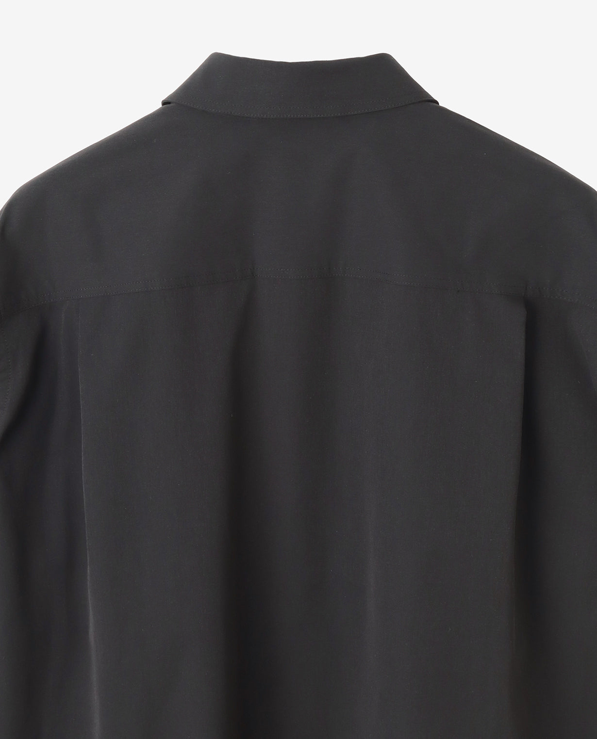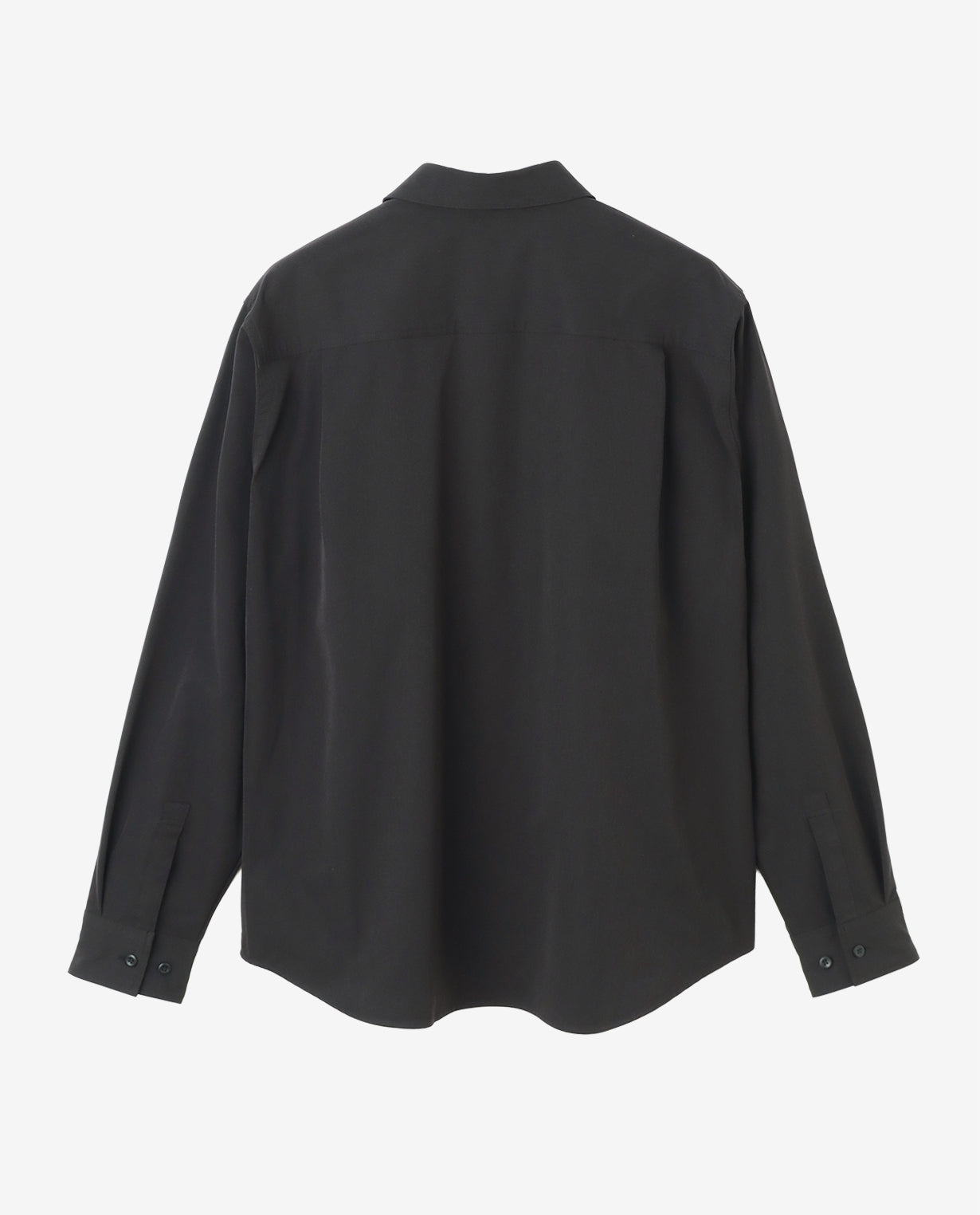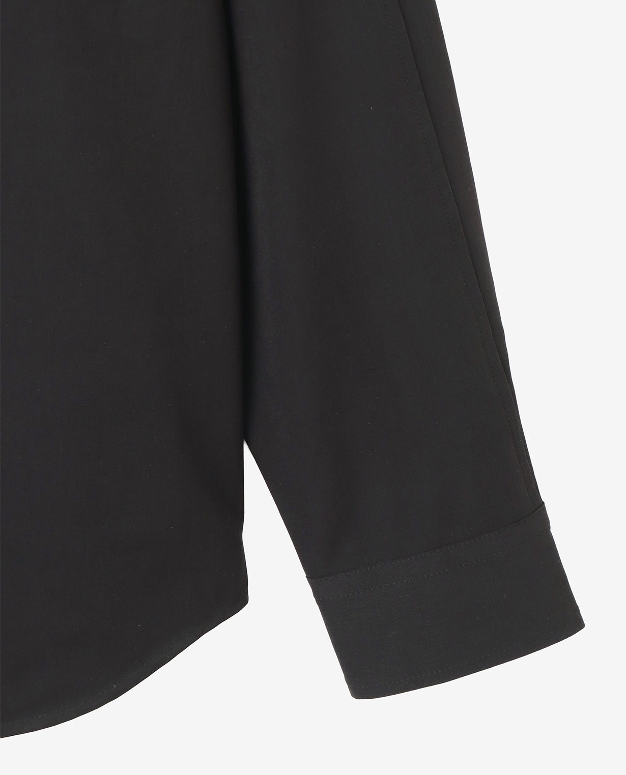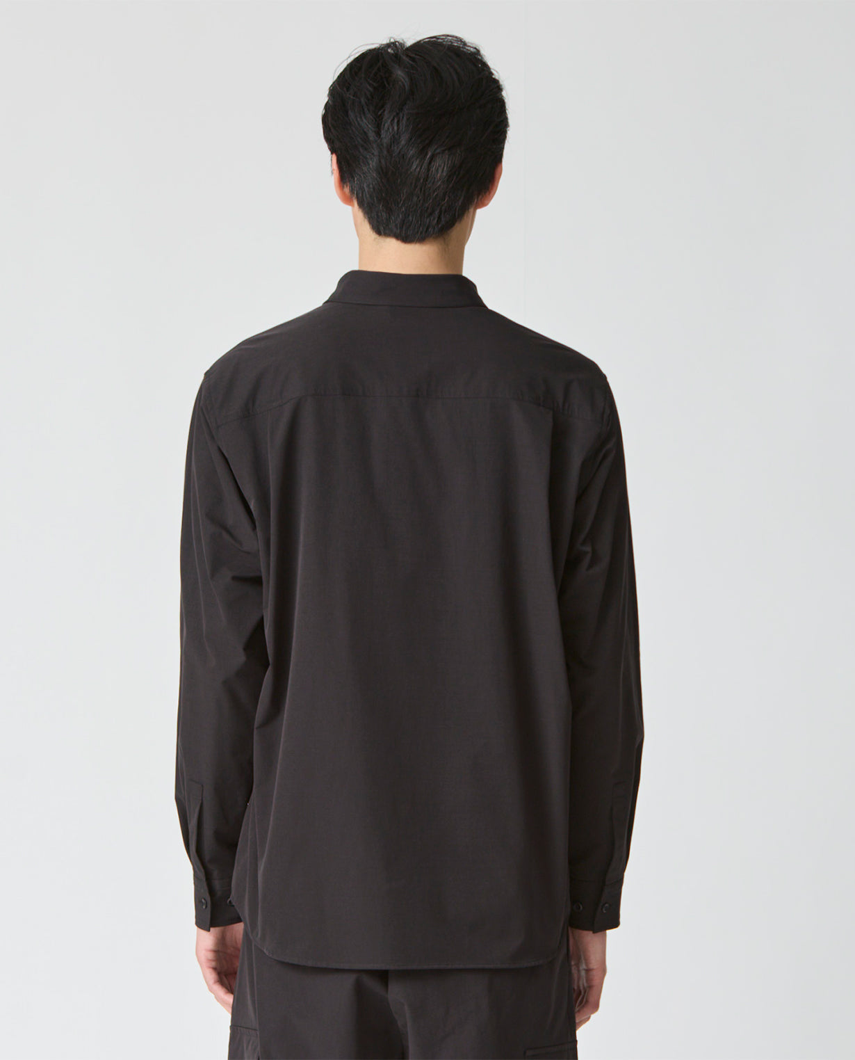 肩はややドロップさせ、袖幅にも適度なゆとりを持たせることで、ワイドフィットながらもだらしなく見えない構築的なシルエットを形成。袖口はカフス仕様で、ミニマルな中にもシャツ本来の端正さを保っています。