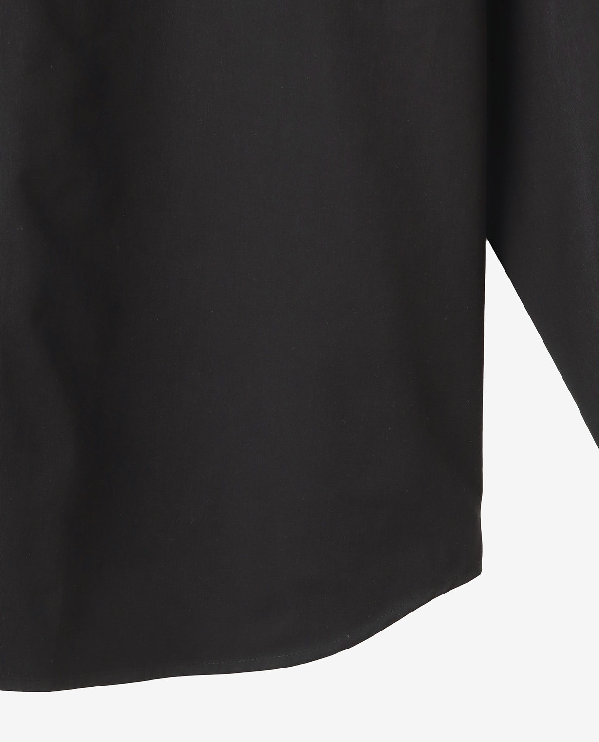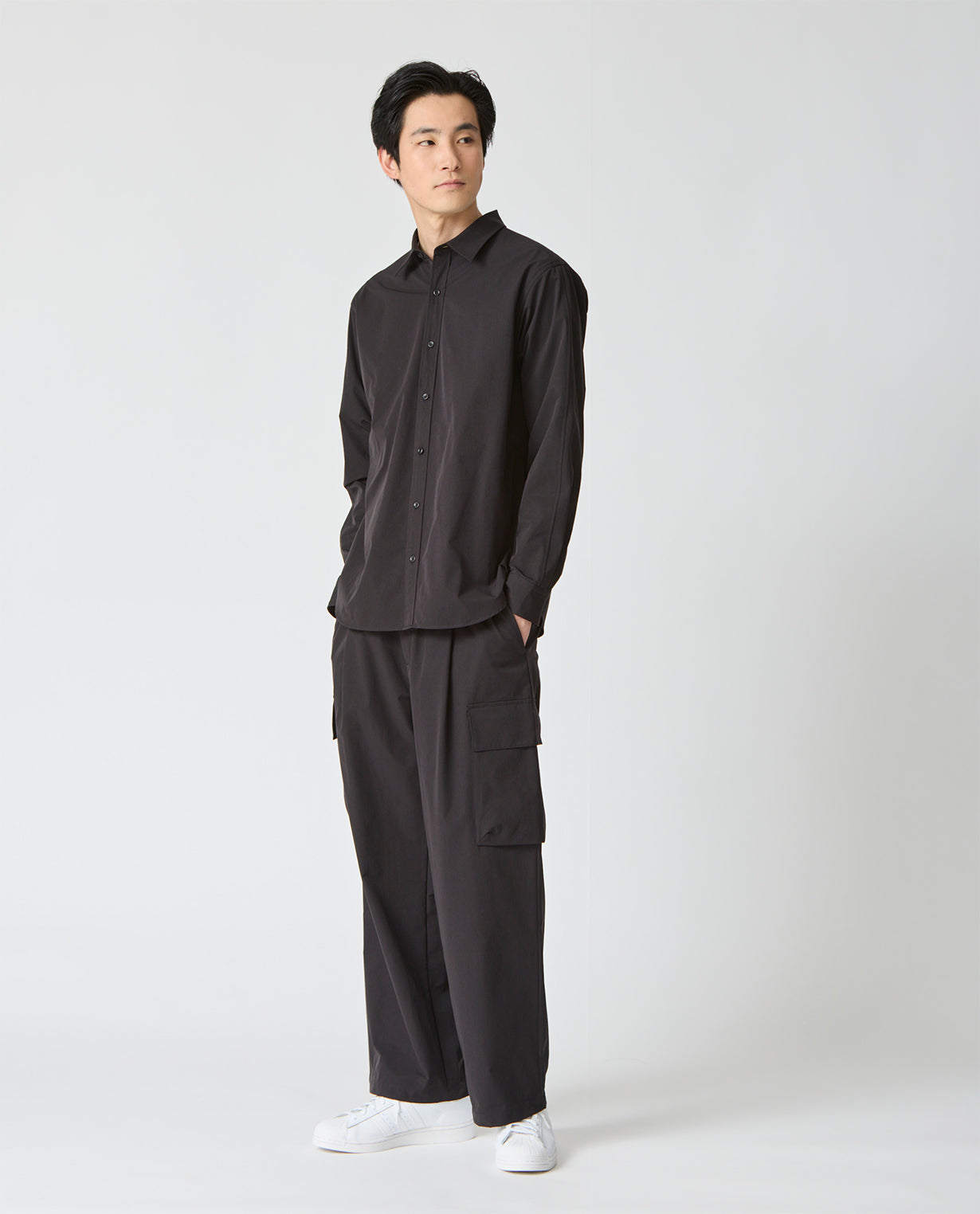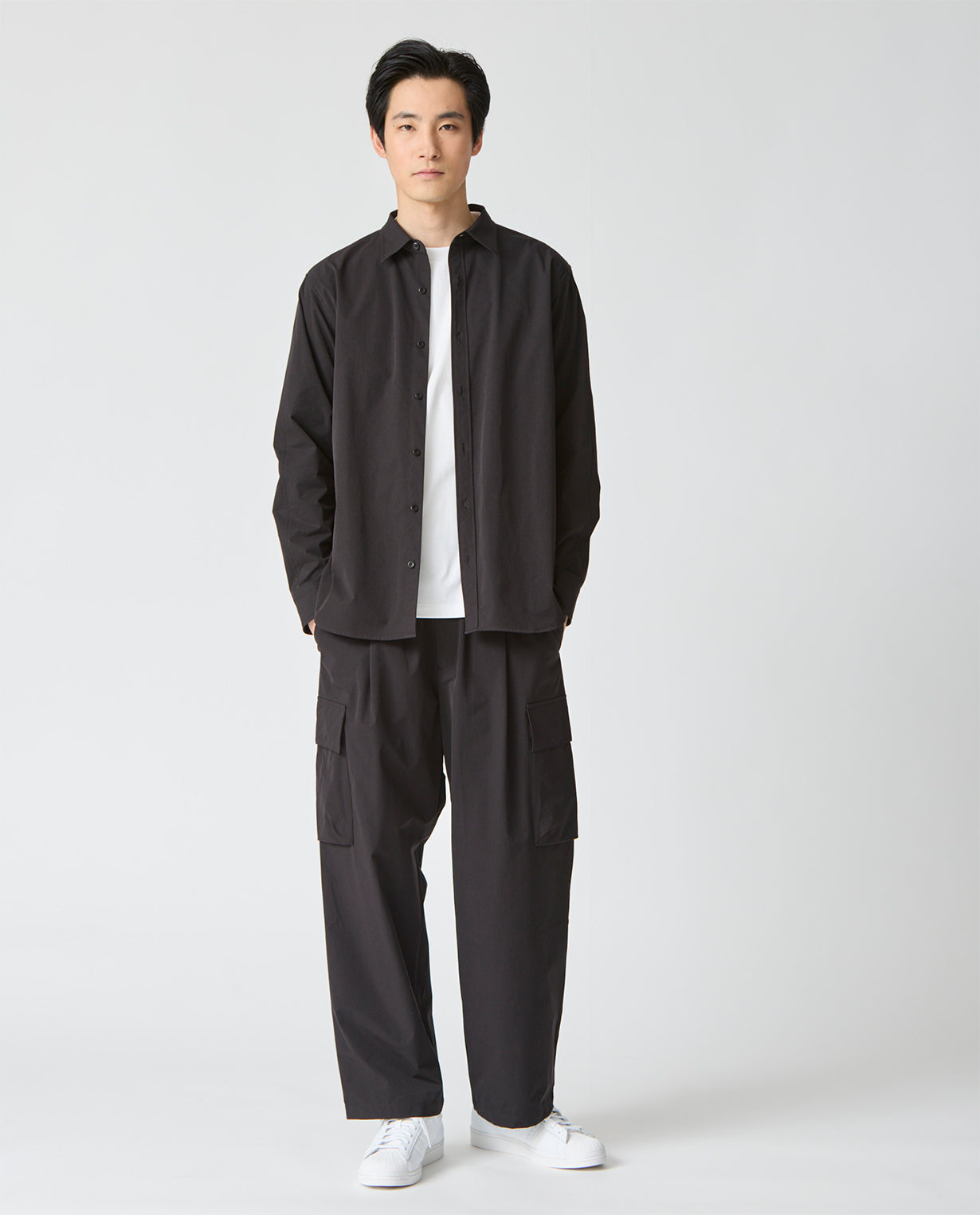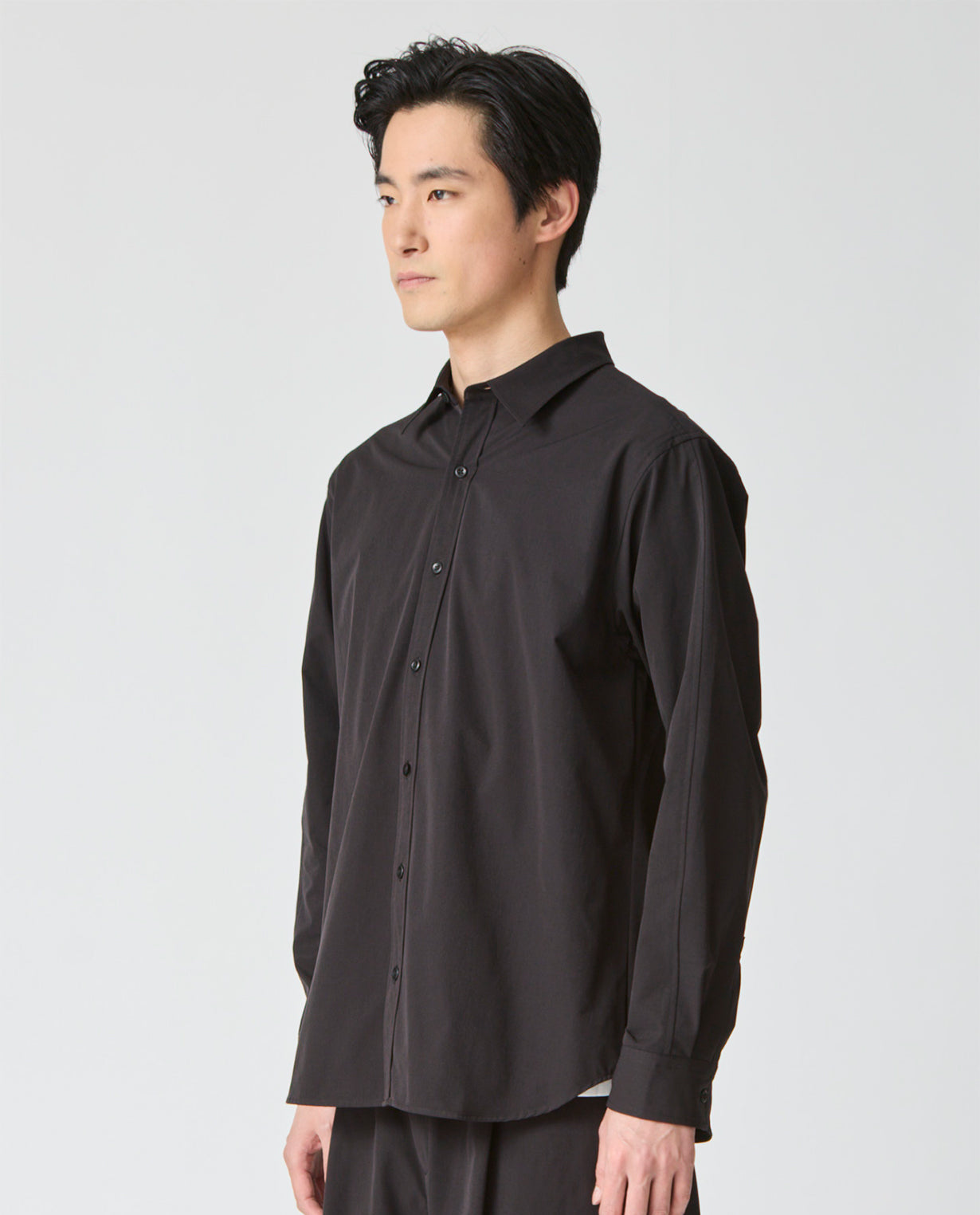 肩はややドロップさせ、袖幅にも適度なゆとりを持たせることで、ワイドフィットながらもだらしなく見えない構築的なシルエットを形成。袖口はカフス仕様で、ミニマルな中にもシャツ本来の端正さを保っています。