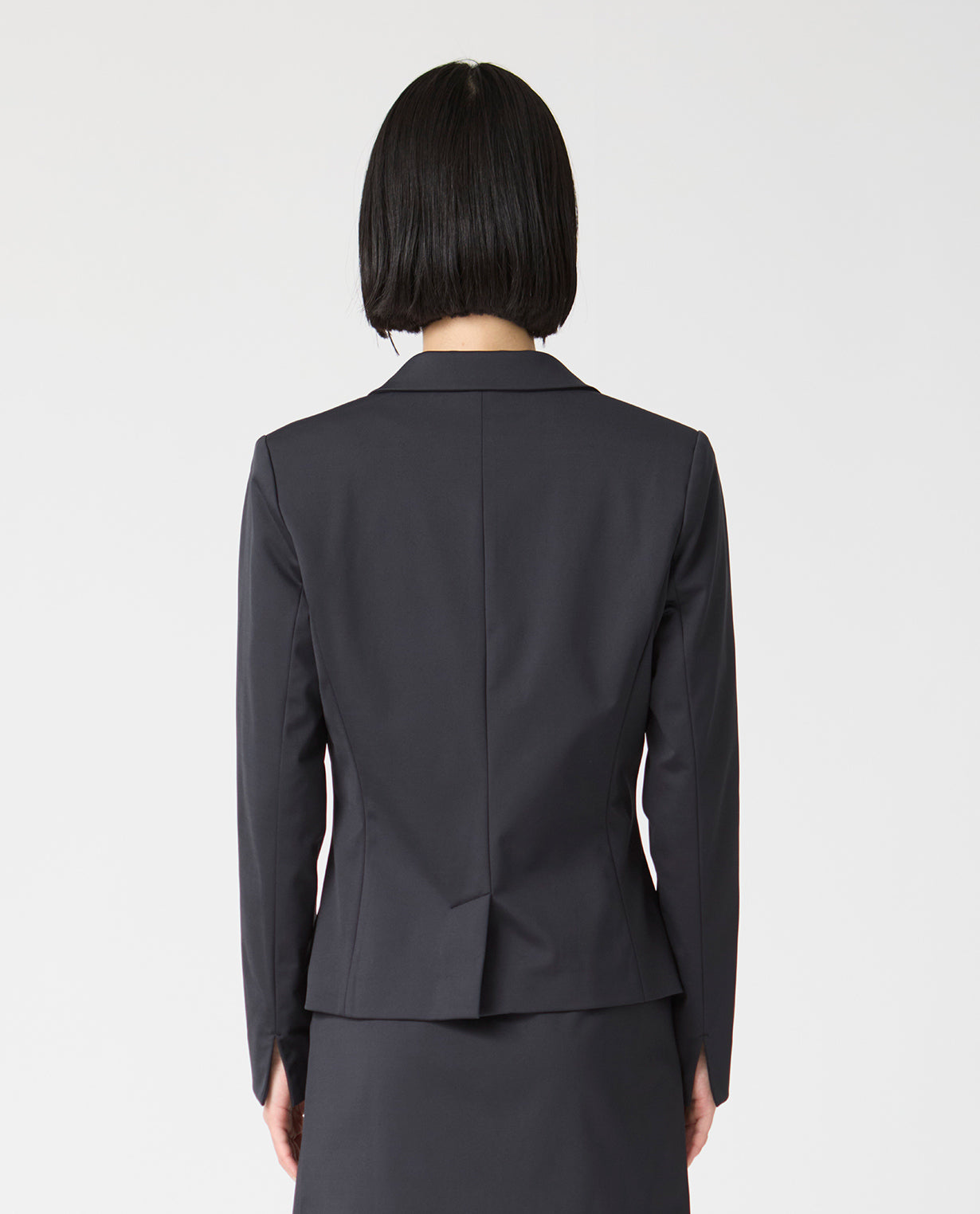 半裏付きで薄い肩パッドを入れているため、構築的なシルエットをキープしつつ、ニット素材ならではの快適な着心地も実現しています。一つボタンのフロントはシャープな打ち合わせ角度で、後ろ身頃を若干短めに設計。どの角度から見ても腰高でスレンダーな印象を与えます。