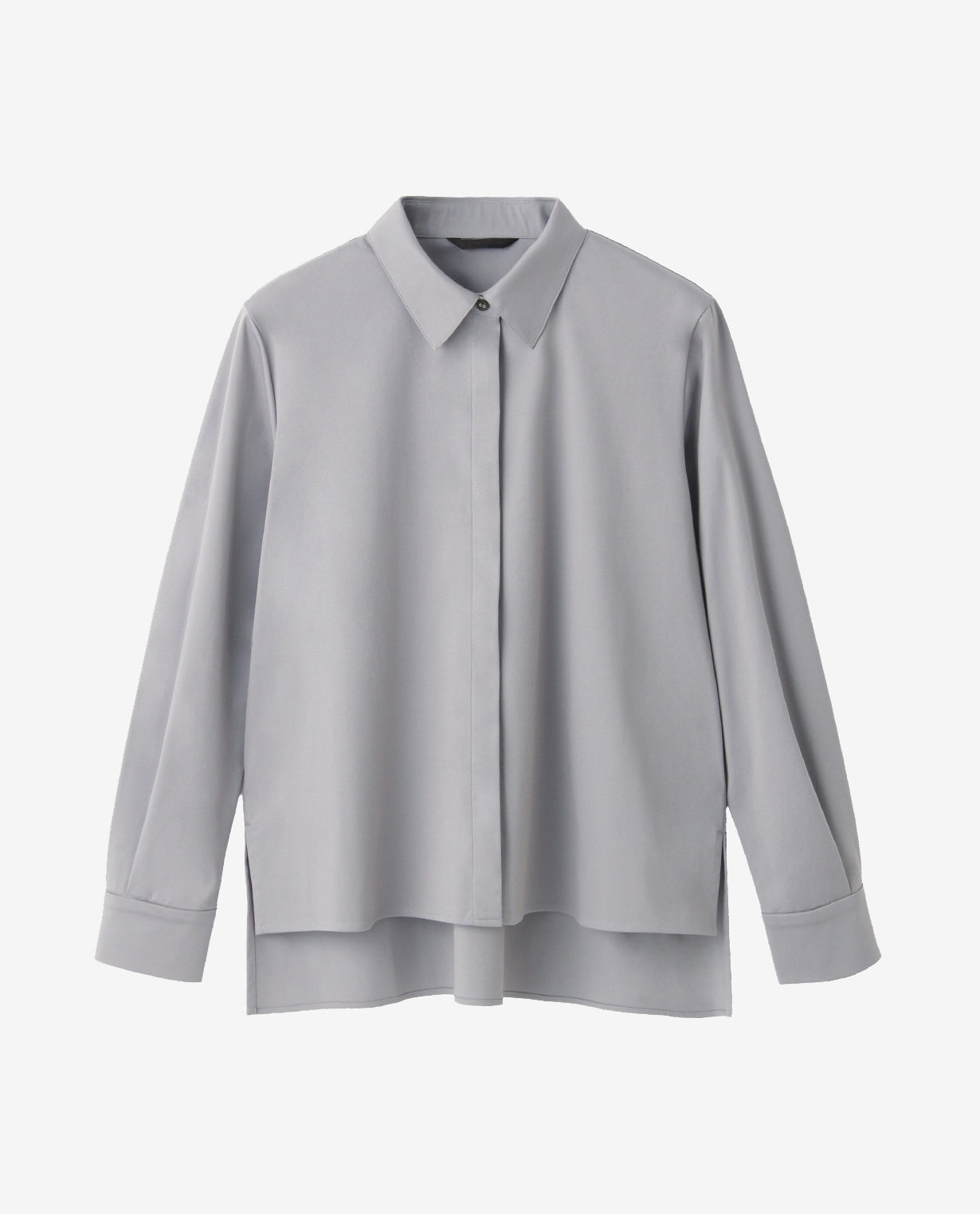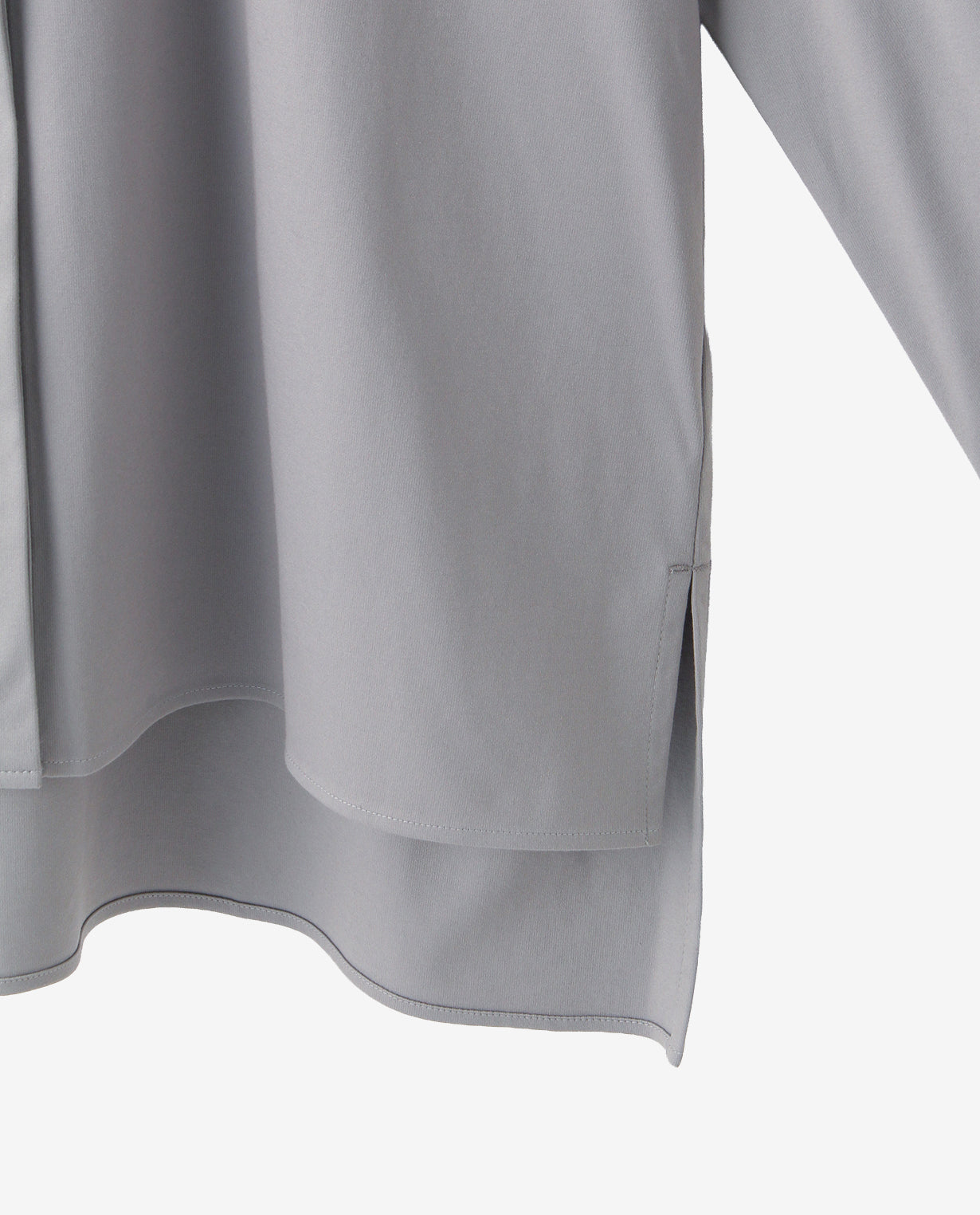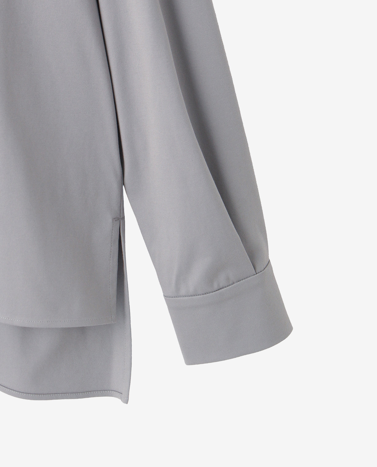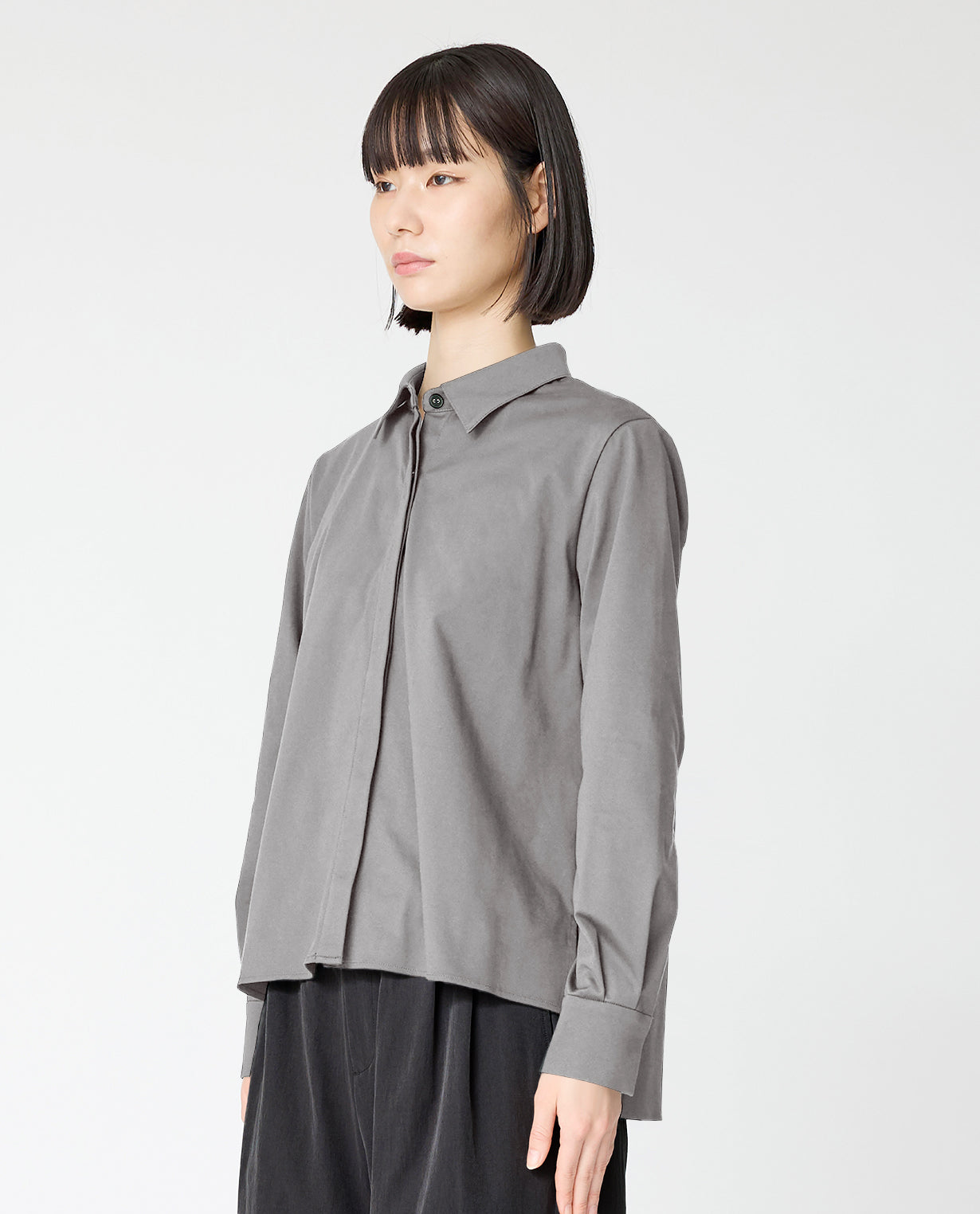 ■ 素材最高級コットンであるスーピマコットンを使用した新素材WW生地。超長綿であるスーピマコットンを使用することで、生地がしなやかでやわらかく、滑らかな肌触りになり、快適な着用感を得れます。ポリエステル繊維と合わせることで生地の滑らかさはそのままにポリエステルの特徴である吸水性、速乾性も備えたハイテク生地です。また生地にはシルケット加工を施して光沢感を出し、よりソフトな手触りに仕上がっています。■ デザイン素材の良さを活かしてミニマル・ルックに徹したボックスシャツです。ドレッシーにもカジュアルにもアレンジできるように、ディテールにこだわったているので、シーンやシーズンを問わず着用いただけます。衿幅はコンパクトでクセがなく、フロントの打ち合わせは比翼にしてボタンが見えない仕様。それに合わせて袖口も目立たないスナップ留めにし、トレンドスタイルである広幅のカフスを引き立てています。ドロップショルダーのボックスシルエットはリラックスした着心地。前後差をつけた後ろ身頃はヒップを隠す丈。オーバーシャツやちょっとした羽織りものとしても着映えがしますし、ボトムスにタックインすればフェミニンな雰囲気にも。カットソー素材でありながら、上質感とほど良い抜け感をあわせ持ったスタイリッシュな一着です。■ スタイリングテーパードパンツやIラインスカートと合わせれば、比翼仕立てのシャツが引き立つ端正な着こなしに。上品さと程よい抜け感を両立したオフィススタイルが完成します。ワイドパンツやリラックス感のあるイージーパンツと合わせれば、レイヤードデザインの立体感が際立つモードな印象に。