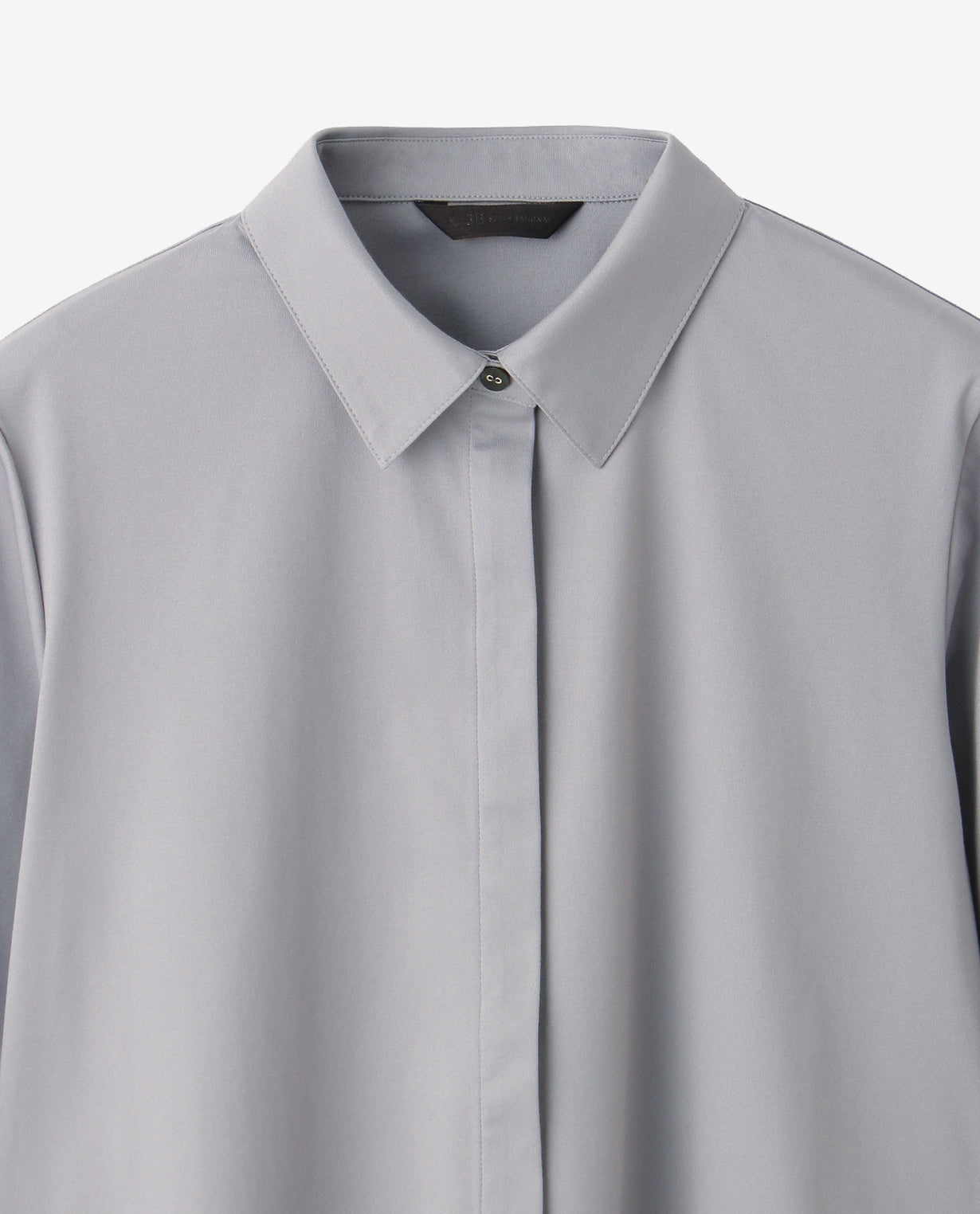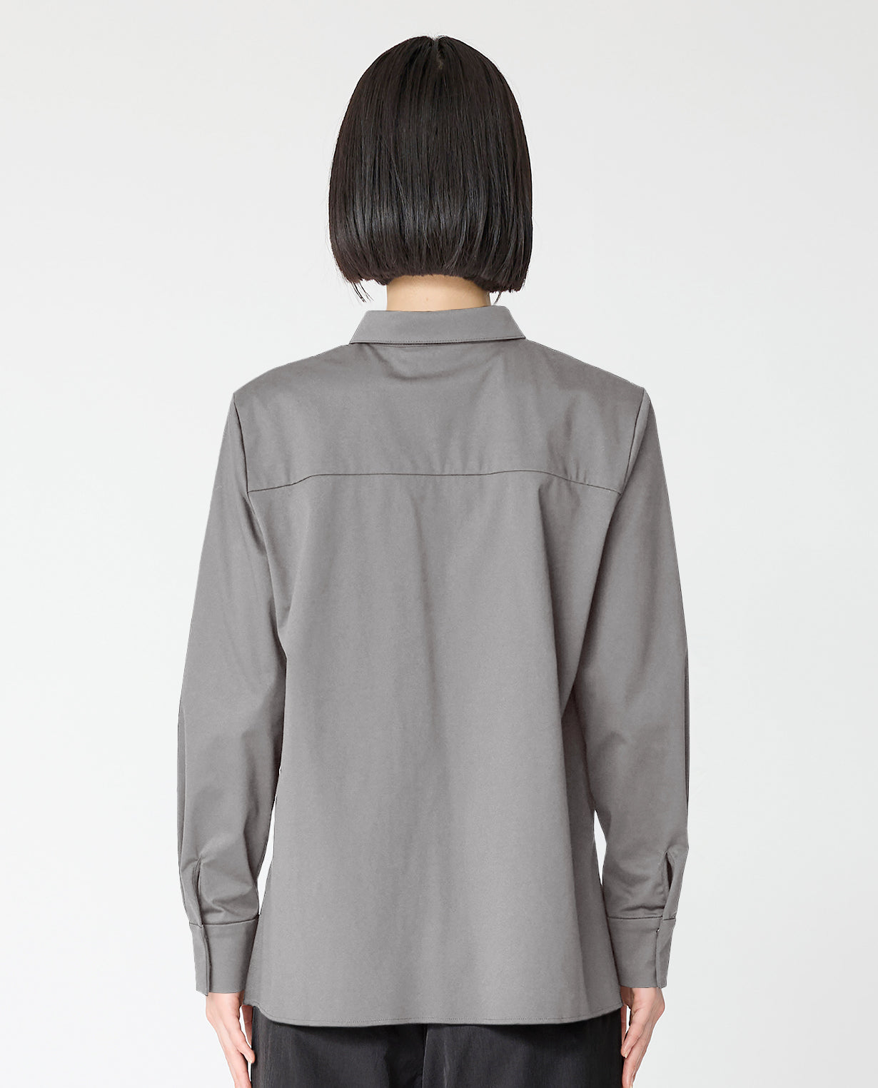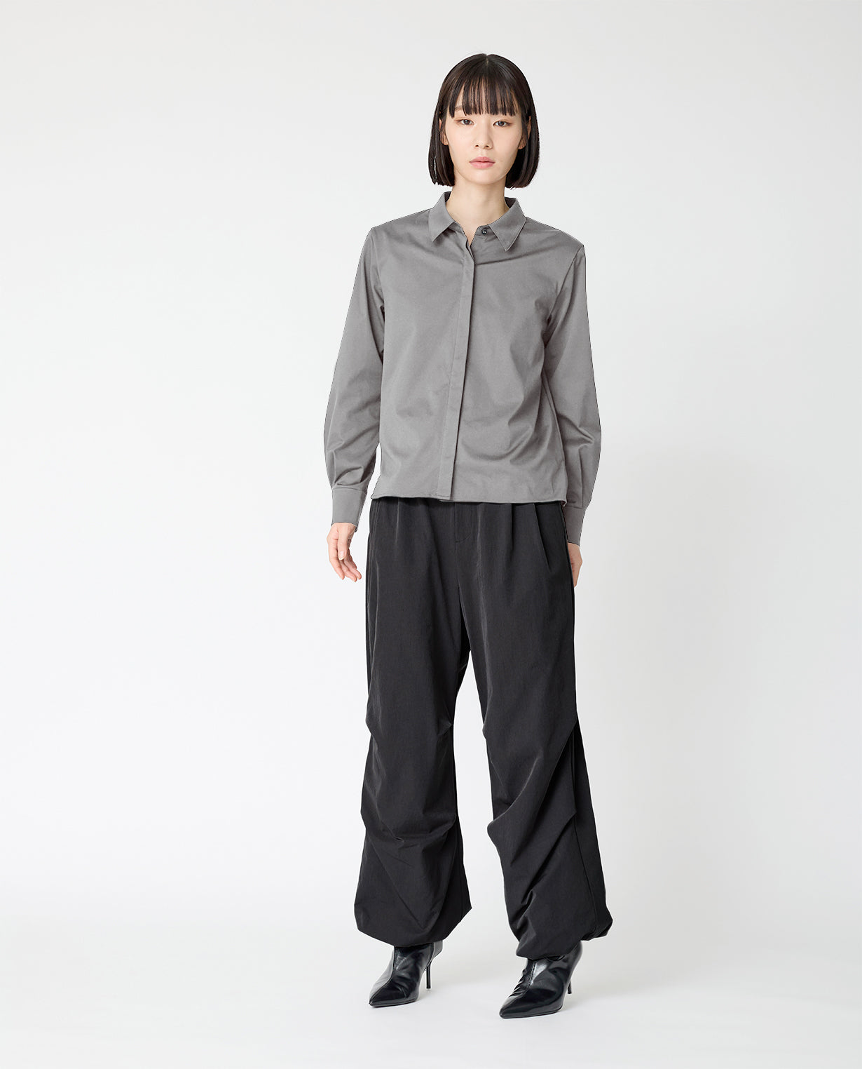 ■ 素材最高級コットンであるスーピマコットンを使用した新素材WW生地。超長綿であるスーピマコットンを使用することで、生地がしなやかでやわらかく、滑らかな肌触りになり、快適な着用感を得れます。ポリエステル繊維と合わせることで生地の滑らかさはそのままにポリエステルの特徴である吸水性、速乾性も備えたハイテク生地です。また生地にはシルケット加工を施して光沢感を出し、よりソフトな手触りに仕上がっています。■ デザイン素材の良さを活かしてミニマル・ルックに徹したボックスシャツです。ドレッシーにもカジュアルにもアレンジできるように、ディテールにこだわったているので、シーンやシーズンを問わず着用いただけます。衿幅はコンパクトでクセがなく、フロントの打ち合わせは比翼にしてボタンが見えない仕様。それに合わせて袖口も目立たないスナップ留めにし、トレンドスタイルである広幅のカフスを引き立てています。ドロップショルダーのボックスシルエットはリラックスした着心地。前後差をつけた後ろ身頃はヒップを隠す丈。オーバーシャツやちょっとした羽織りものとしても着映えがしますし、ボトムスにタックインすればフェミニンな雰囲気にも。カットソー素材でありながら、上質感とほど良い抜け感をあわせ持ったスタイリッシュな一着です。■ スタイリングテーパードパンツやIラインスカートと合わせれば、比翼仕立てのシャツが引き立つ端正な着こなしに。上品さと程よい抜け感を両立したオフィススタイルが完成します。ワイドパンツやリラックス感のあるイージーパンツと合わせれば、レイヤードデザインの立体感が際立つモードな印象に。