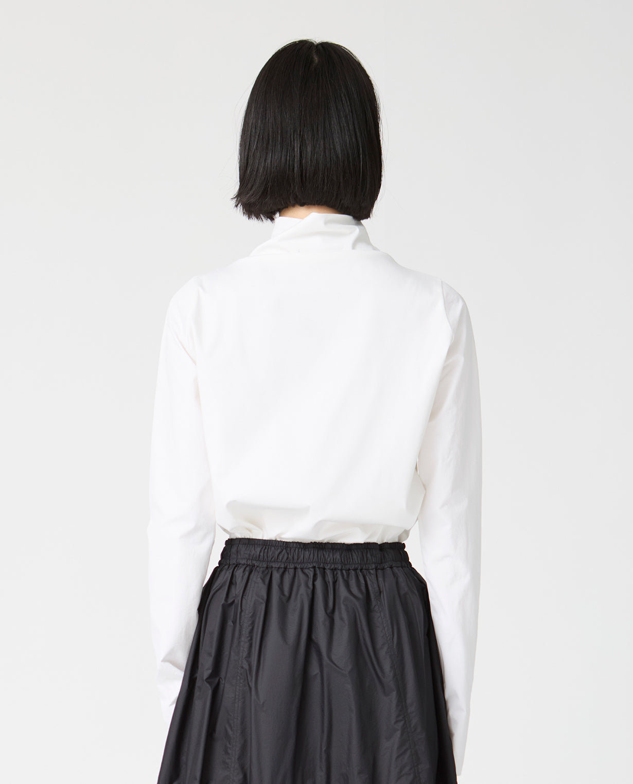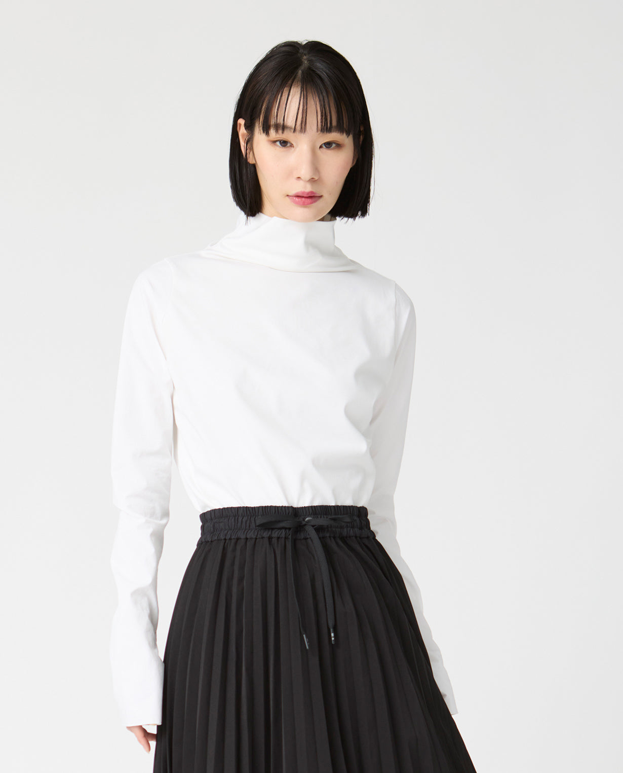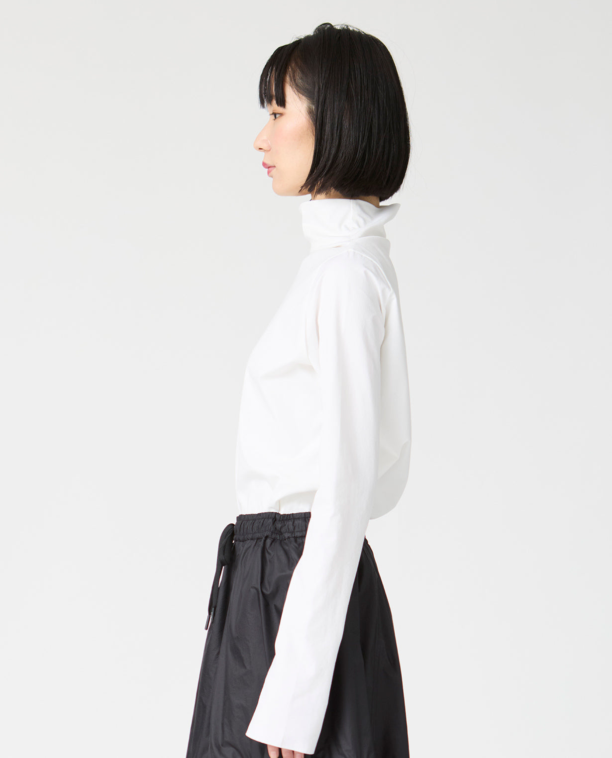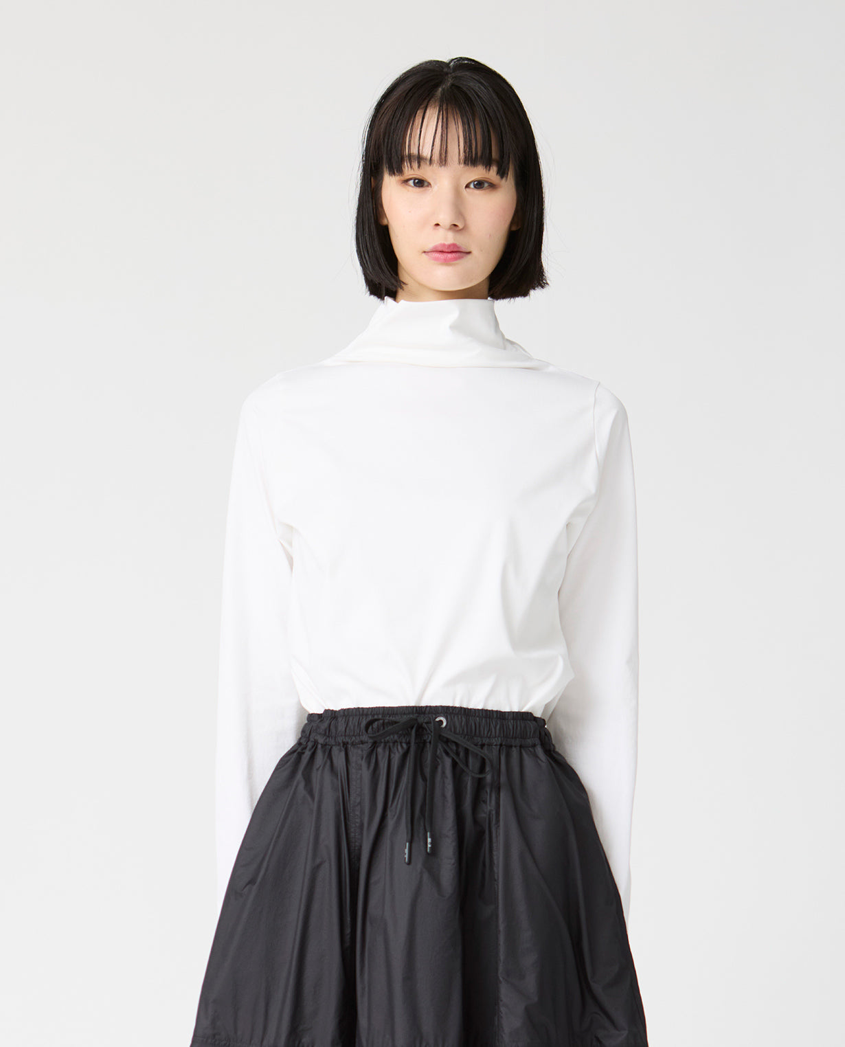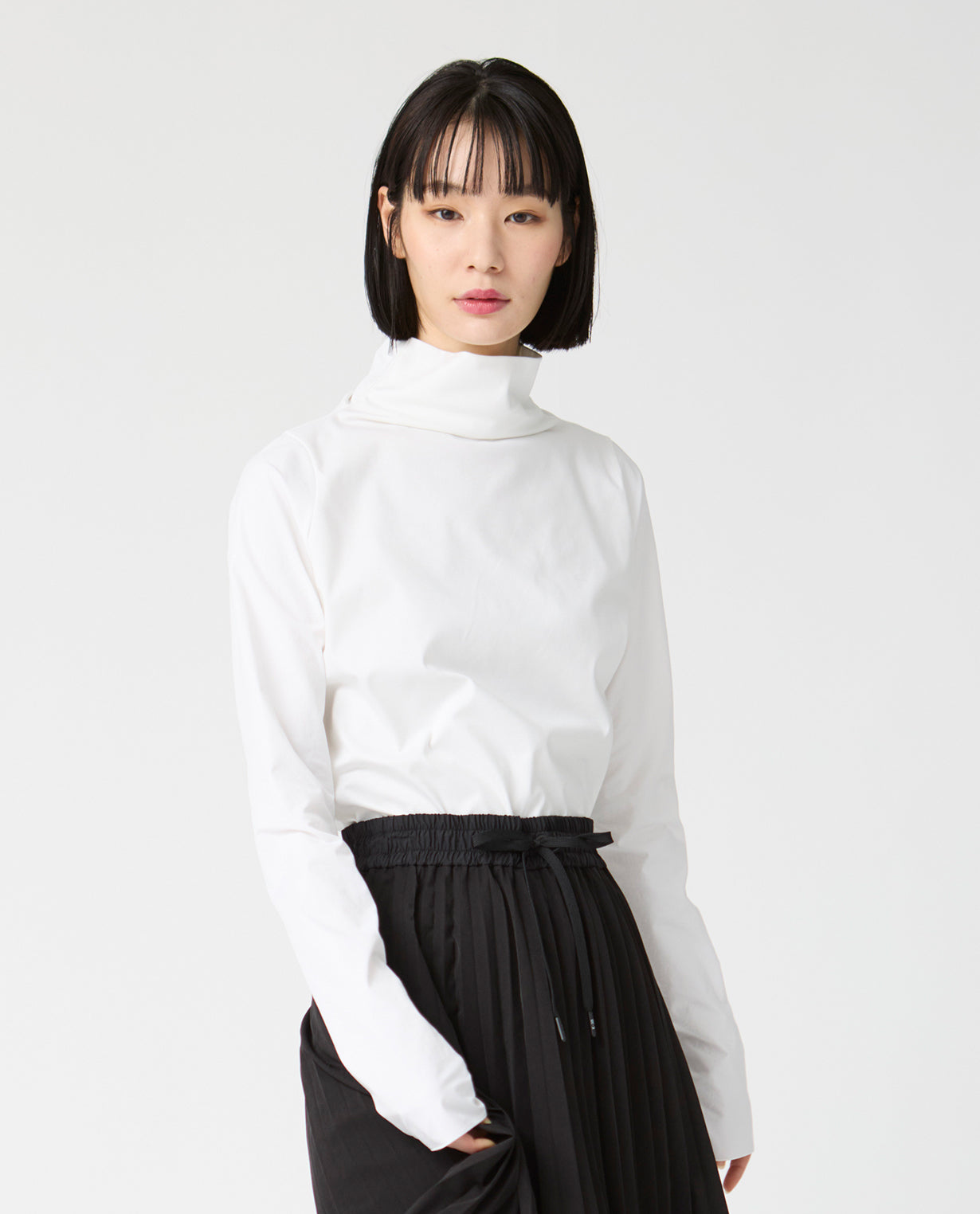 ■ 素材カジナイロンの仮撚加工技術を活かし、収縮率の異なる糸を組み合わせた独自開発のL生地を使用。ストレッチ性と天然素材のような風合いを両立し、微マットな質感と軽やかなハリが特徴です。ドライな肌触りで速乾性にも優れたイージーケア素材です。最高級スーピマコットンを使用したWW生地は、ハリとやわらかさを兼ね備えたしなやかな風合いが特徴。ポリエステルを組み合わせることで吸水速乾性をプラスし、シルケット加工により上品な光沢とソフトな手触りを実現しています。■ デザインコンパクトな身頃と高く立ち上がる衿のコントラスト、そして異素材の組み合わせがモダンな印象のハイネックプルオーバー。ジャケットのインナーに最適な、無駄をそぎ落としたミニマルなデザインとスリムラインが魅力です。身頃は程よいハリと伸縮性を備えたコットン混紡のカットソー素材「WW生地」で着心地よく、ナチュラルなフィット感です。それに対し、袖はストレッチ織物「L生地」で切り替えて長めの袖丈に設定し、スタイリッシュに。袖付けのカーブラインを工夫してあるので、上半身を華奢に見せる効果があります。また袖を滑らかなテクスチャーの織物にしたことでジャケットと重ね着しても滑りがよく、アウターのラインを崩しません。袖口側にはサムホールがあり、親指を通せば手の甲をしっかりカバー。指を通さず袖口をクシュクシュさせてもかわいい。美しく立ち上がるハイネック部分は、切替線や縫い目がないので伸びがよく、息苦しさやストレスがありません。シンプルな中に素材と構造の美しさが際立つ、ミニマルで完成度の高い一枚です。■ スタイリング 0021_Nテーラードジャケットのインナーにすればビジネスシーンに。ワイドパンツやフレアスカートなどボリュームのあるボトムスと合わせてタインカジュアルにも。首元のラインがスタイリング全体を引き締め、モダンでクールな印象にまとまります。足元はヒールブーツやレザーシューズを合わせ、都会的で洗練された着こなしに仕上げるのがおすすめです。■ 同じ生地のアイテムを見るL生地