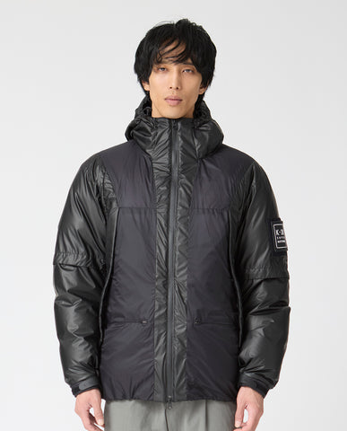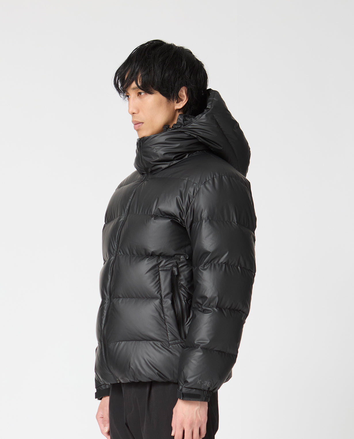 【K-3B "THE PROFESSIONAL SPEC" PREMIUM DOWN】縫い目の裏までダウンチューブを配した独自構造でコールドスポットを解消。高密度生地で防風・透湿防水性を備え、軽やかで上質な着心地。国内最高峰ファクトリー仕立ての都市向けプレミアムダウン。■ 素材K-3Bオリジナルの軽量高密度織物を使用。15dtexの極細糸を高密度に織り上げることで、高い防風性としなやかな質感を両立しています。透湿防水機能を備え、耐水圧10,000mm以上のスペックを持ちながら、非フッ素撥水加工(フッ素フリー)を採用することで環境にも配慮。快適性とサステナビリティを兼ね備えたテキスタイルです。生地表面の上品な光沢と柔らかな風合いにより、レザーのような高級感を演出しつつ、軽快な着心地を実現しています。■ デザインK-3Bのダウンは、縫い目から冷たい外気が入り込み、暖かい空気が逃げる「コールドスポット」を徹底的に抑えた設計です。通常のダウンジャケットはキルティングの縫い目が冷気の侵入口となりますが、本製品では縫い目の裏側にもダウンチューブを重ね、針穴部分を裏側のダウンで塞ぐことで外気を通しにくく、内側の熱を逃しにくくしています。この2層のダウンチューブは身頃全体に配置され、通常の約2倍の羽毛量を使用することで高い保温性を実現しています。