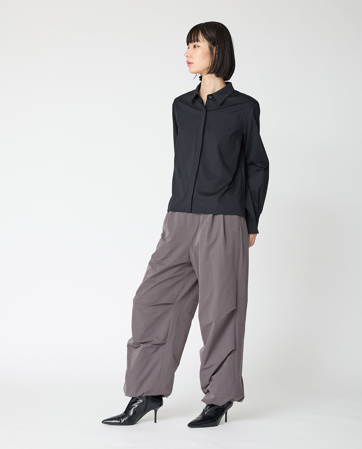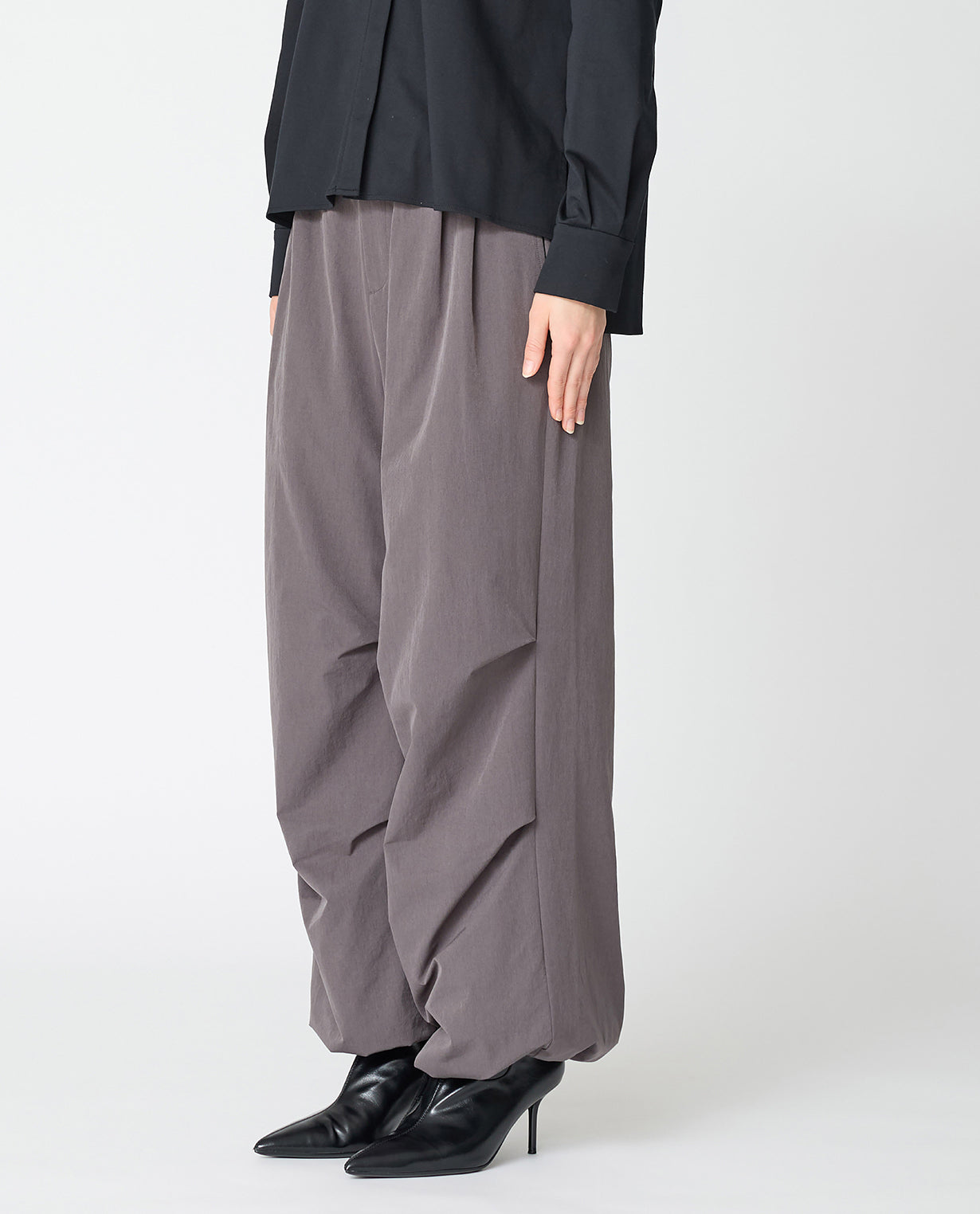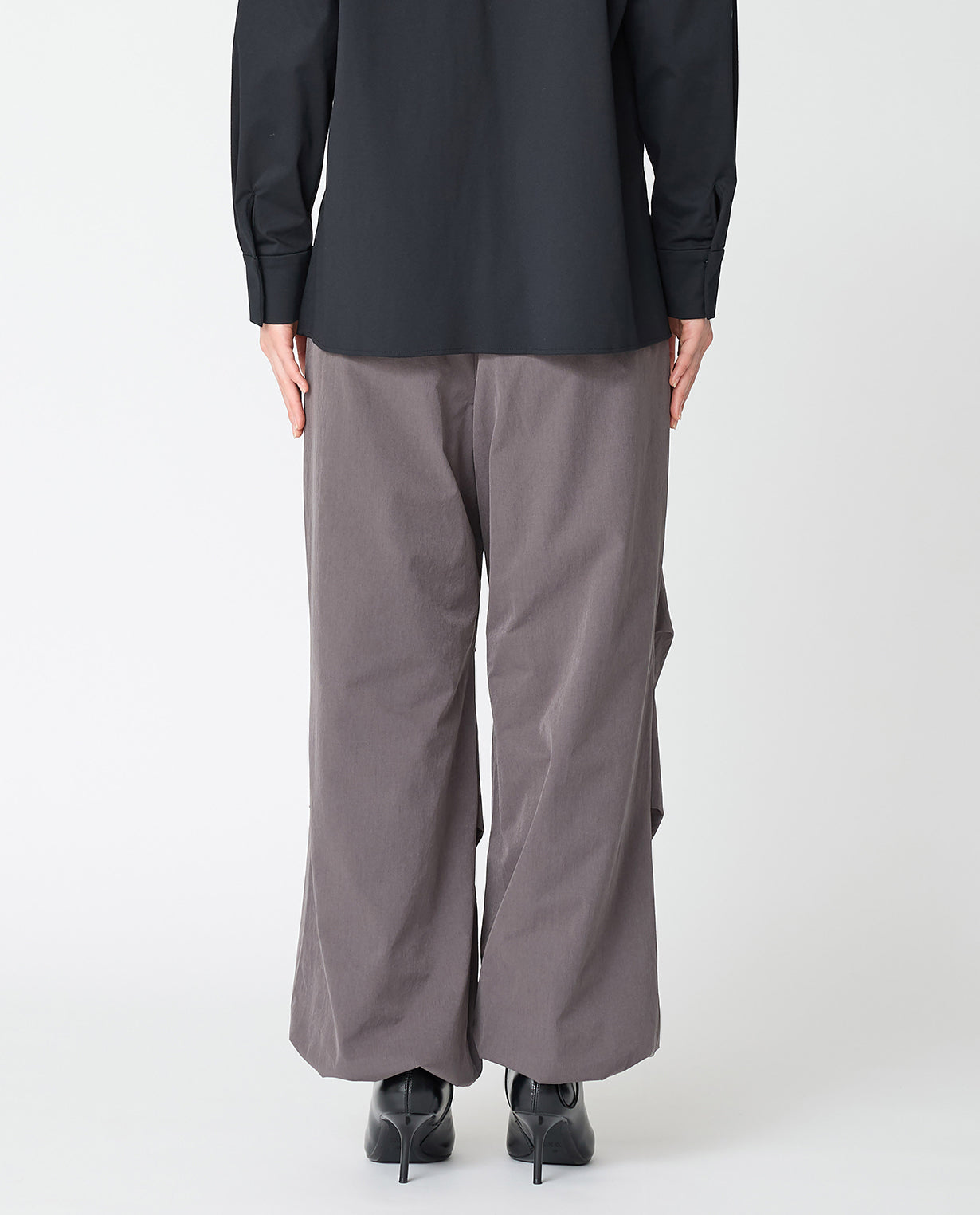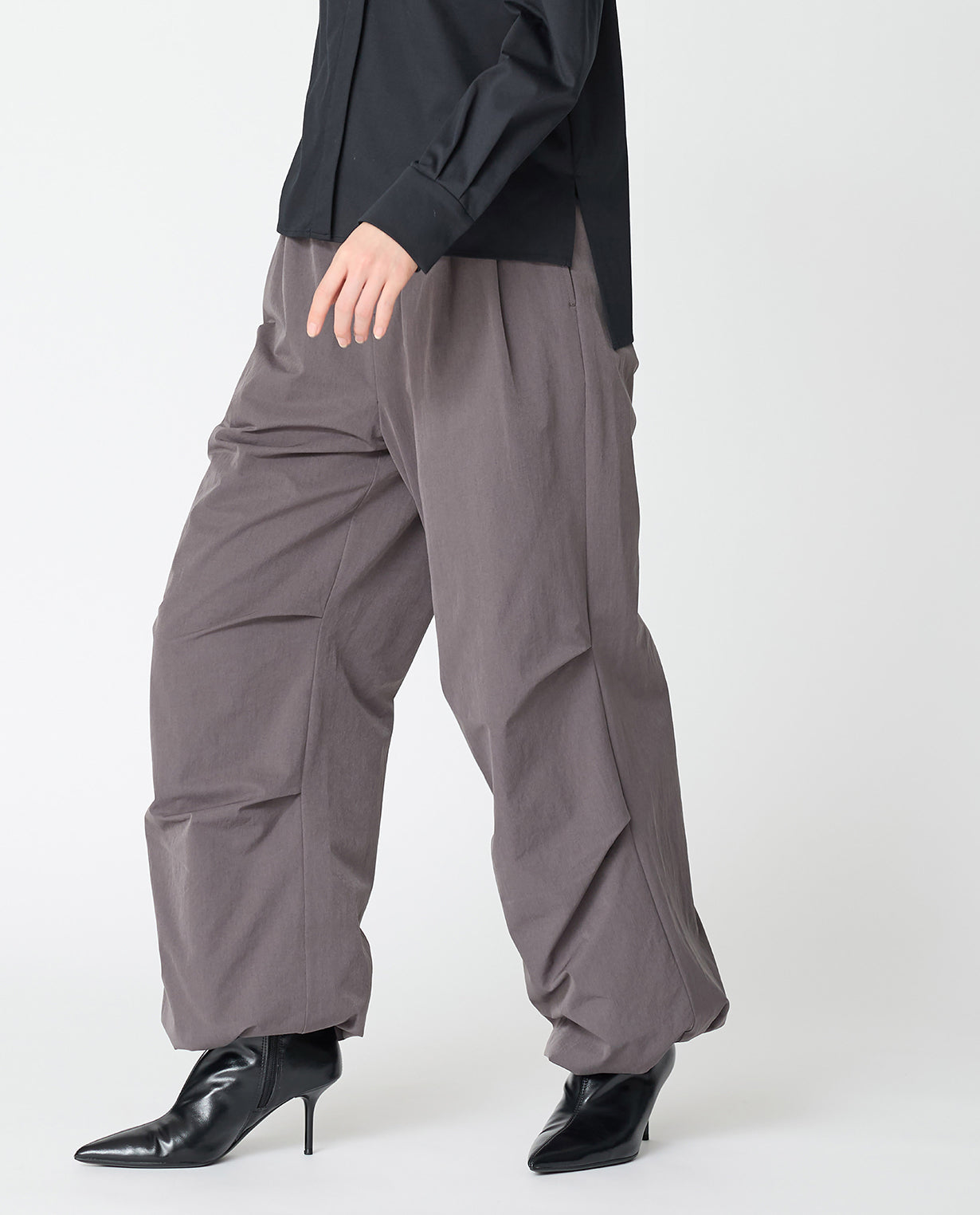 ■ 素材カジナイロンの仮撚加工技術を活かし、収縮率の異なる糸を組み合わせた独自開発のL生地を使用。ストレッチ性と天然素材のような風合いを両立し、微マットな質感と軽やかなハリが特徴です。ドライな肌触りで速乾性にも優れたイージーケア素材です。裏地には赤外線を吸収し蓄熱する特殊ポリマーを練り込んだ蓄熱パイルを使用することで、身体から出る熱を効果的に蓄えてくれるうえ、薄く軽量で肌触りがよく肌寒い時期でも暖かく着用できます。■ デザインウエスト周りはきちんと見えするタックパンツ、脚部はゆったりしたパラシュートパンツのハイブリッドデザインで、全体に暖かな蓄熱パイルの裏地をつけたスタイリッシュな防寒ウェア。ツータックでゆとりのあるフロント、サイドゴムシャーリングのすっきりしたウエストベルトは大人っぽい表情。ワイド目ながらもたつかない程よいパンツ幅に、膝のタックと裾のドローコード仕様でカジュアルさとボリューム感をプラスしており、秋冬の厚手トップスによく合うデザインです。裾のドローコードはスナップ付きのワンタッチループで内側に留めることができ、コードが裾から飛び出すことのない安心設計。天然素材ライクなテクスチャーとシワになりにくいイージーケアで人気の「L生地」を表地に使うことで、防寒パンツながらエレガントさを感じさせる機能的な一着となっています。■ スタイリングコンパクトなニットやブラウスを合わせれば、パラシュートパンツの立体感が引き立つきれいめカジュアルに。ワイドなトップスやアウターと合わせれば、抜け感のあるリラックスモードスタイルも楽しめます。足元はブーツやローファー、ヒールまで幅広く相性が良く、オン・オフ問わず活躍する一本です。■ 同じ生地のアイテムを見るL生地 (WOMEN)