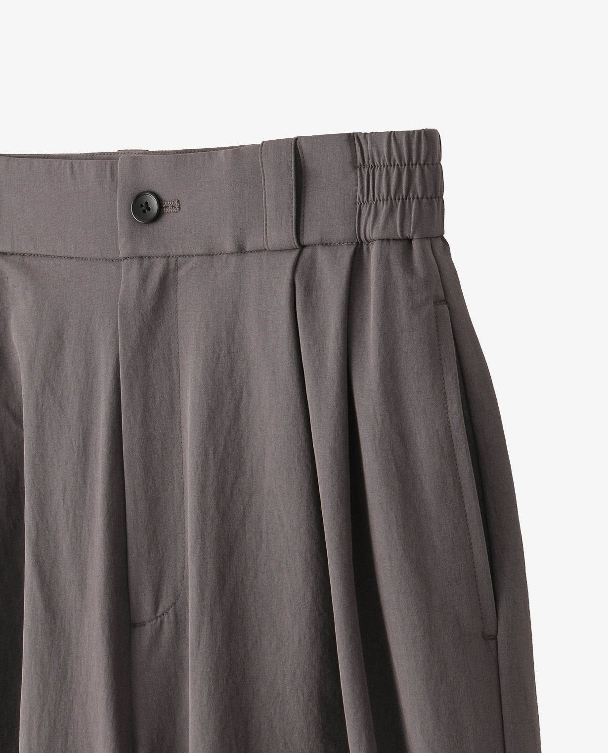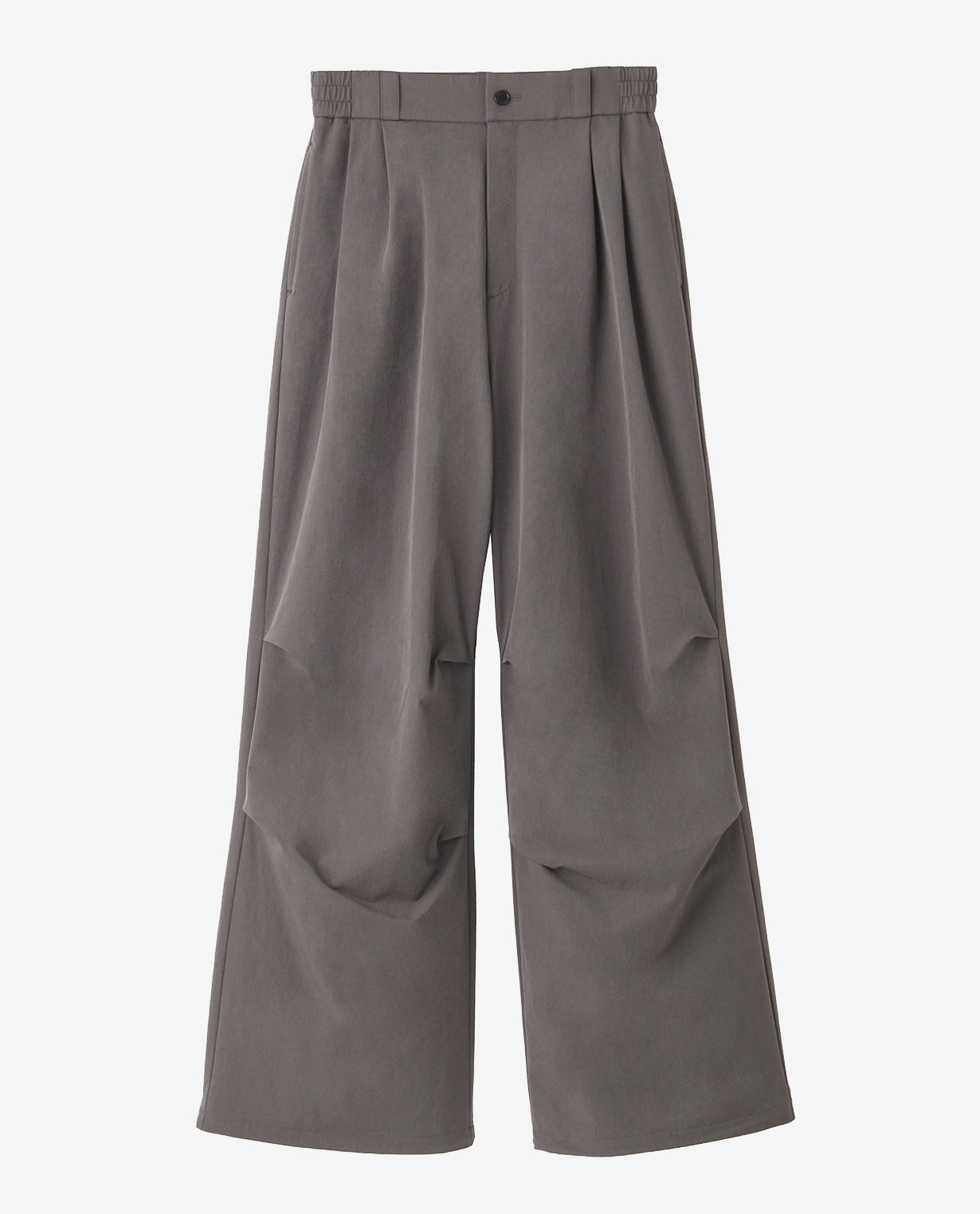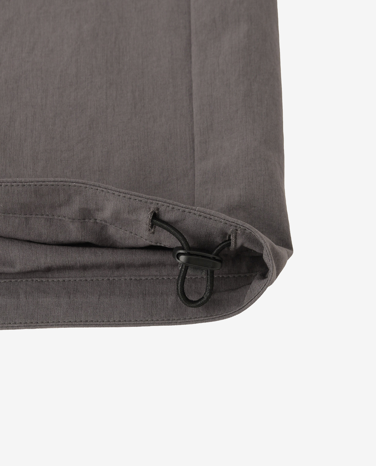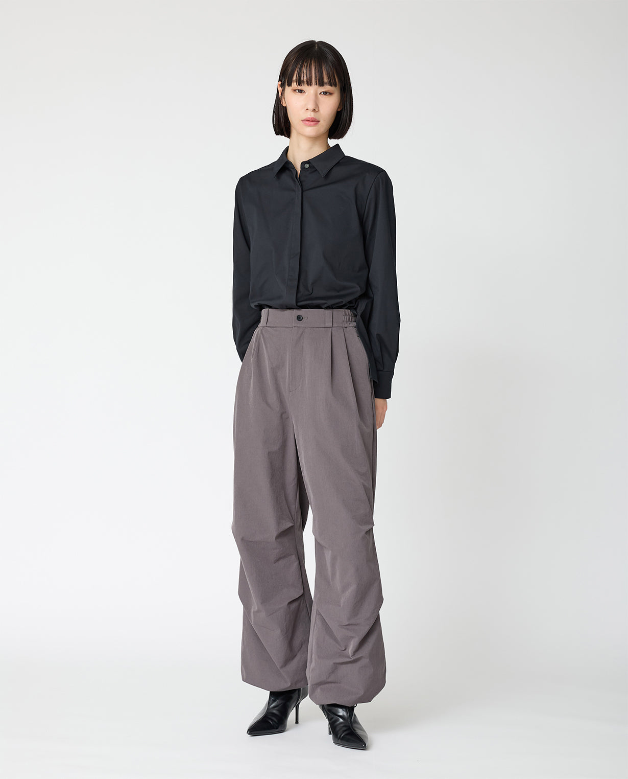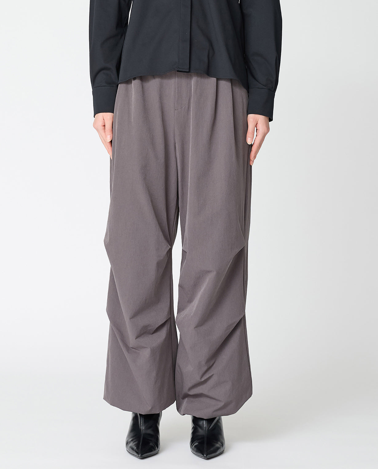 ■ 素材カジナイロンの仮撚加工技術を活かし、収縮率の異なる糸を組み合わせた独自開発のL生地を使用。ストレッチ性と天然素材のような風合いを両立し、微マットな質感と軽やかなハリが特徴です。ドライな肌触りで速乾性にも優れたイージーケア素材です。裏地には赤外線を吸収し蓄熱する特殊ポリマーを練り込んだ蓄熱パイルを使用することで、身体から出る熱を効果的に蓄えてくれるうえ、薄く軽量で肌触りがよく肌寒い時期でも暖かく着用できます。■ デザインウエスト周りはきちんと見えするタックパンツ、脚部はゆったりしたパラシュートパンツのハイブリッドデザインで、全体に暖かな蓄熱パイルの裏地をつけたスタイリッシュな防寒ウェア。ツータックでゆとりのあるフロント、サイドゴムシャーリングのすっきりしたウエストベルトは大人っぽい表情。ワイド目ながらもたつかない程よいパンツ幅に、膝のタックと裾のドローコード仕様でカジュアルさとボリューム感をプラスしており、秋冬の厚手トップスによく合うデザインです。裾のドローコードはスナップ付きのワンタッチループで内側に留めることができ、コードが裾から飛び出すことのない安心設計。天然素材ライクなテクスチャーとシワになりにくいイージーケアで人気の「L生地」を表地に使うことで、防寒パンツながらエレガントさを感じさせる機能的な一着となっています。■ スタイリングコンパクトなニットやブラウスを合わせれば、パラシュートパンツの立体感が引き立つきれいめカジュアルに。ワイドなトップスやアウターと合わせれば、抜け感のあるリラックスモードスタイルも楽しめます。足元はブーツやローファー、ヒールまで幅広く相性が良く、オン・オフ問わず活躍する一本です。■ 同じ生地のアイテムを見るL生地 (WOMEN)